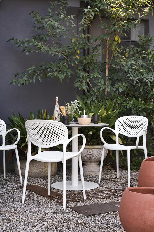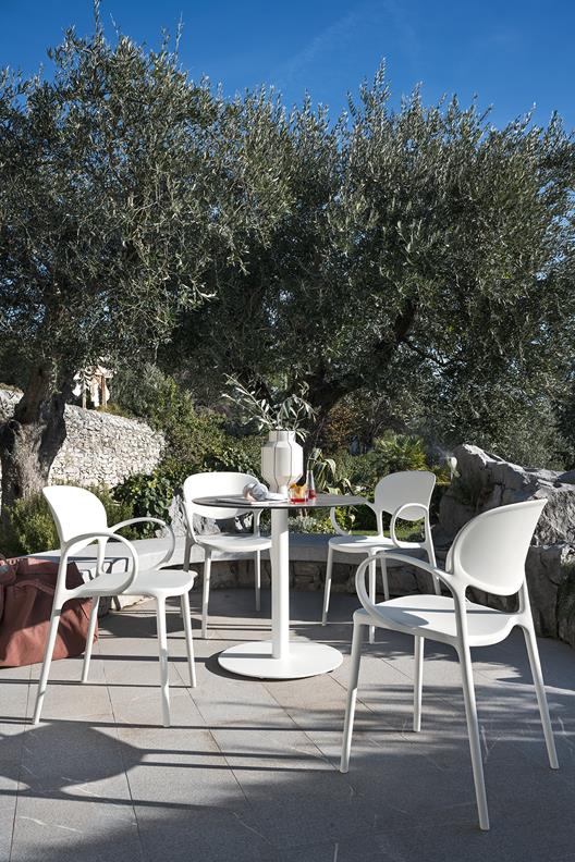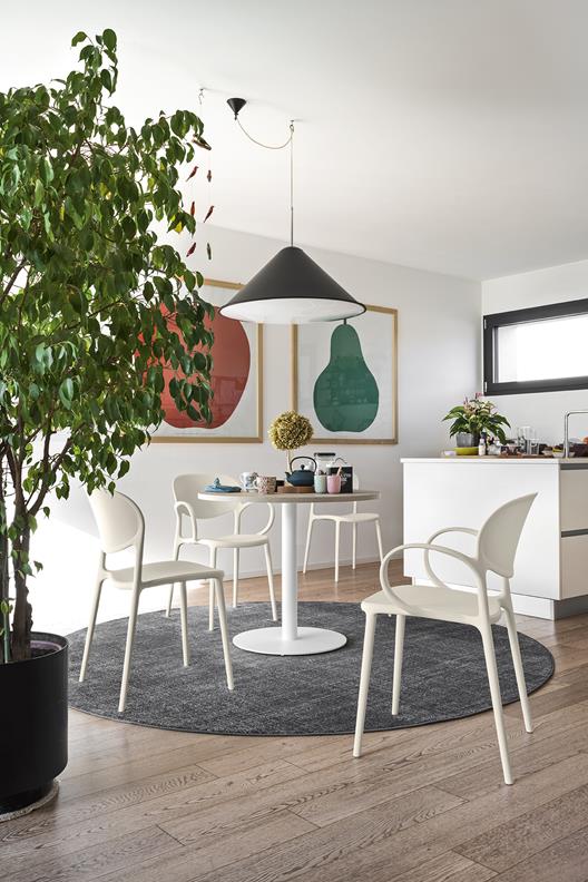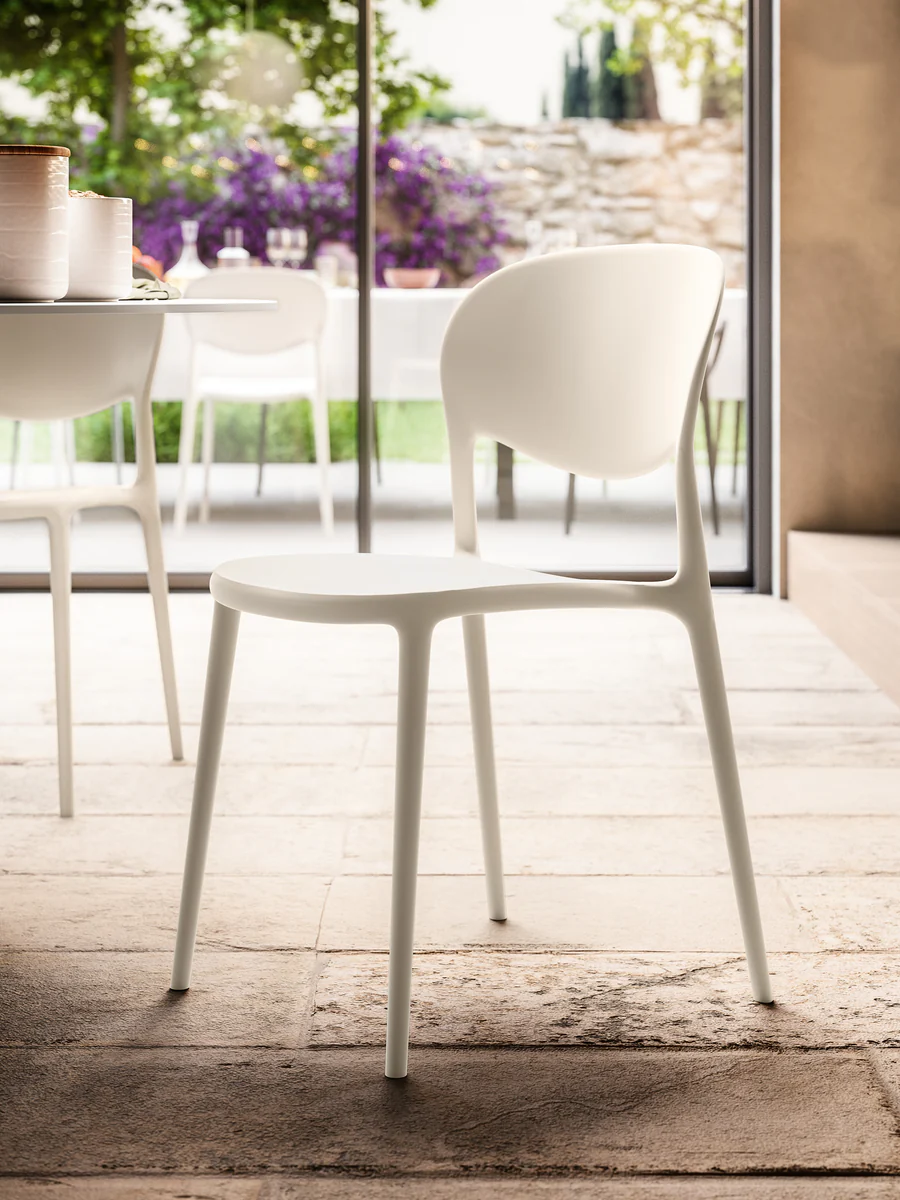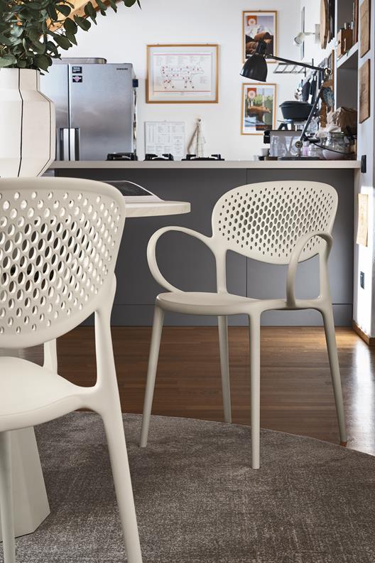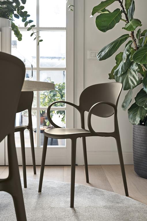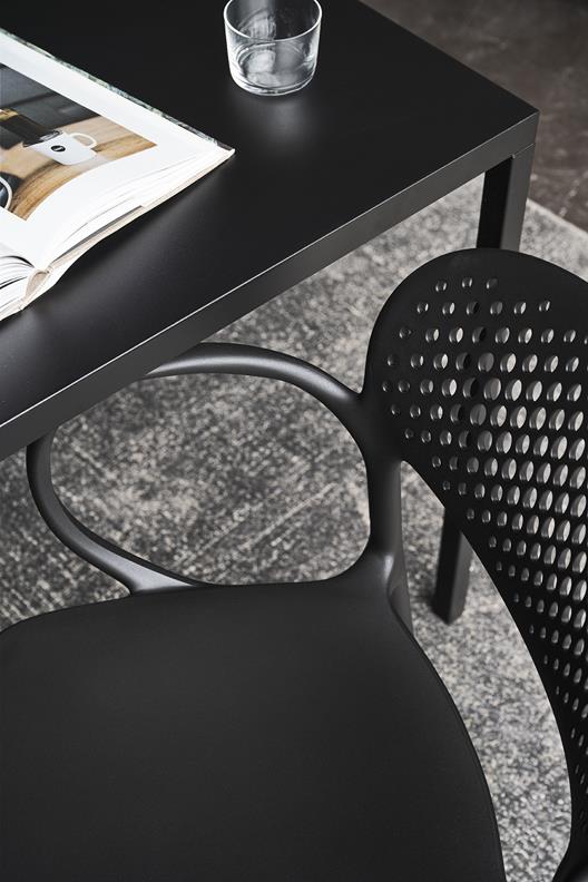 Das von Thonet inspirierte Modell verfügt über ein klassisches Design mit modernen Proportionen, weichen Formen und einem zeitgemäßen Material: 100 % recyceltes Polypropylen. Abby ist als Variante mit oder ohne Armlehnen, sowie mit oder ohne Lochelementen in der Rückenlehne erhältlich.
