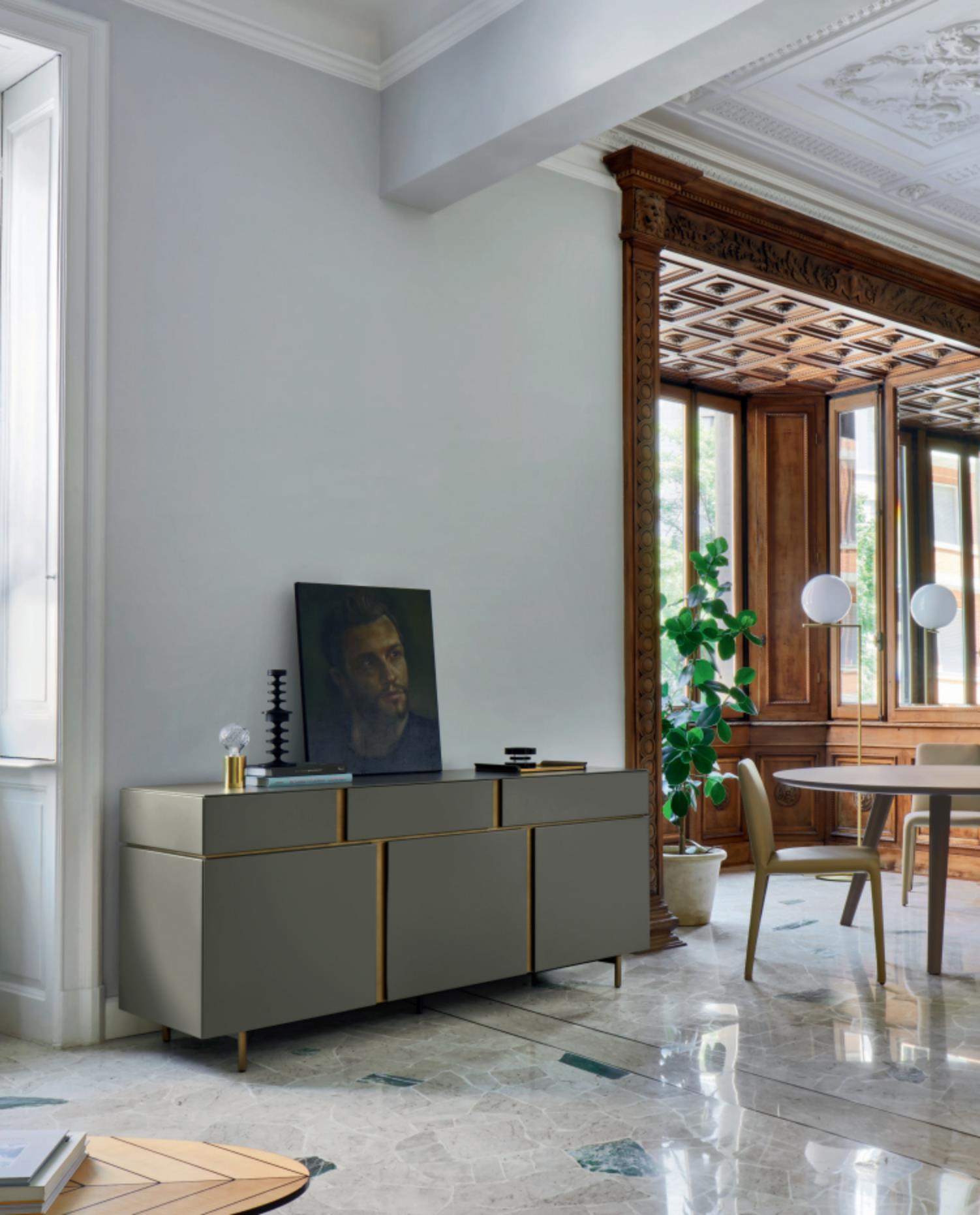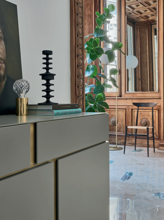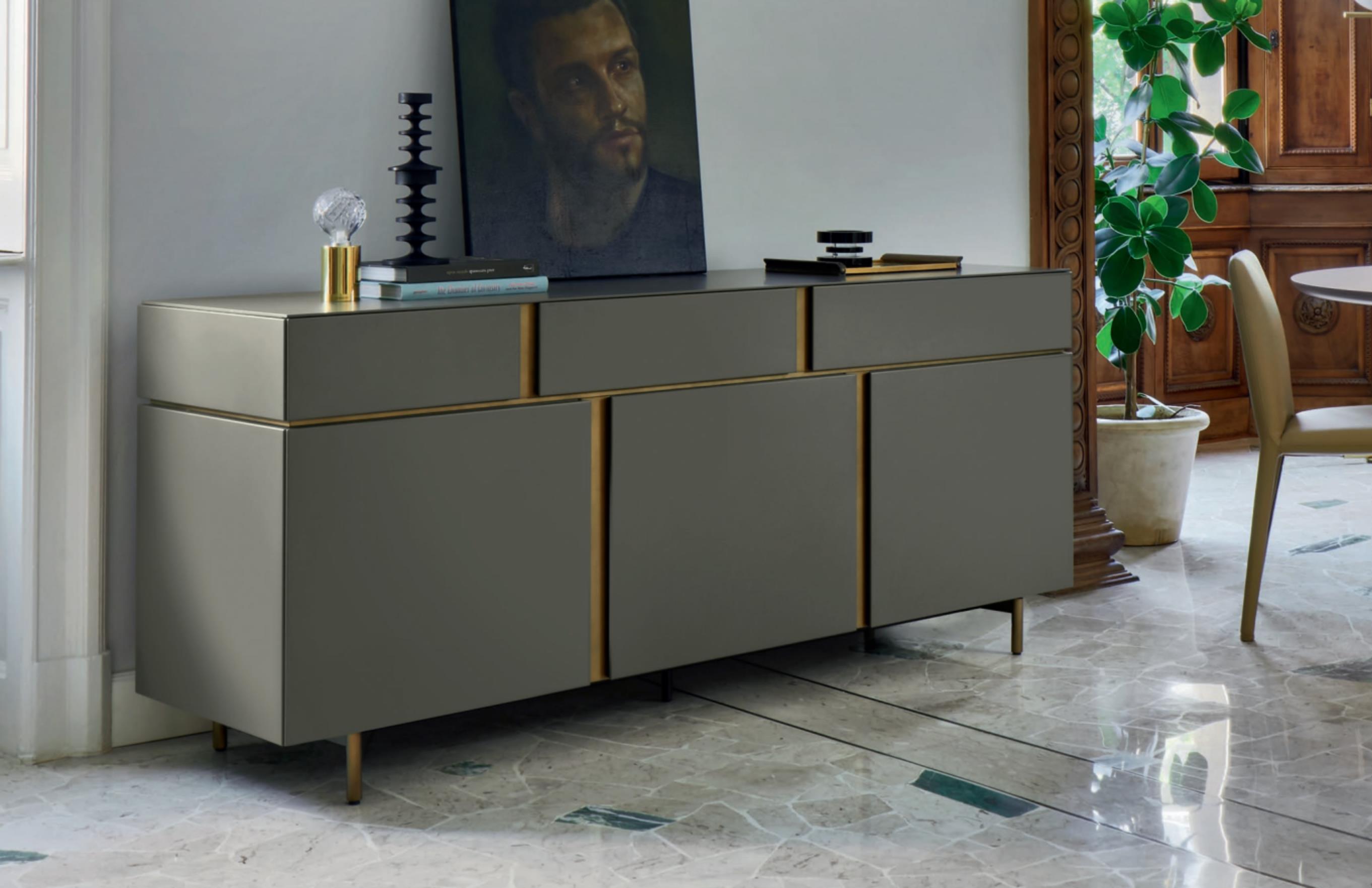 Die tieferliegenden Korpusflächen sind mit elegantem Metalllack in Messing gestaltet, ebenso die zylindrischen Füße, welche dem Ganzen eine kostbare Note hinzufügen und harmonisch zu den matt lackierten Oberflächen in Salvia passen.