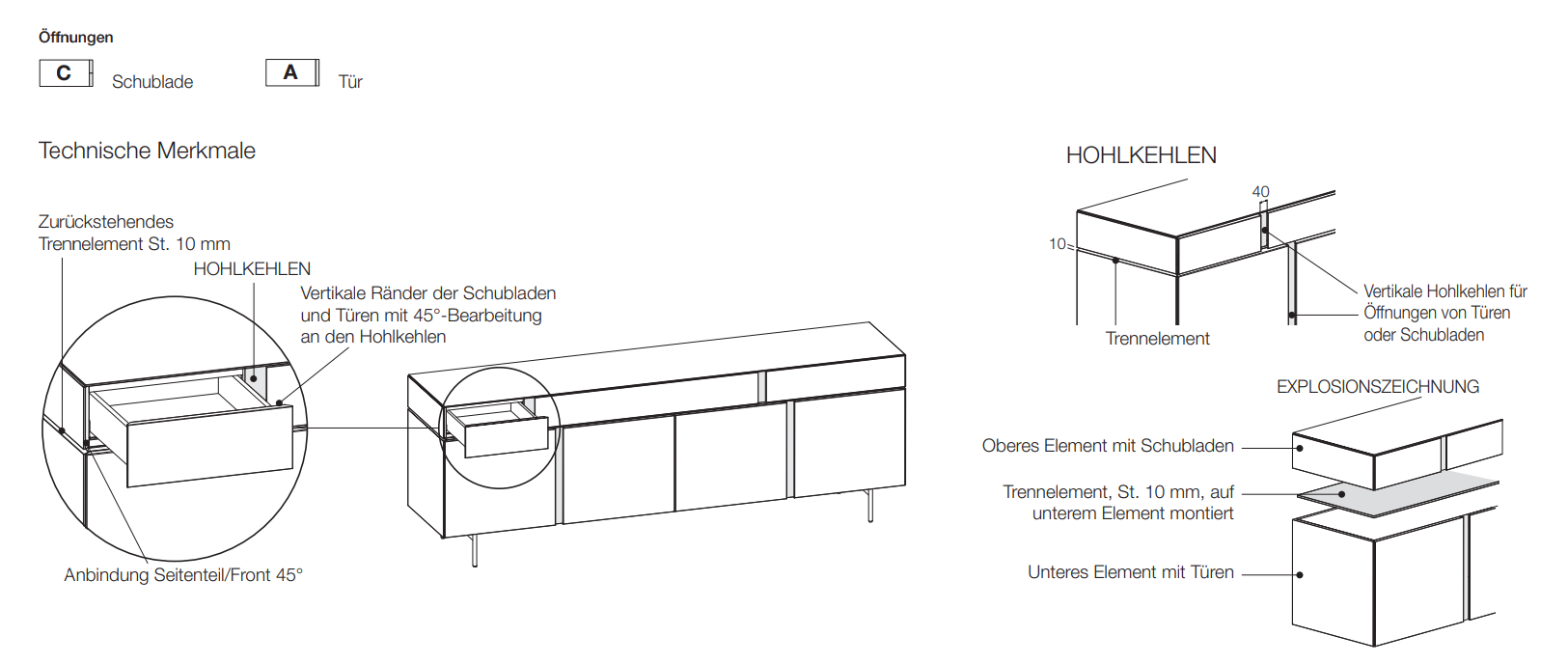 Außerdem kann das Sideboard mit folgenden Details ausgestattet werden:
