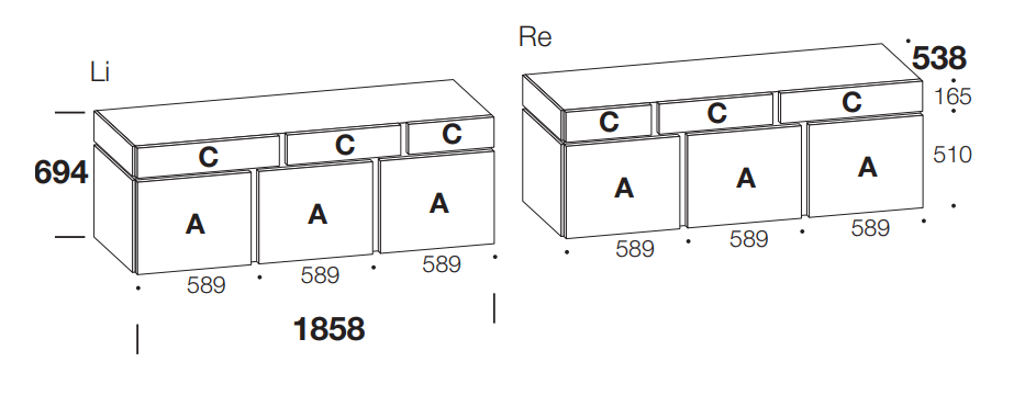 Adamo medium ist eine Kombination von Schubladen und Türen, die eine Beziehungen zwischen Linien und Oberflächen die eine originelle Wirkung entfalten.