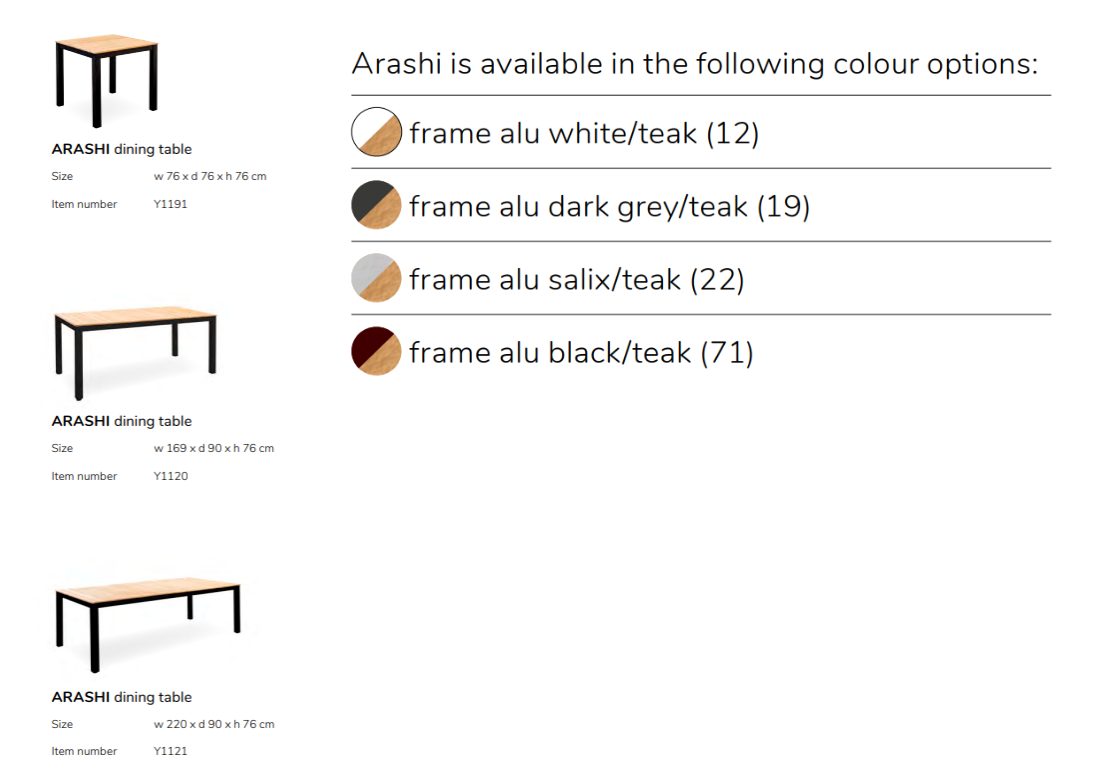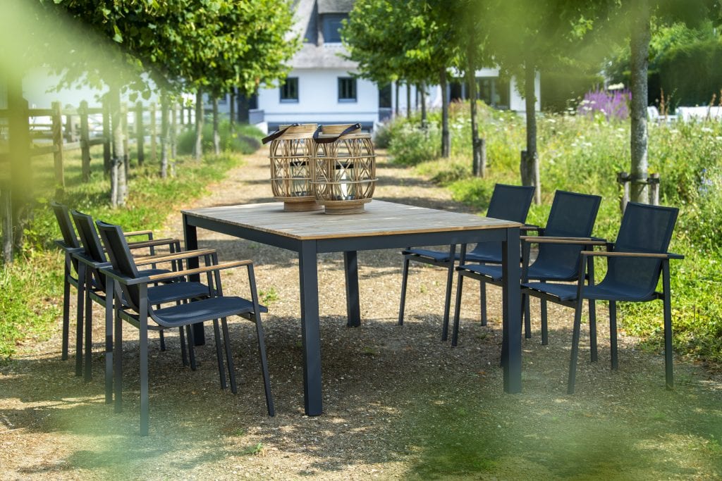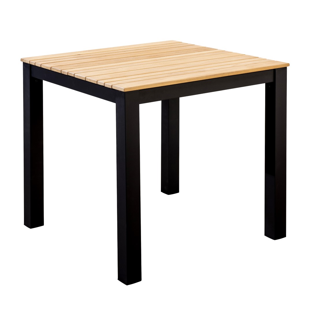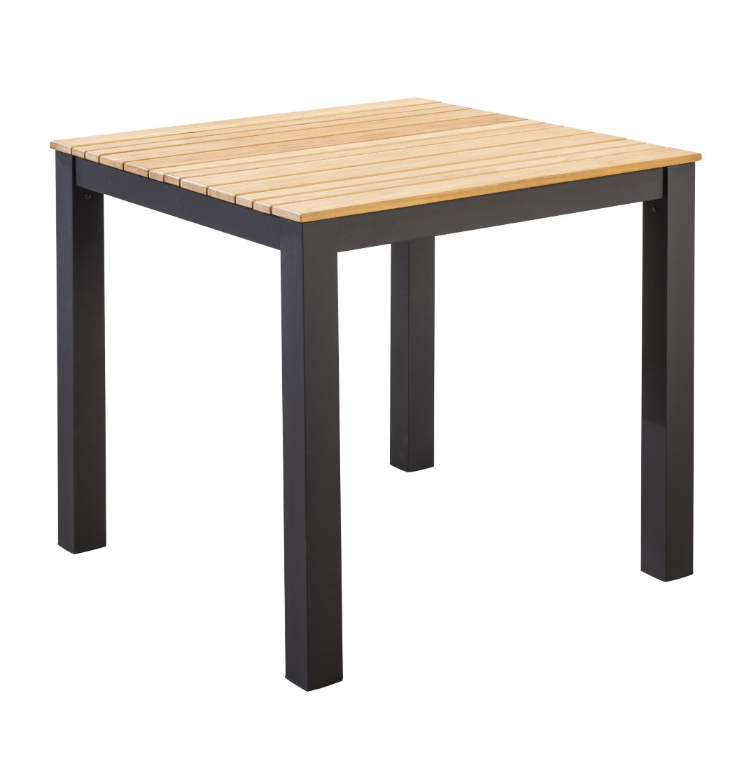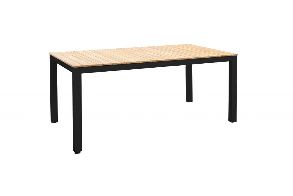 Die Tischplatte aus Teakholz verleiht dem Arashi Tisch eine natürliche und zeitlose Ästhetik, während das pulverbeschichtete Aluminiumgestell für Robustheit und Langlebigkeit sorgt.