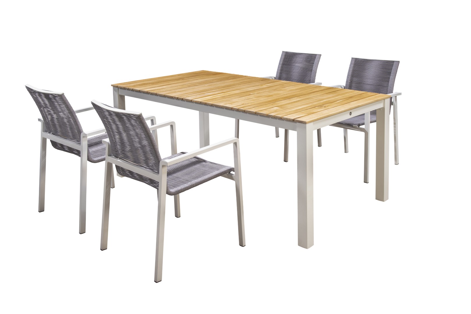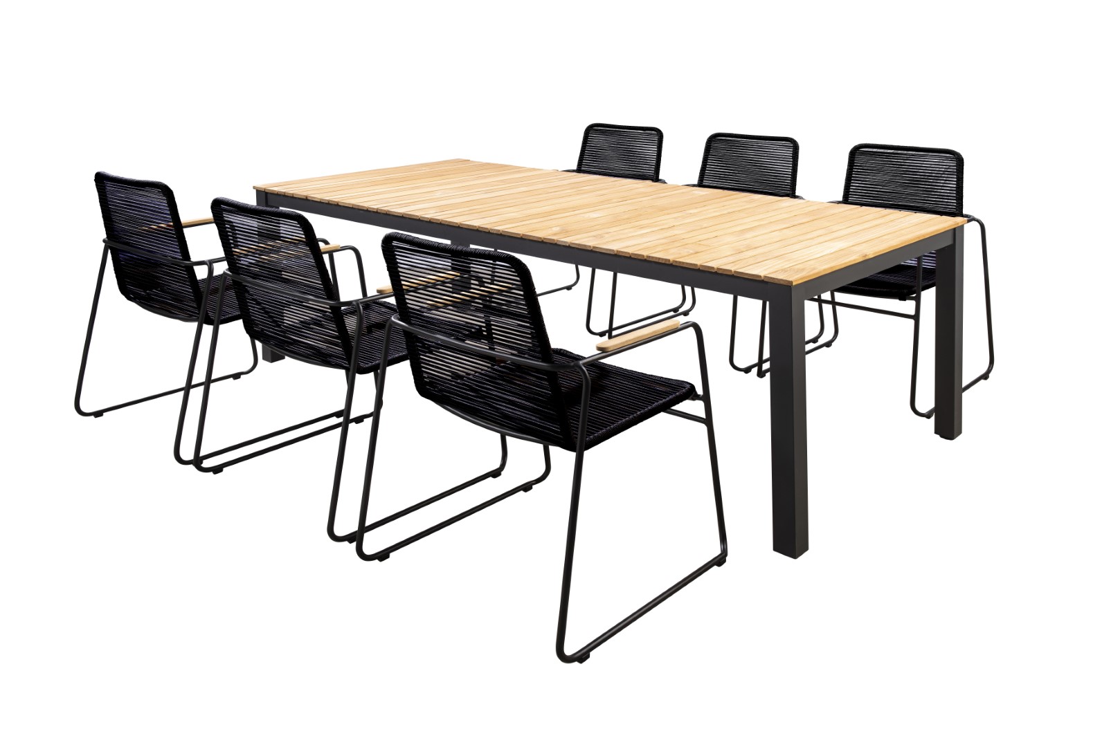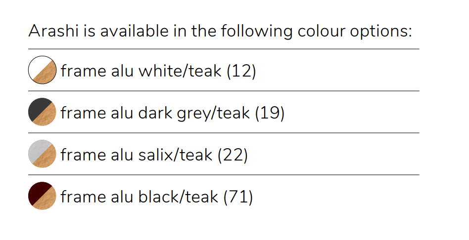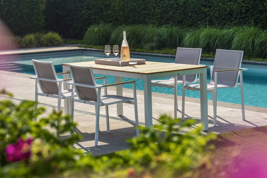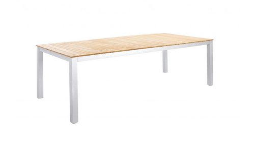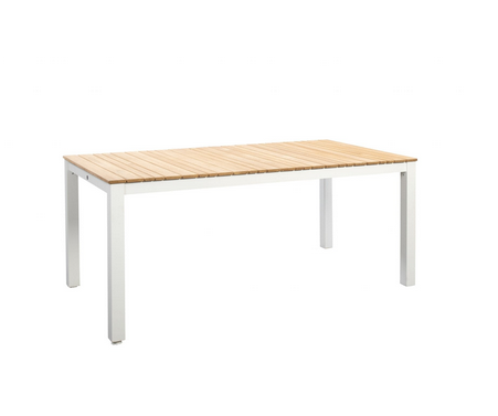 Die Tischplatte aus Teakholz verleiht dem Arashi Tisch eine natürliche und zeitlose Ästhetik, während das pulverbeschichtete Aluminiumgestell für Robustheit und Langlebigkeit sorgt.