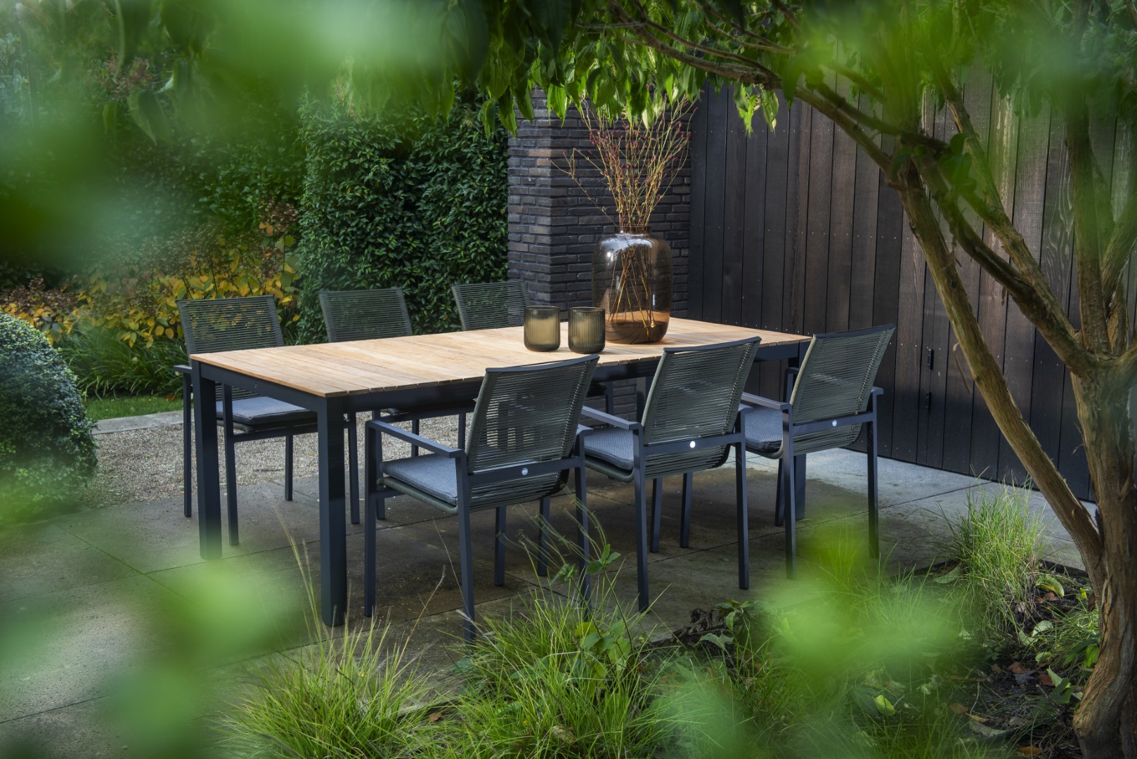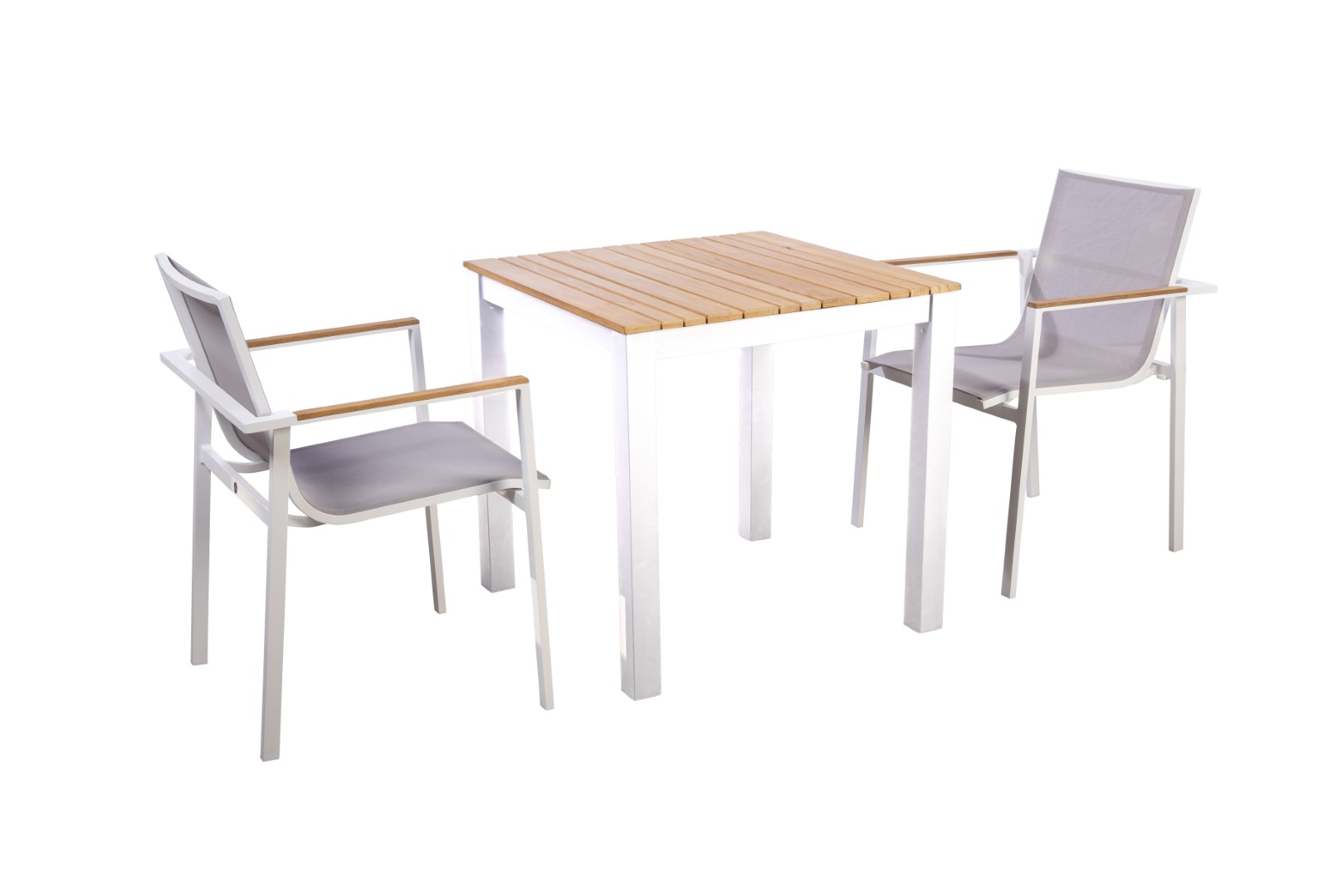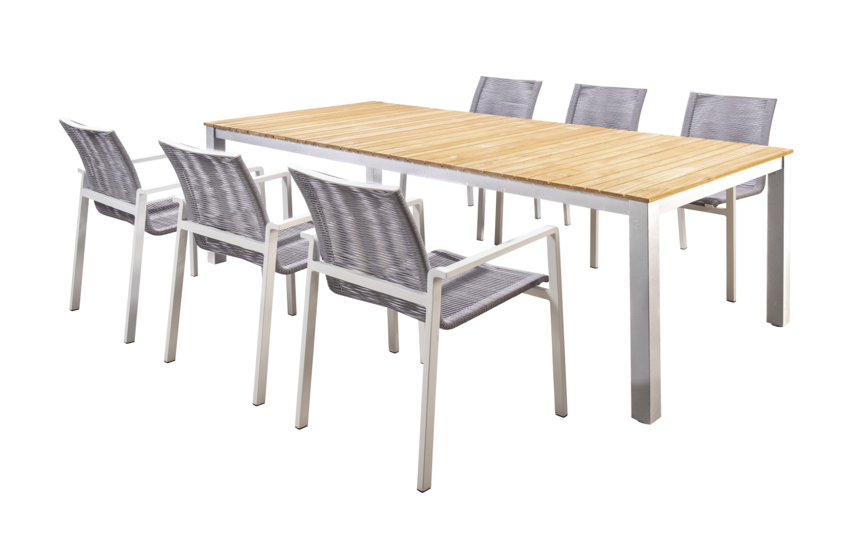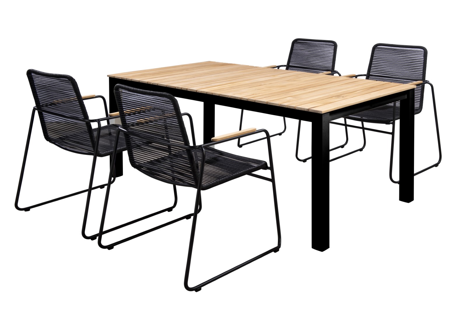 Die Tischplatte aus Teakholz verleiht dem Arashi Tisch eine natürliche und zeitlose Ästhetik, während das pulverbeschichtete Aluminiumgestell für Robustheit und Langlebigkeit sorgt.
