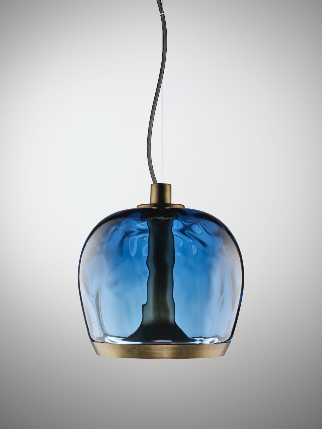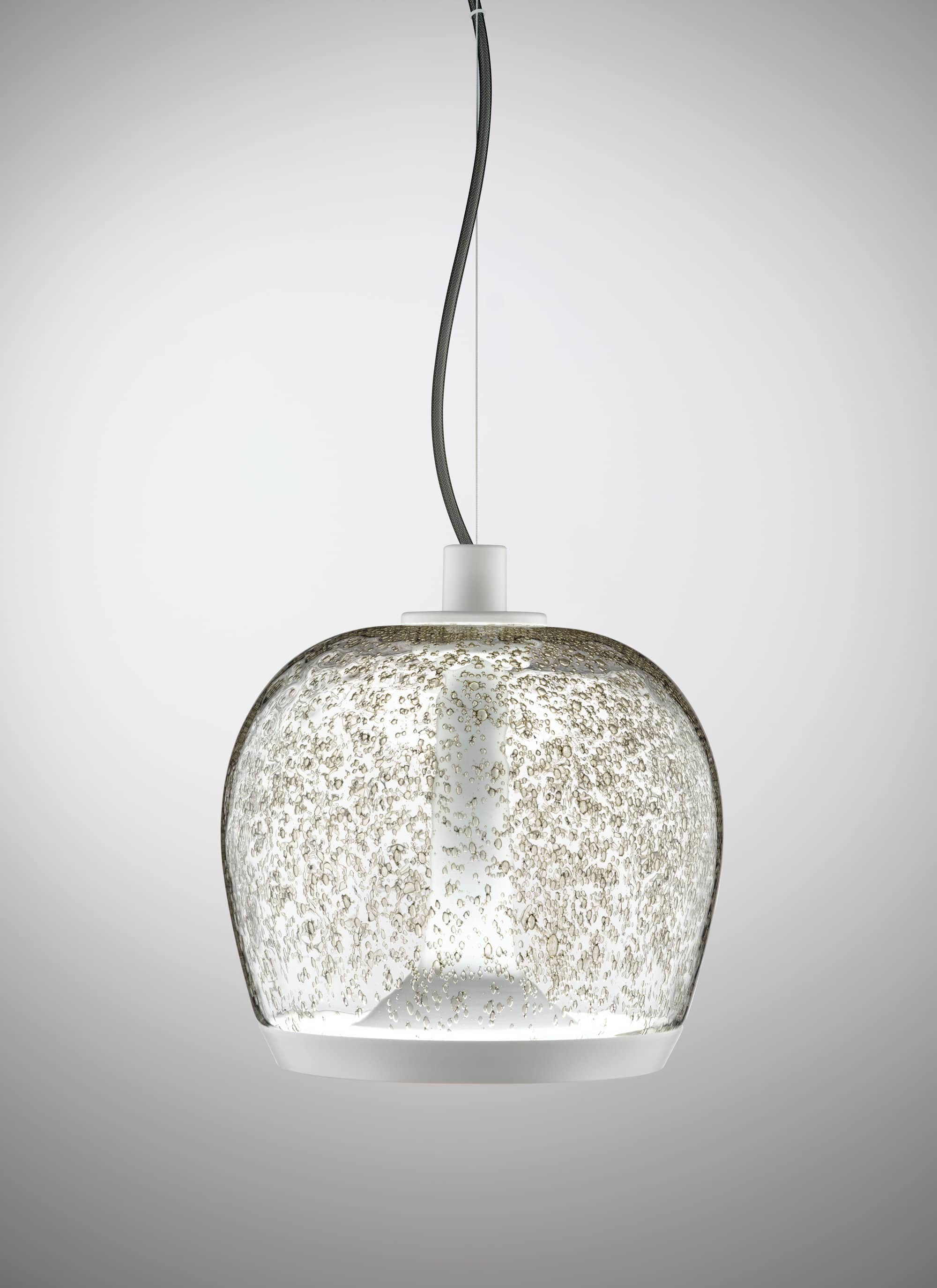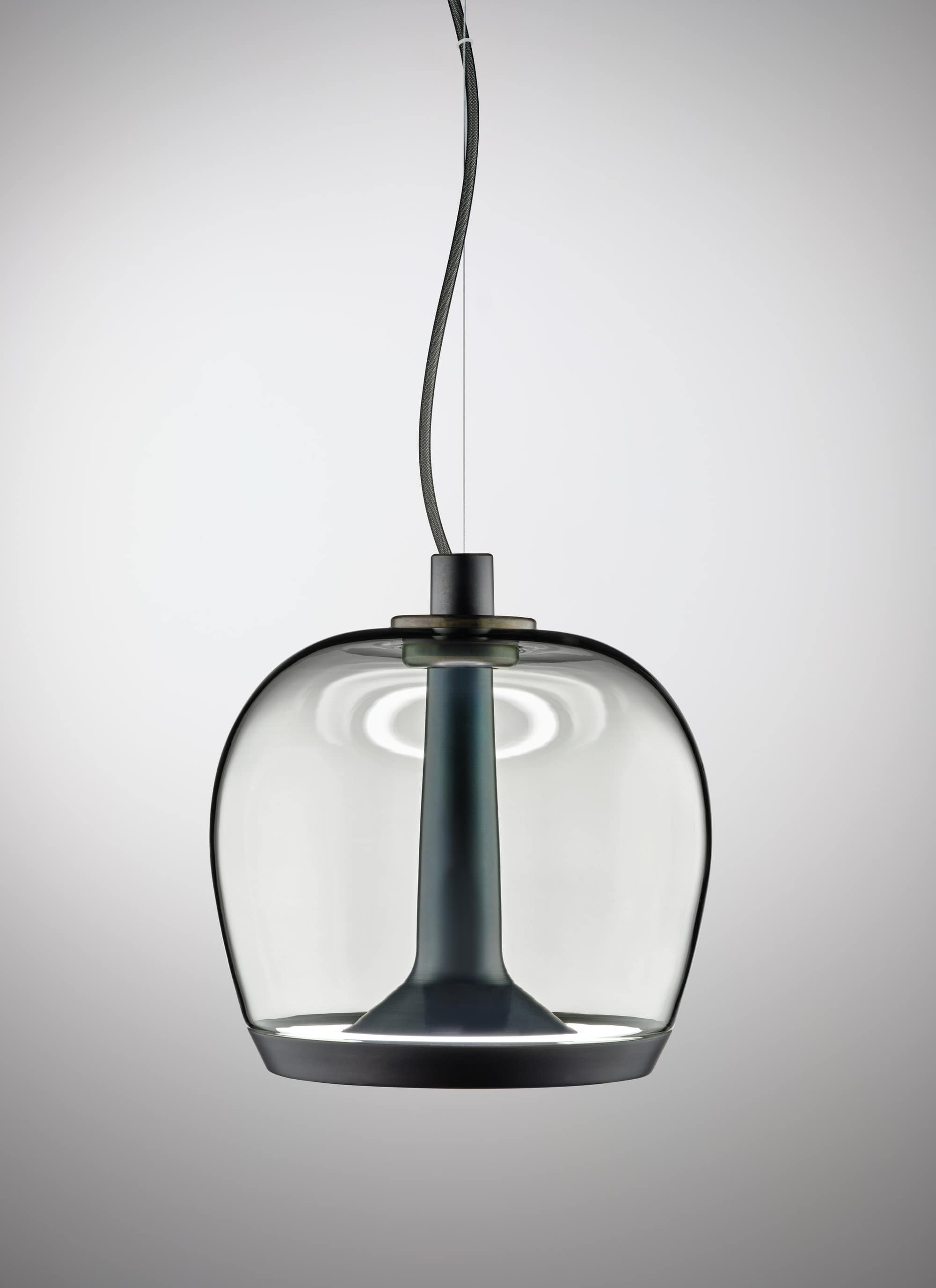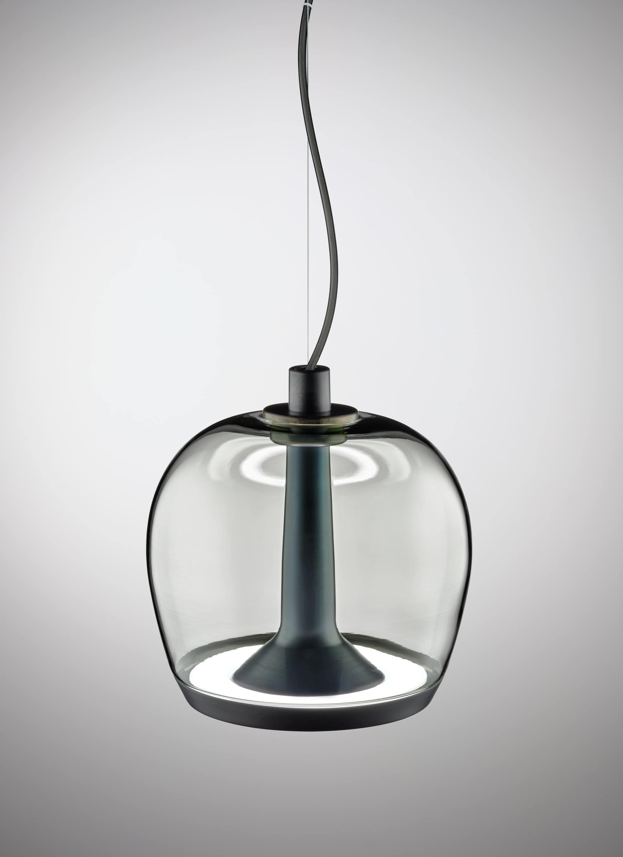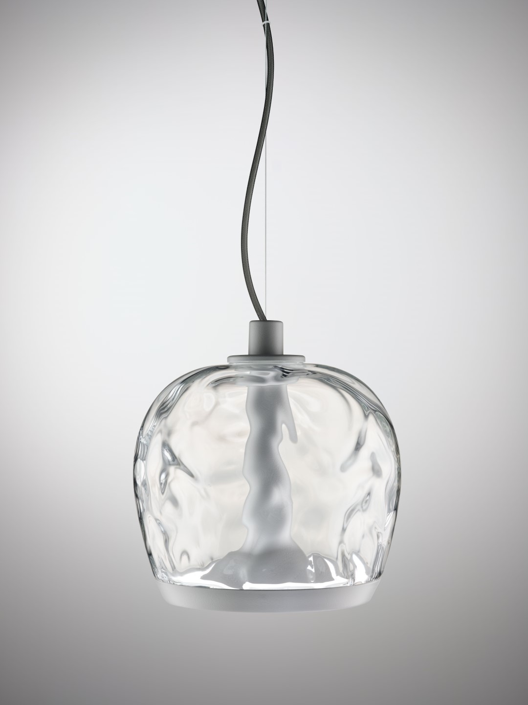 Der Diffusor aus mundgeblasenem Glas umhüllt die Metallstruktur, die zwei LED-Lichtquellen beherbergt. Die beiden Lichtquellen bieten die Möglichkeit der gleichzeitigen Schaltung (direkt + indirekt) dimmbar, welche sowohl direktes, weiches Licht, als überraschende und unerwartete indirekte Reflexionen kreieren kann.