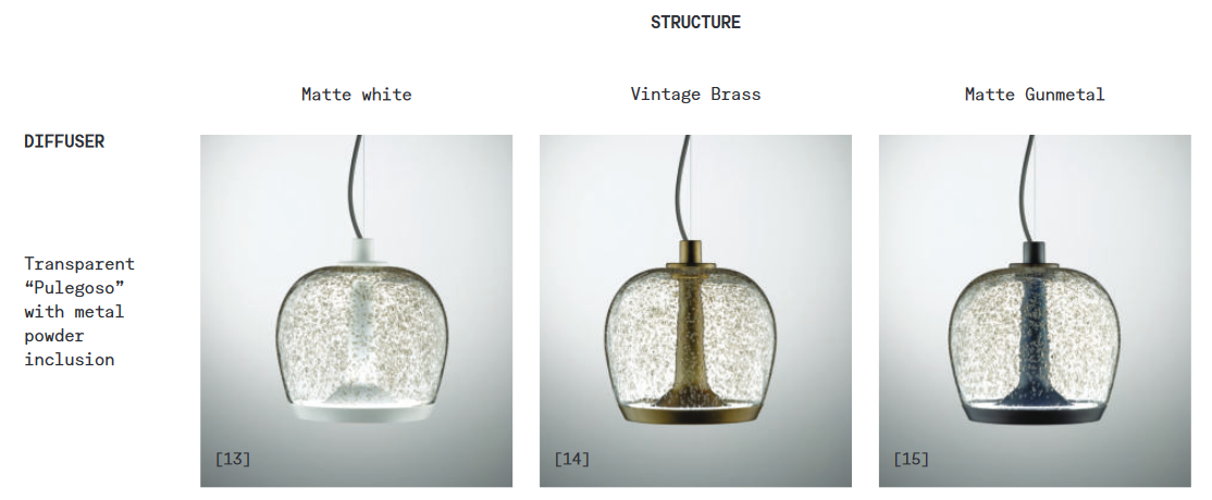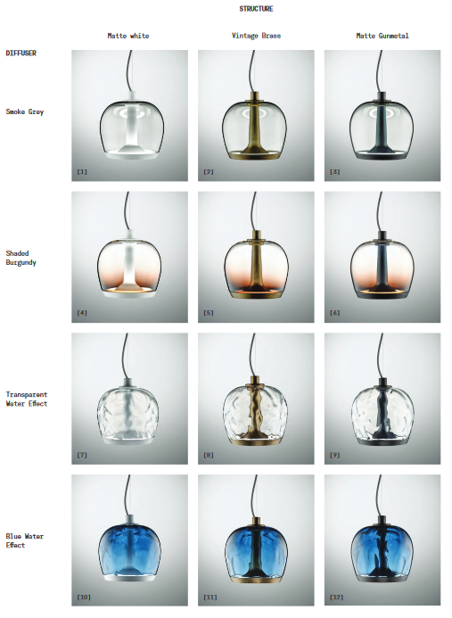 Aurelia ist in zwei verschiedenen Formen und Größen (Aurelia und Aurelia Bold) und sechs Kombinationen von Glasfarben und Metallstrukturen mit passendem Baldachin erhältlich. Das LED-Leuchtmittel kann vom Benutzer leicht ausgetauscht werden. Ein intelligentes Demontagesystem ermöglicht eine einfache Wartung und Reinigung des Glasdiffusors.