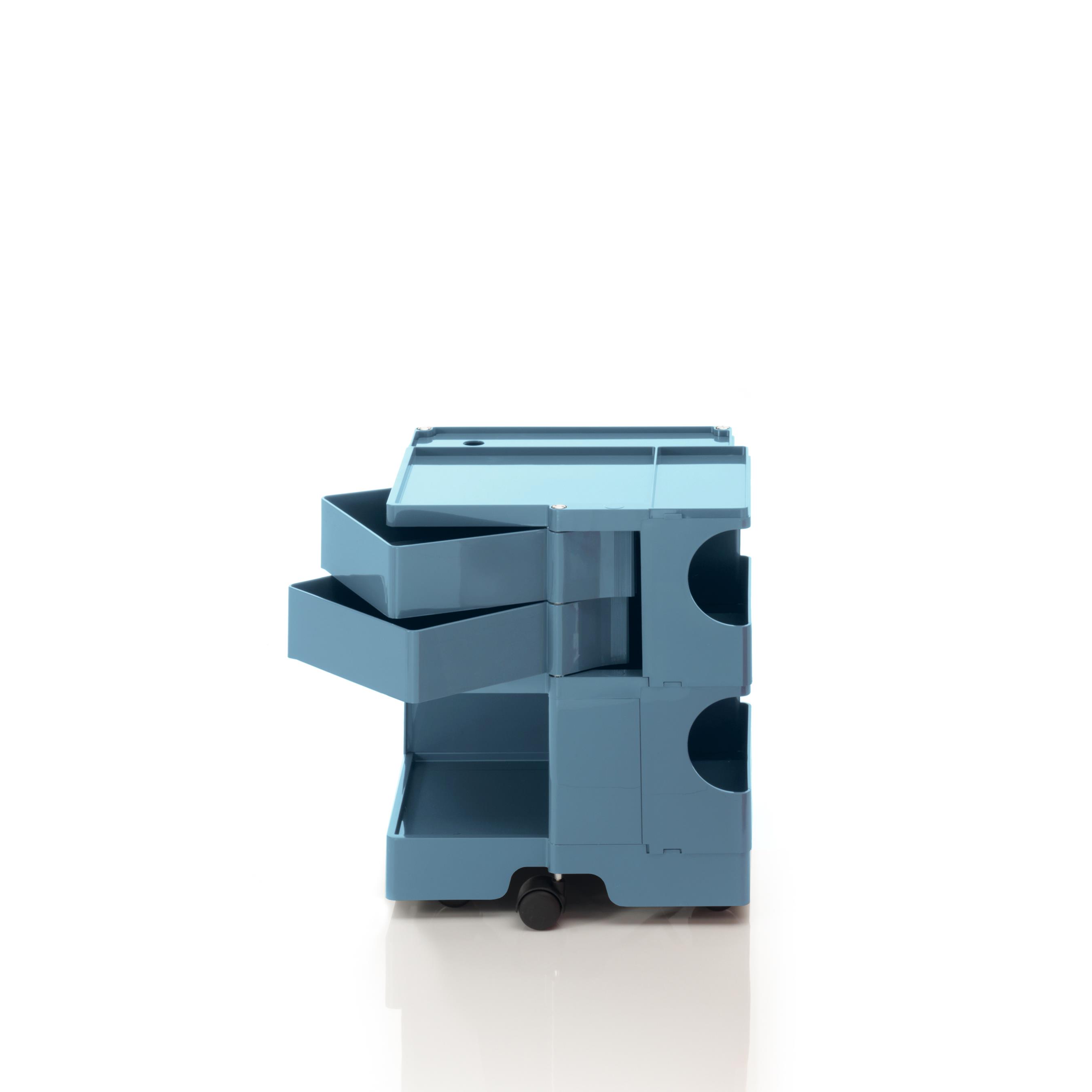 Boby S - Der Klassiker unter den Trolleys mit zahlreichen Schub, Ablage- und Stellfächern wurde 1970 vom Designer Joe Colombo für B-Line entworfen. Eine schöne und praktische Lösung für alle Bereiche in denen Ordnung gebraucht wird, ob Kleinteile oder Papiere im Haushalt, in der Werkstatt oder im Büro. Das Gestell aus ABS-Kunststoff bestehend aus Modulen mit Schubfächern und Böden fährt auf 5 frei drehenden Rollen und bietet 4 verschiedene Höhenausführungen. Teil der ständigen Kollektion des MoMA in New York und der Triennale in Mailand, Smau-Preis 1971.