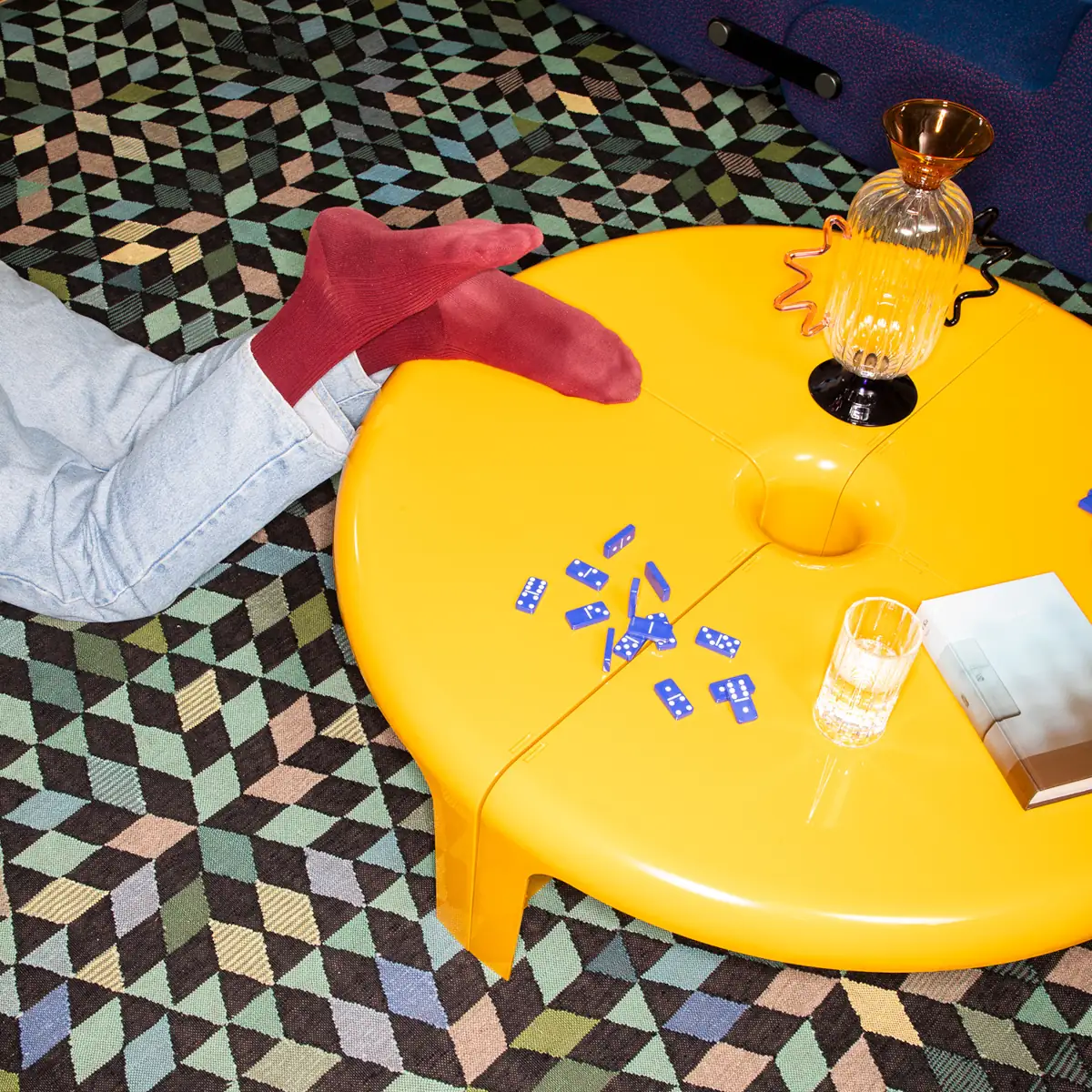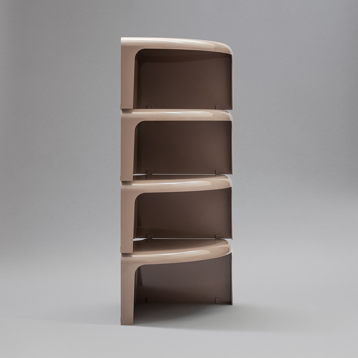 Vier gleiche Elemente, die dank speziellen Einlässen neben- oder übereinander angeordnet werden können, um einen Kaffeetisch oder modulare Bücherregale zu bilden. Aus spritzgegossenem ABS-Kunststoff gefertigt.