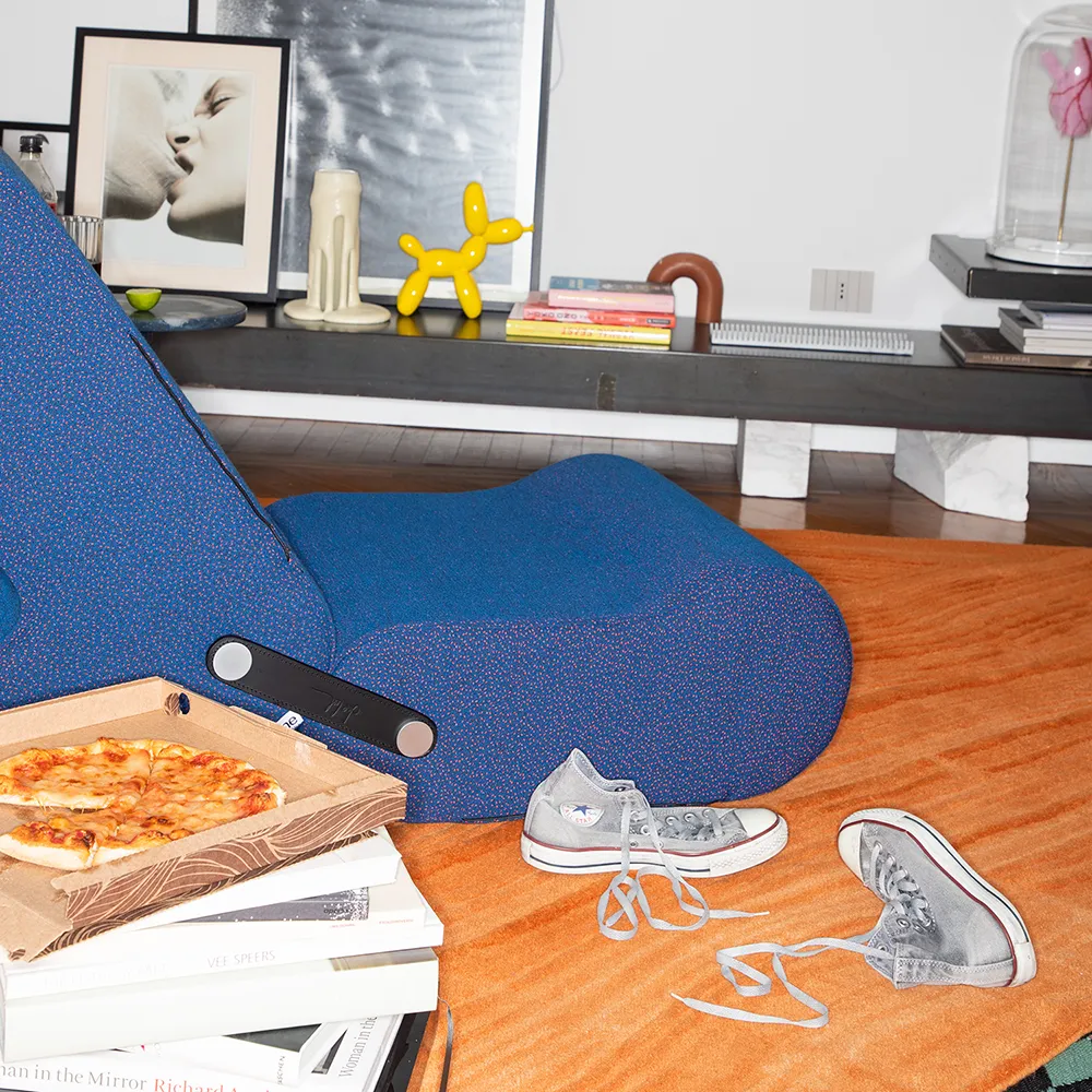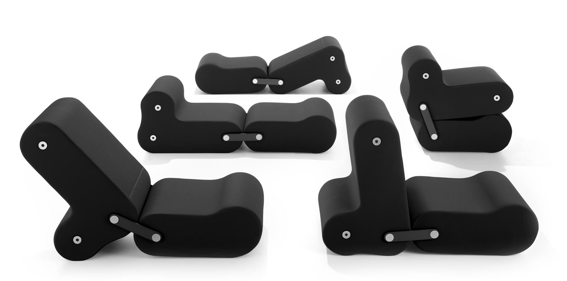 Multichair – Stuhl, Sessel zum Plaudern oder zum Entspannen – wird dank der beiden verschiedenen Elemente, aus denen er sich zusammensetzt und die auch einzeln verwendbar sind, zu einem Transformationssystem. Die Kissen besitzen ein Stahlgestell, das mit Polyurethanschaumstoff gepolstert und mit elastiziertem Stoff bezogen ist, während das Spiel mit den Formen durch zwei verstellbare Lederriemen und Buchsen aus chromsatiniertem Stahl entsteht. Teil der ständigen Kollektion des MoMA und des Metropolitan Museum of Art in New York.
