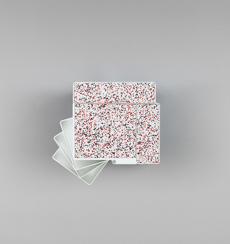 Als Schubladenelement mit wandelbarem Look und nahezu organischem Anschein verfügt Spinny über eine Reihe von Schubkästen, die sich um bis zu 180 Grad um die Achse drehen lassen. Die Schubkästen aus spritzgegossenem ABS-Kunststoff gibt es in drei verschiedenen Höhen. Der Standfuß und das Gestell sind aus lackiertem Stahl gefertigt, die frei drehenden Rollen aus Polypropylen. AusführungGestell - lackierter Stahl: aluminiumfarbenSchubfächer - ABS Kunststoff: weiß, rot oder tornadograuMaßeBreite 71 cmHöhe 126 cmTiefe 71 cmGewicht 30,1 kg Materiallackierter StahlABS Kunststoff