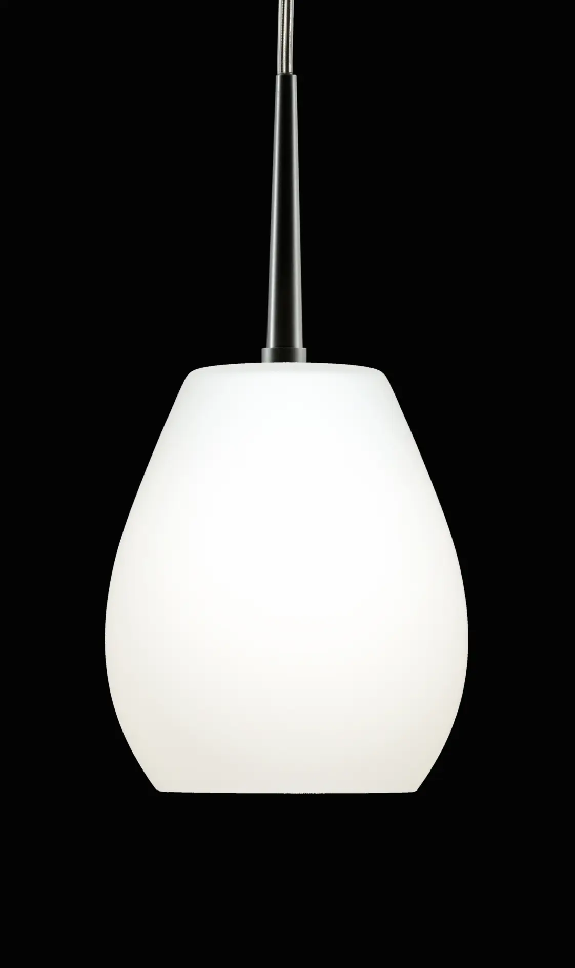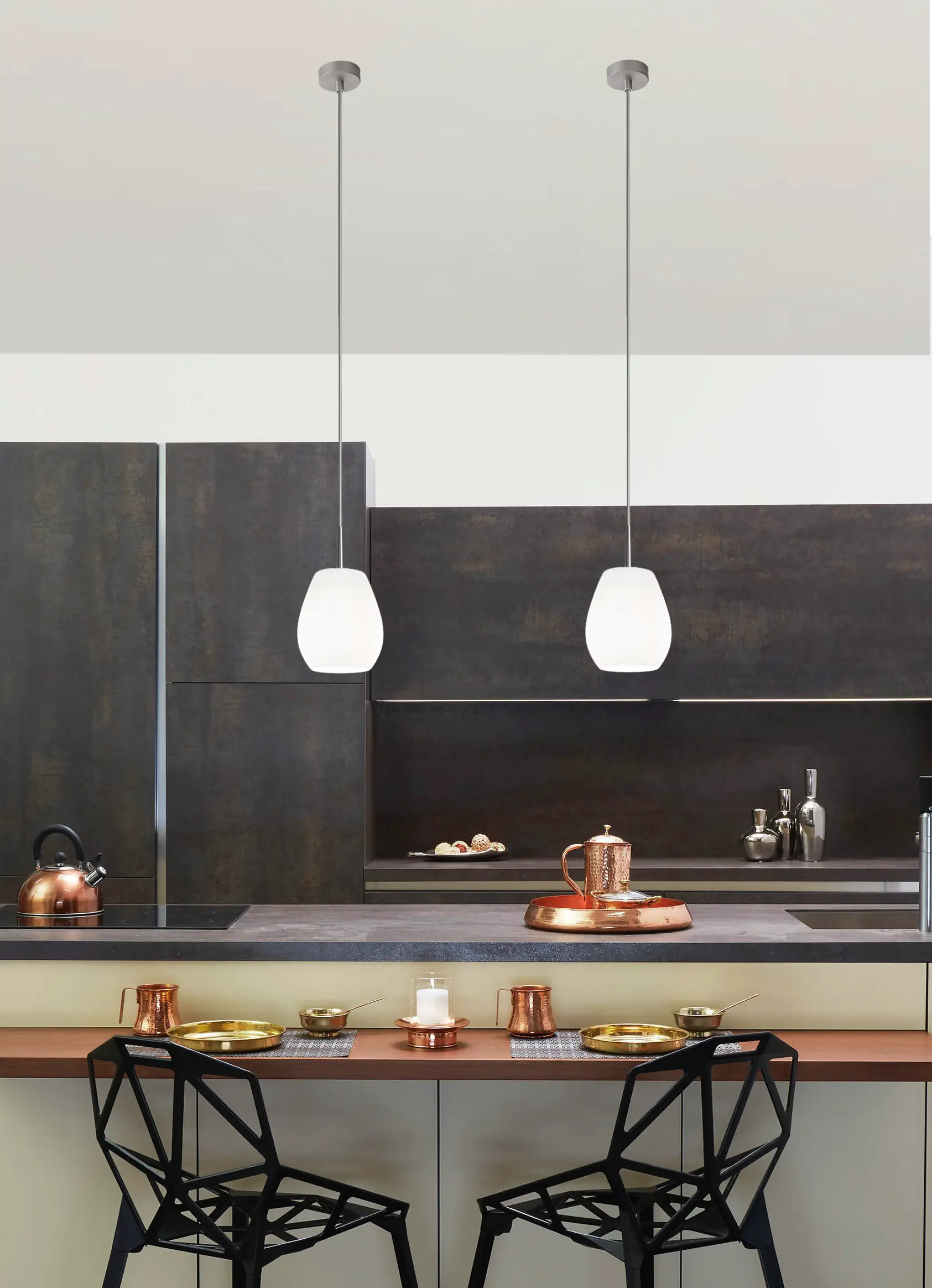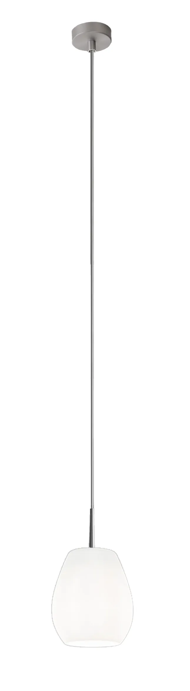 Pendelleuchte Bagan mit Armatur aus handgebürstetem Aluminium, Kabelpendel und Schirm aus mundgeblasenem Glas.