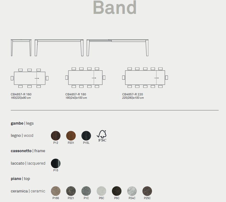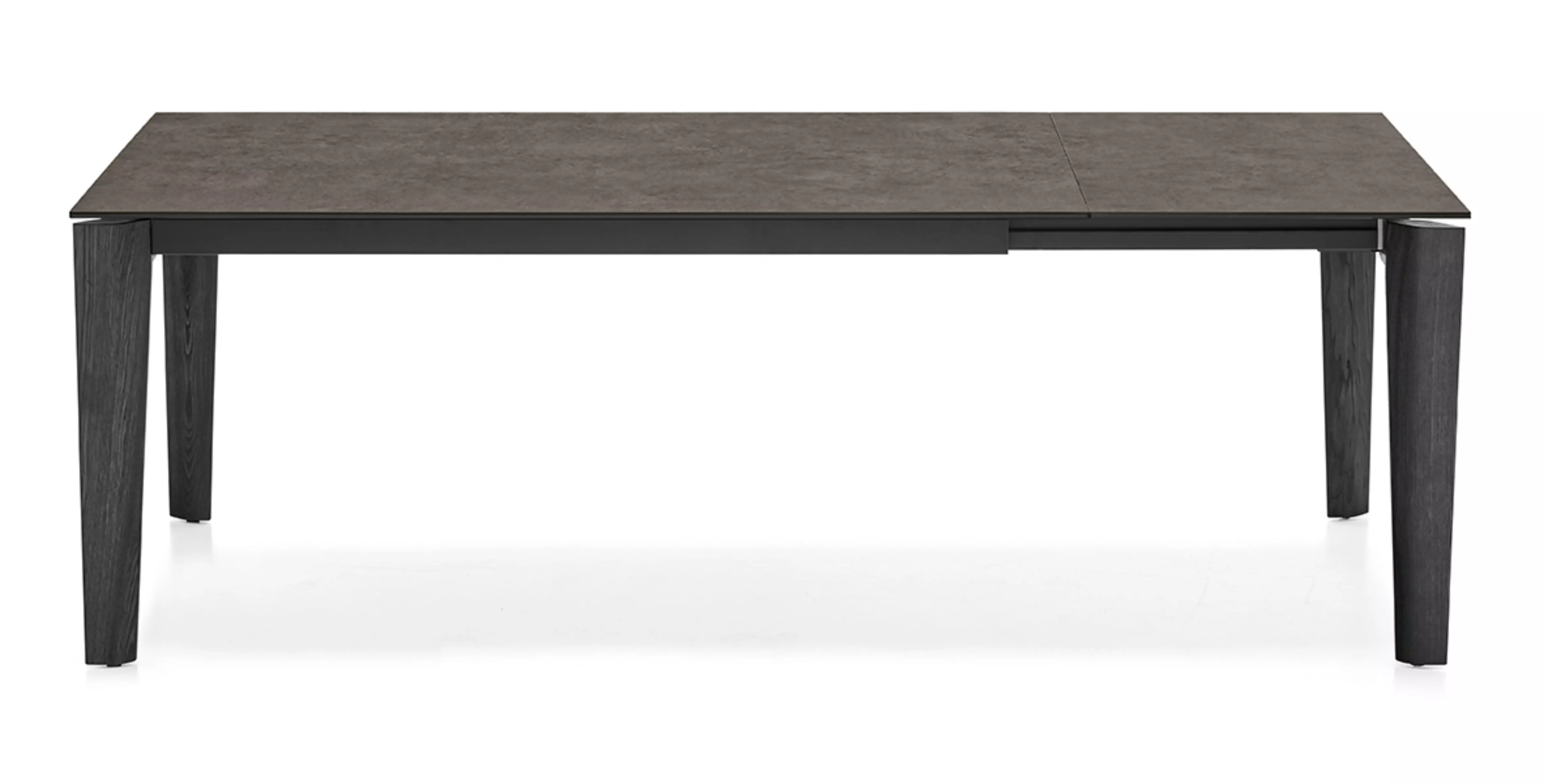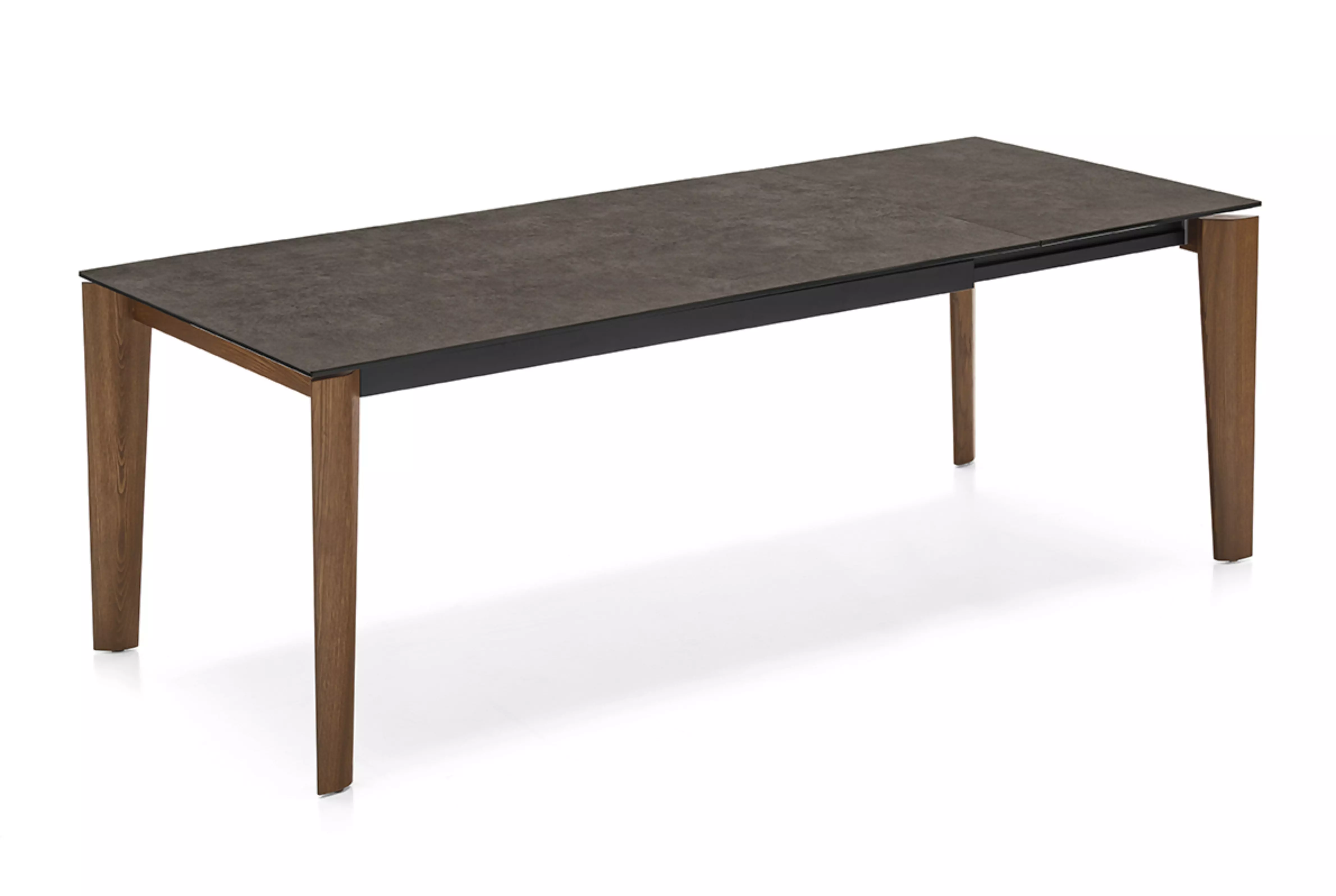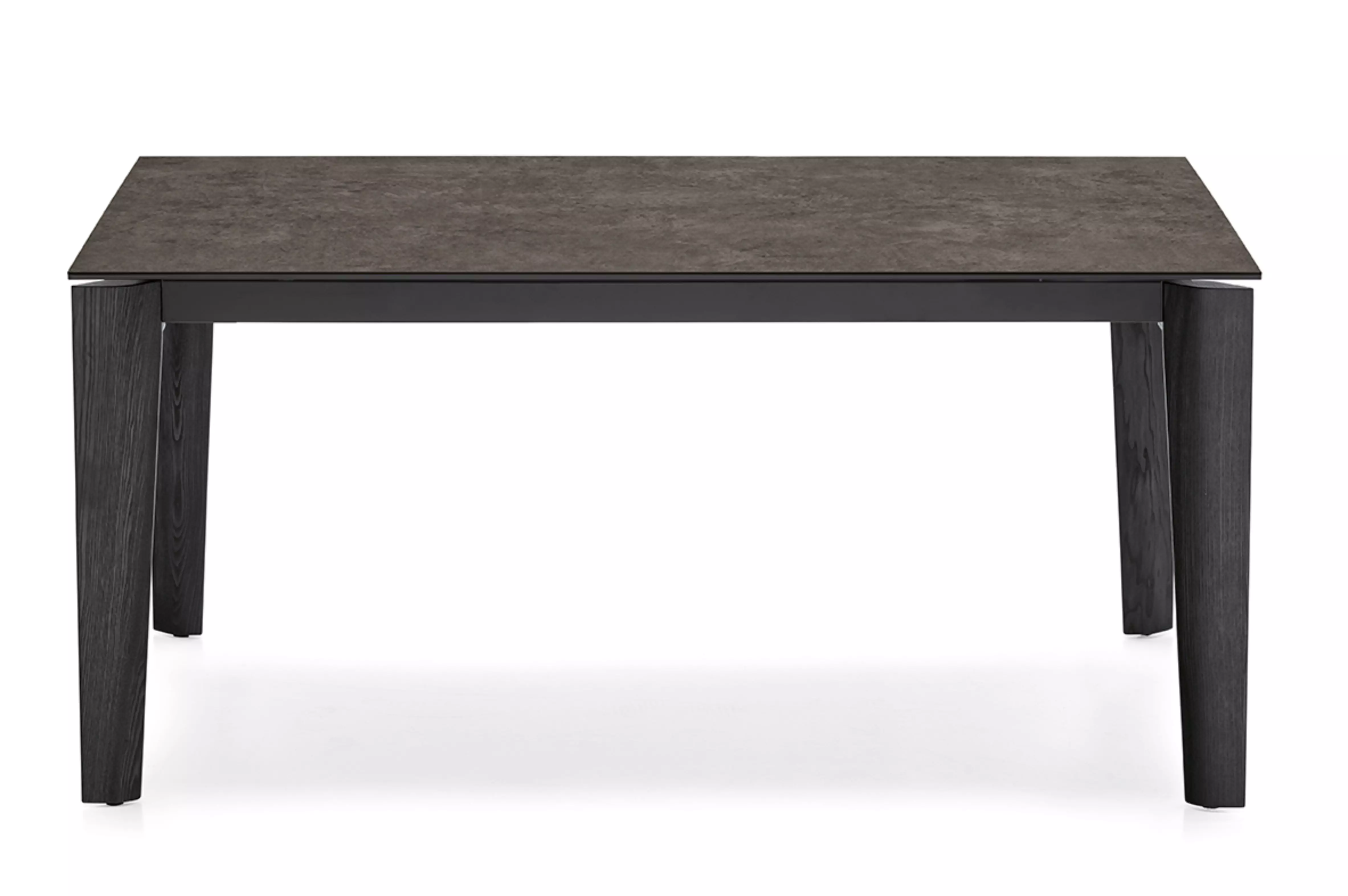 Das stabile Gestell ist aus Massivholz gefertigt. Die hochwertige Tischplatte wird in acht Keramikfarbe angeboten.