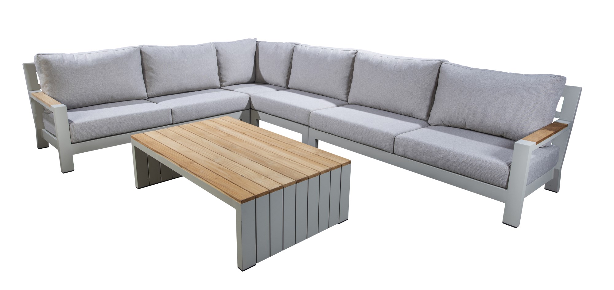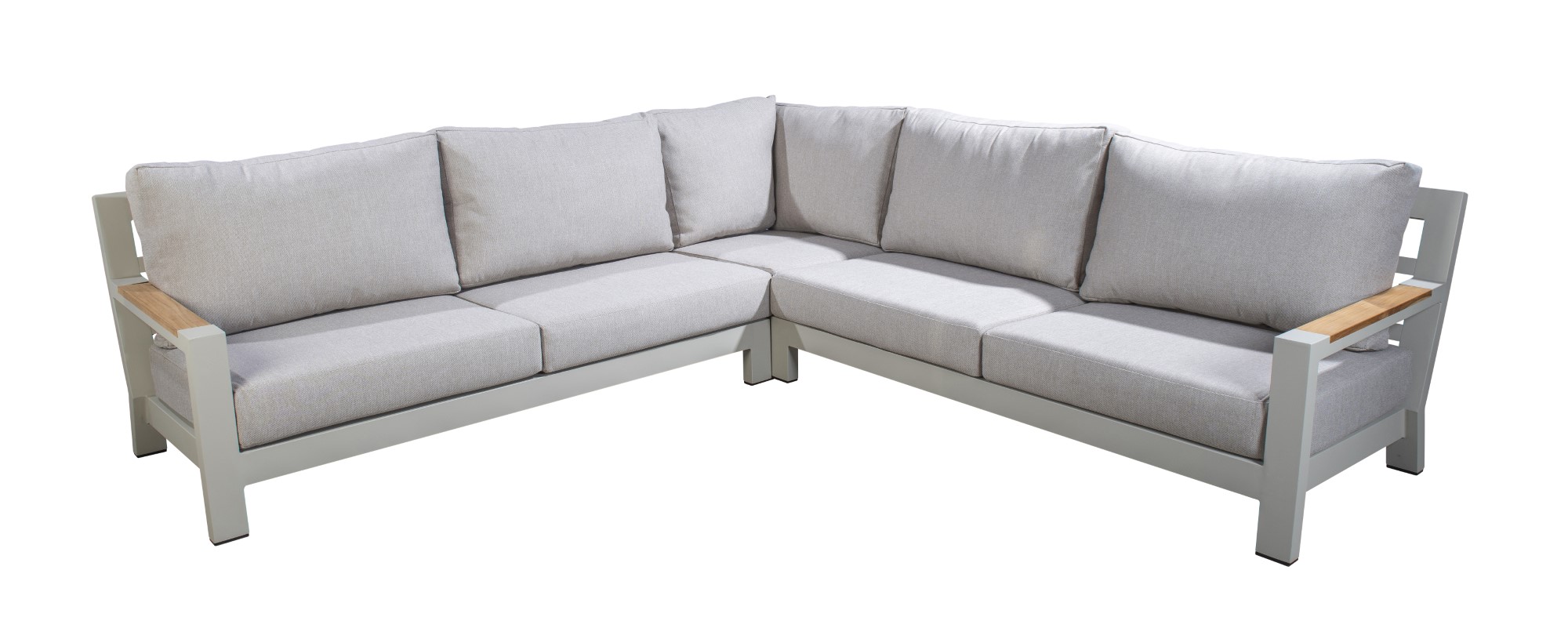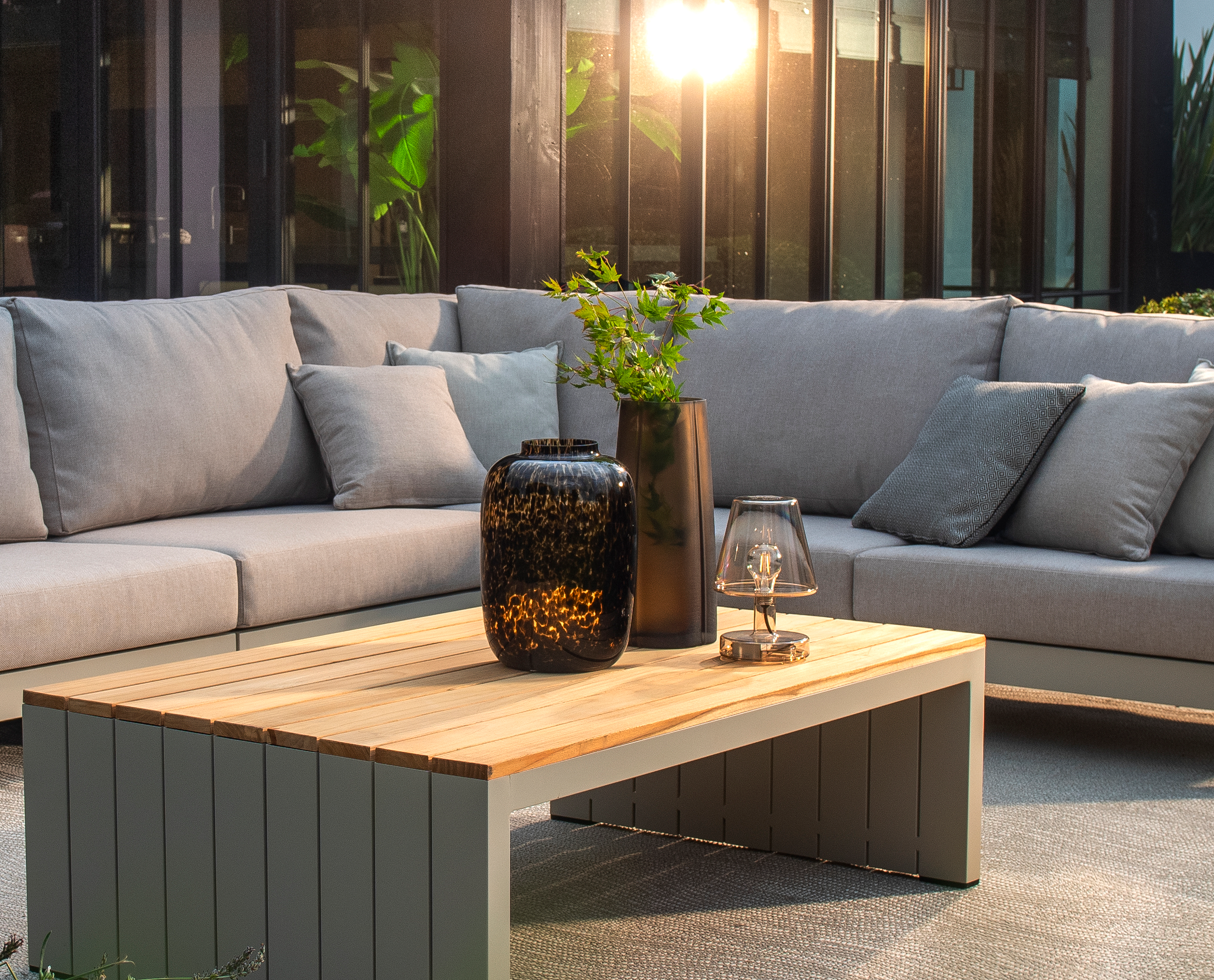 Feine Teakdetails an den Armlehnen verleihen dieser Lounge-Ecke einen Hauch von natürlicher Schönheit und machen sie zu einem Blickfang in Ihrem Außenbereich.