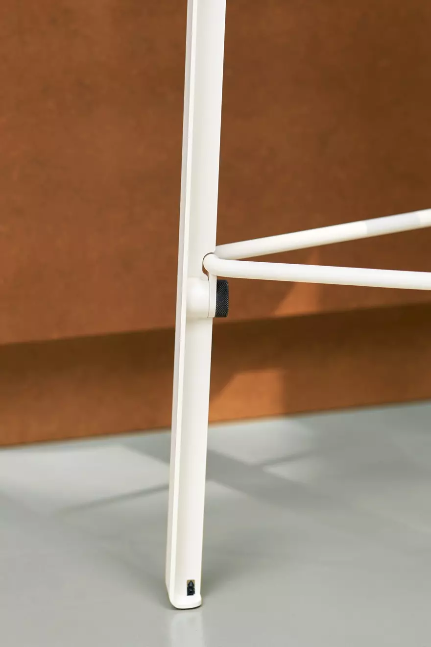 Seine Sitzfläche besteht aus recyceltem Kunststoff, der weiß und schwarz gesprenkelt ist oder aus massivem Holz (Eiche natur, Buche natur, Eiche dunkel gebeizt).