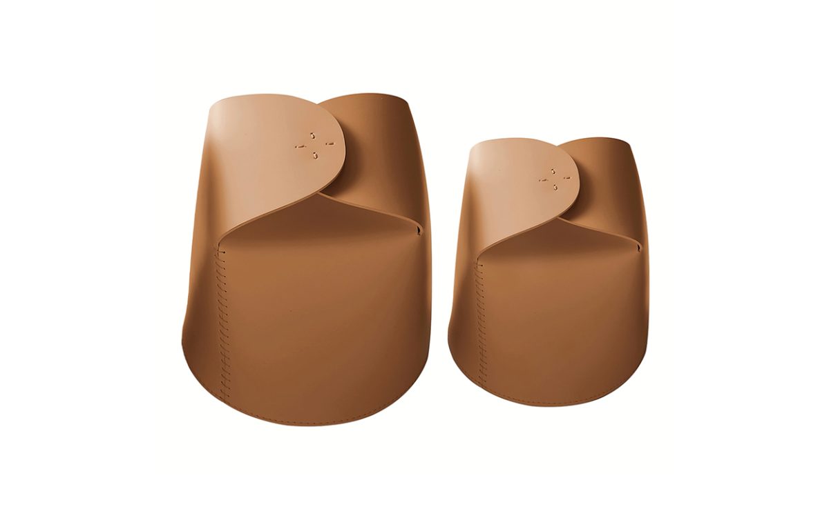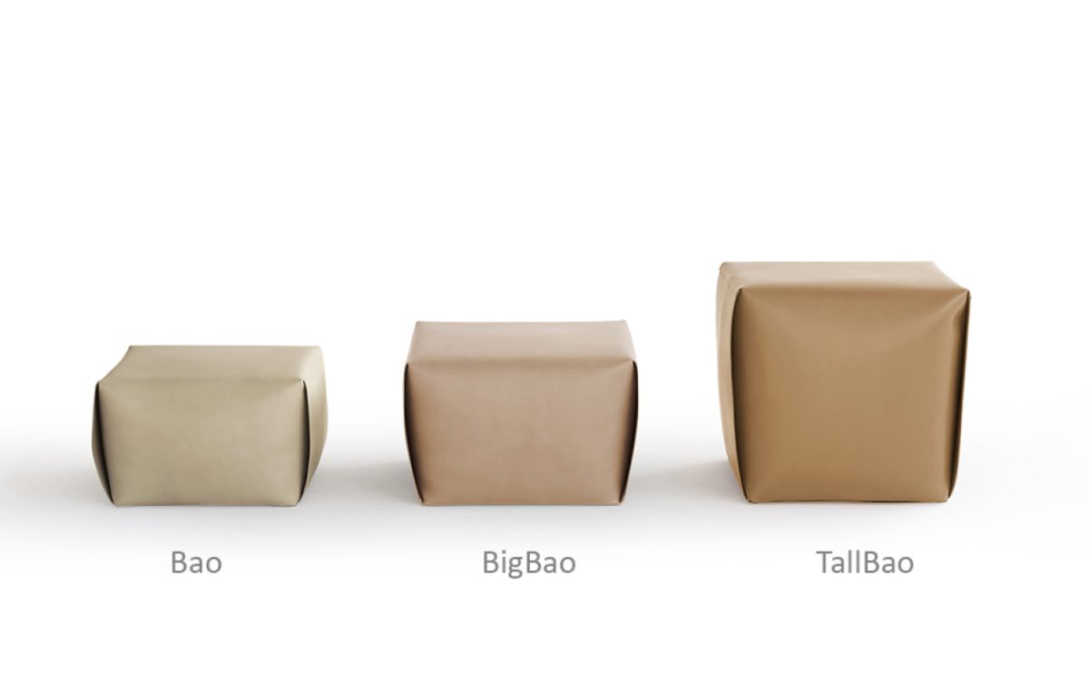 Dann gibt es BIGBAO, einen mittelgroßen Pouf, und TALL BAO, einen Pouf, der als Stuhl für Esstische verwendet werden kann. Diese beiden bestehen aus mattem Leder und können mit speziellen Gurten miteinander verbunden werden, um einen Loungesessel zu bilden: BEBAO.