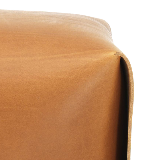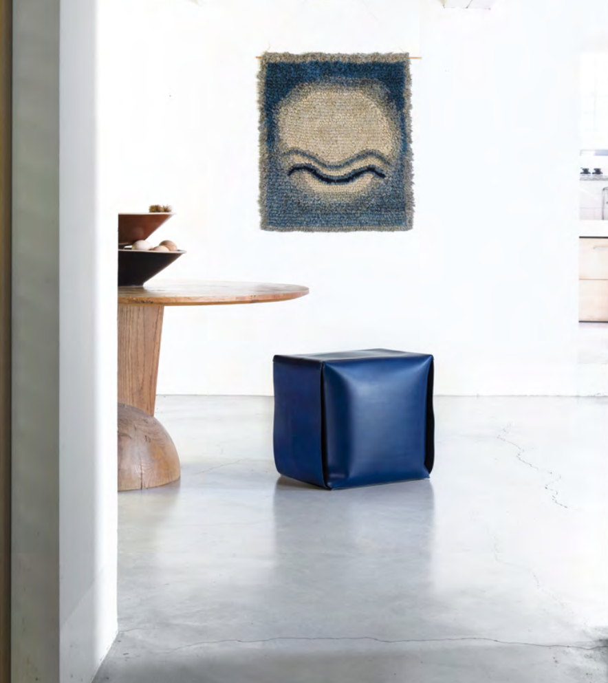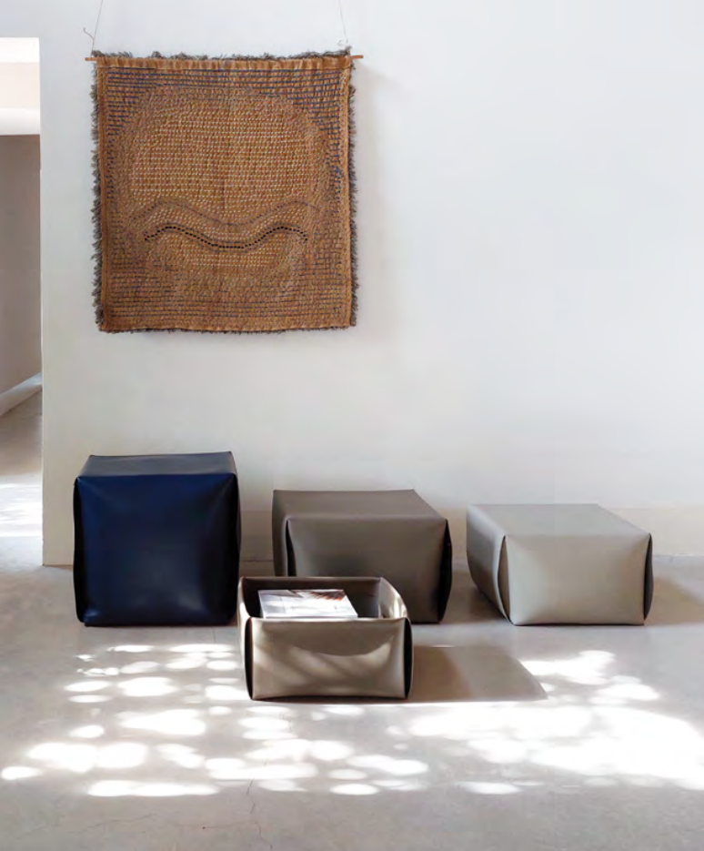 Die Pouf-Linie wird durch LULLABAO, einen Korb aus mattem Leder, abgeschlossen.
