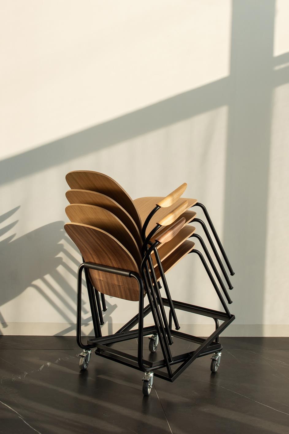 Und trotz seiner robusten Konstruktion fühlt sich jeder Stuhl leicht an und lässt sich leicht von Hand oder mit einem maßgeschneiderten Wagen bewegen.