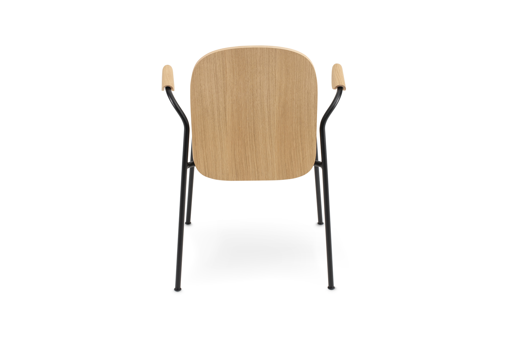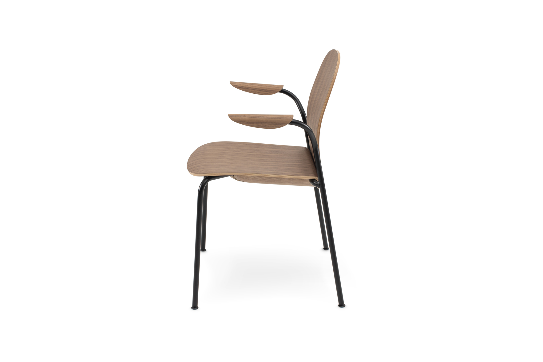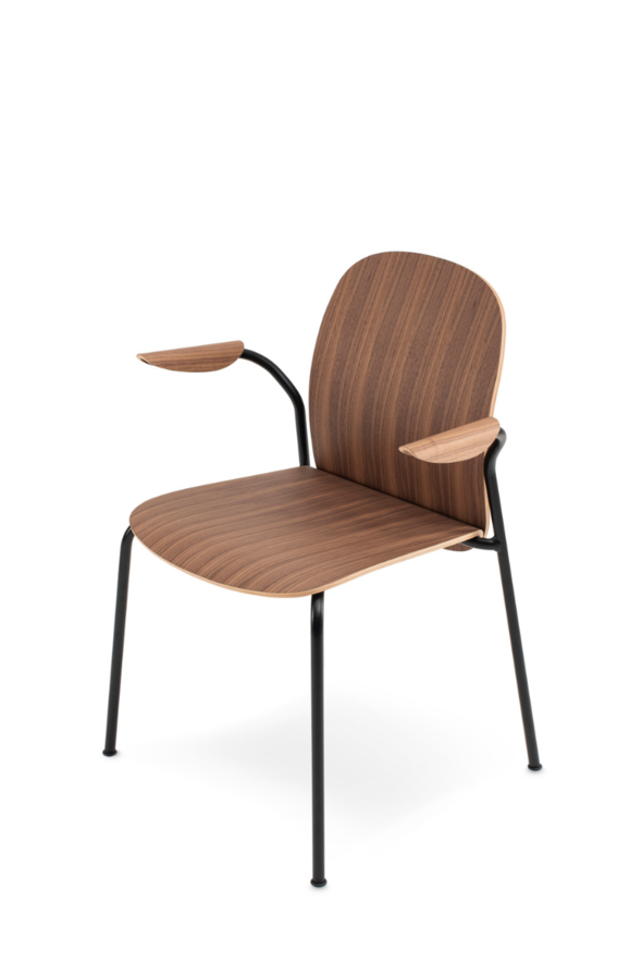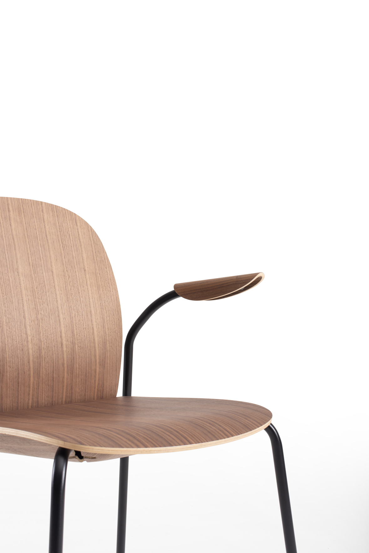 Mit seinem Gestell aus beständigem Stahl und der elegant geformten Sitzfläche aus furniertem Holz, die eine flexible Rückenlehne ermöglicht, schafft er ein Gleichgewicht zwischen Beständigkeit und optischer Attraktivität.
