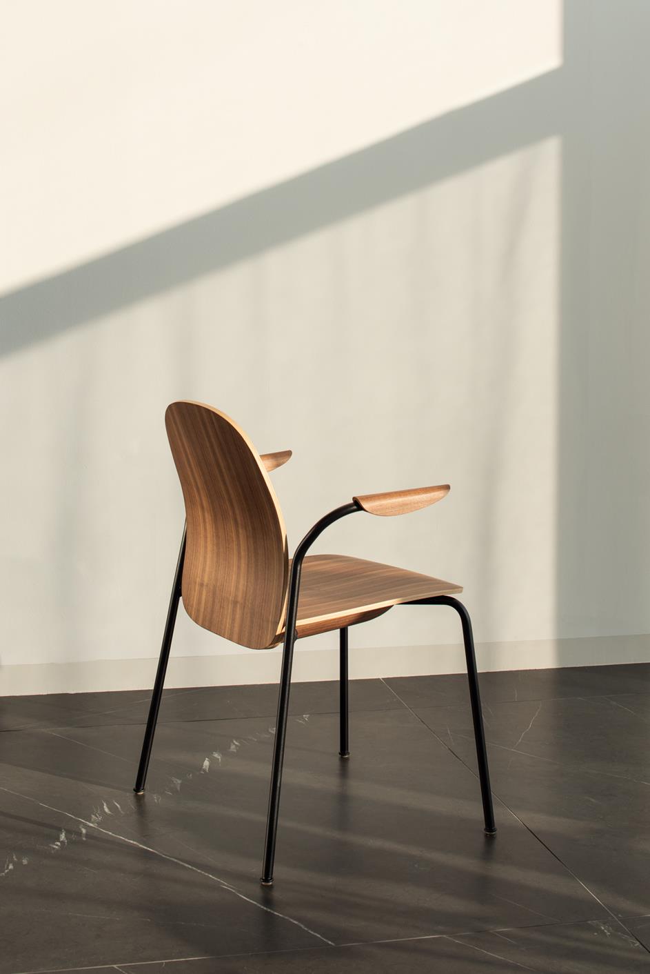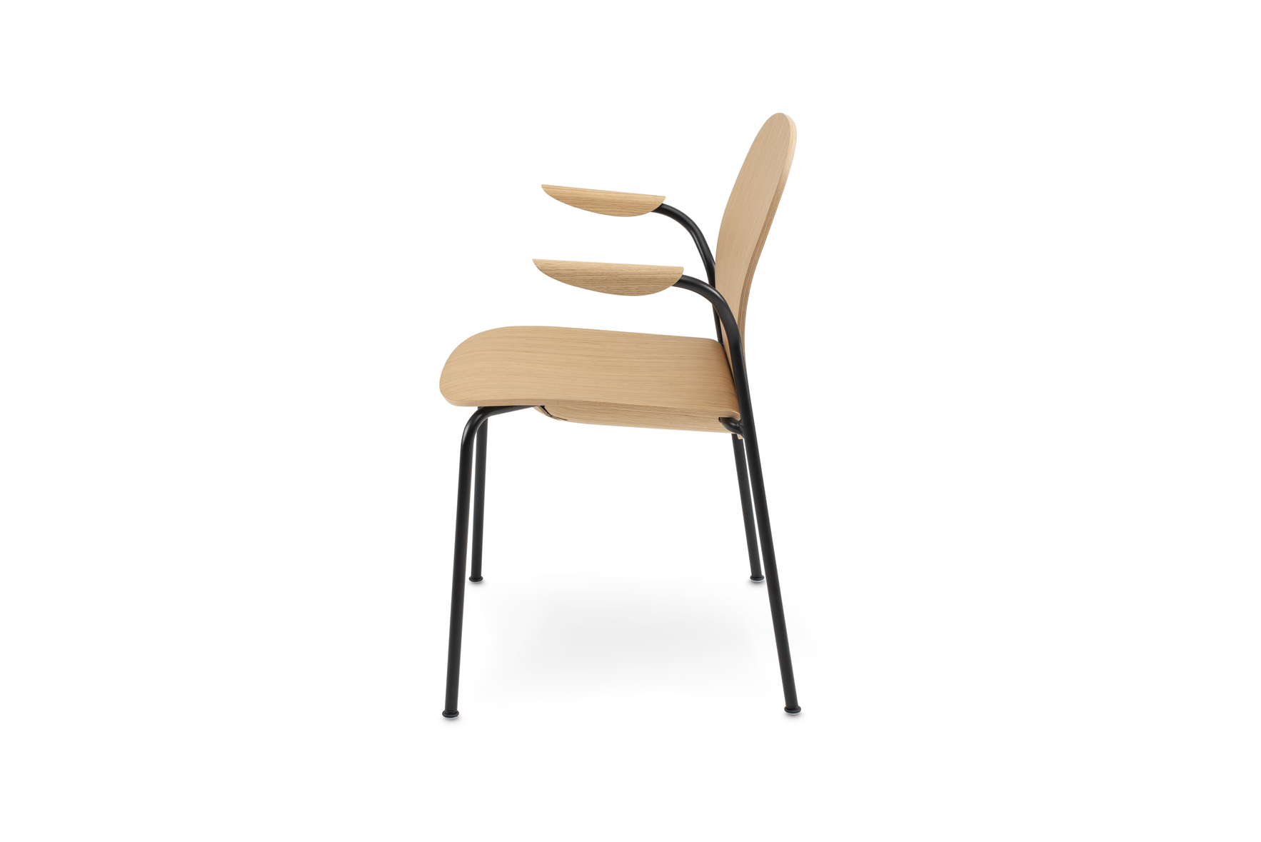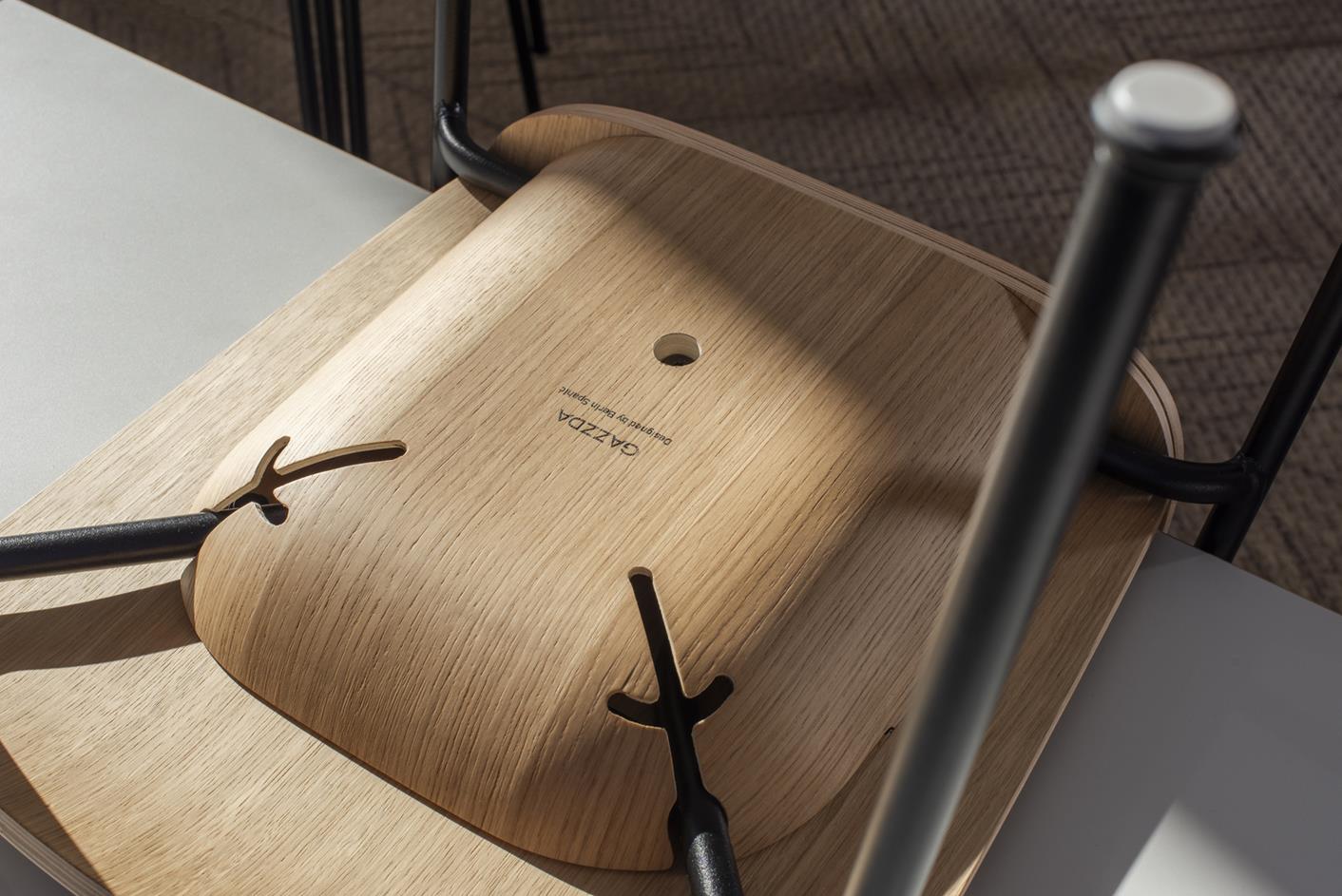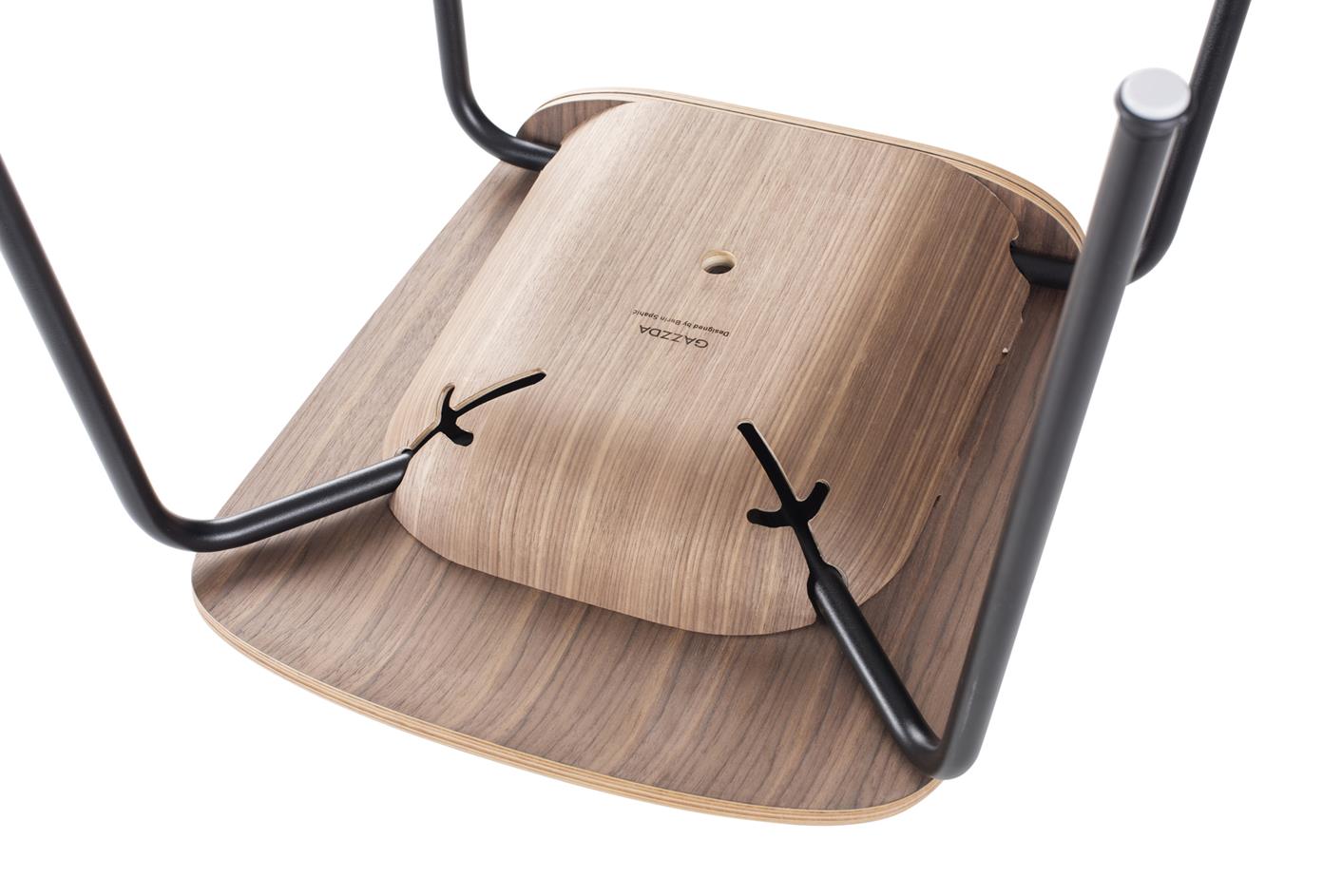 Mit seinem Gestell aus beständigem Stahl und der elegant geformten Sitzfläche aus furniertem Holz, die eine flexible Rückenlehne ermöglicht, schafft er ein Gleichgewicht zwischen Beständigkeit und optischer Attraktivität.