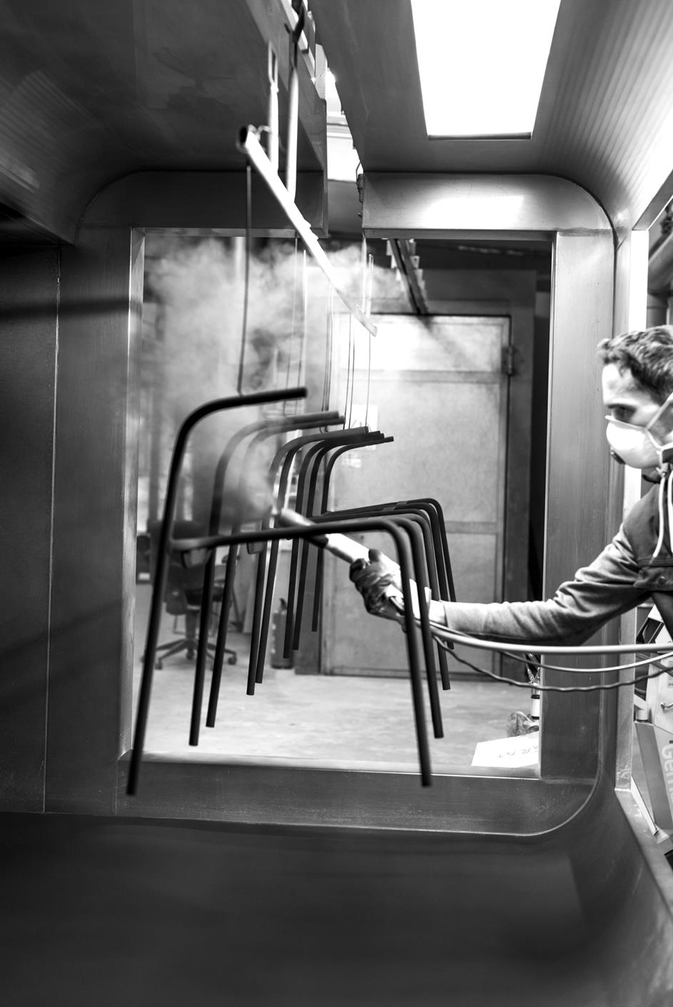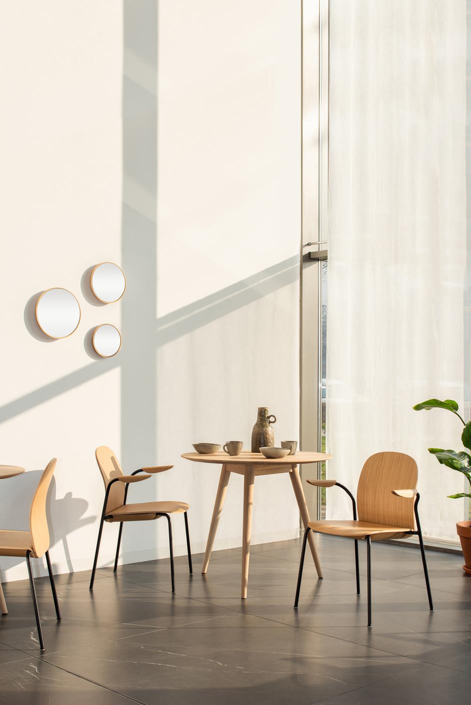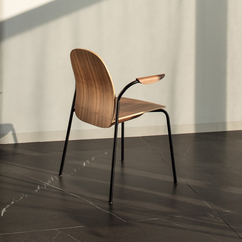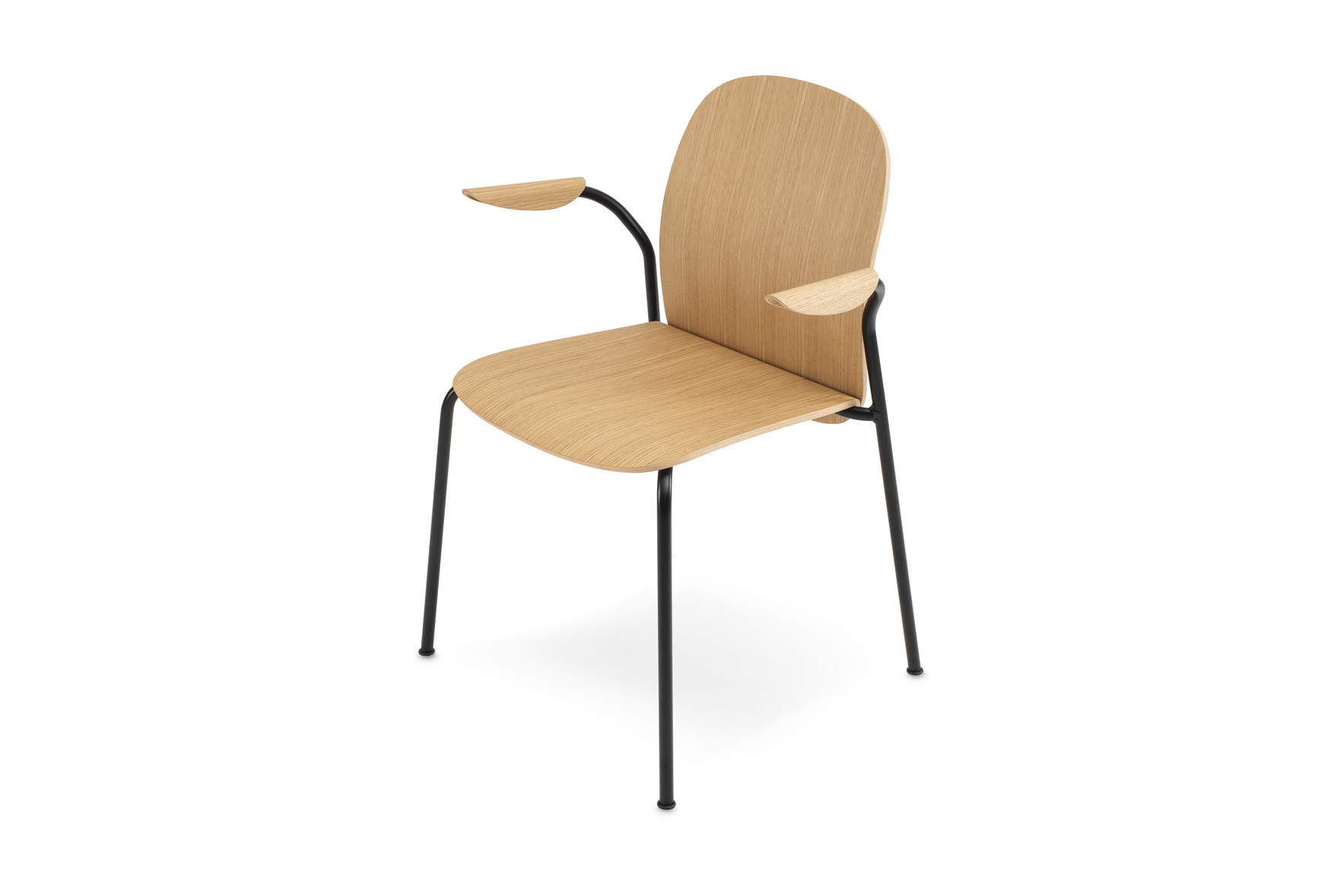 Mit seinem Gestell aus beständigem Stahl und der elegant geformten Sitzfläche aus furniertem Holz, die eine flexible Rückenlehne ermöglicht, schafft er ein Gleichgewicht zwischen Beständigkeit und optischer Attraktivität.