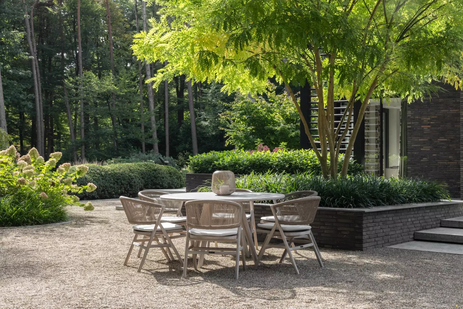 Das elegante Design von Gestell und Tischplatte, harmonisch in Farbe und Material abgestimmt, sorgt für eine ruhige und stilvolle Atmosphäre auf der Terrasse.