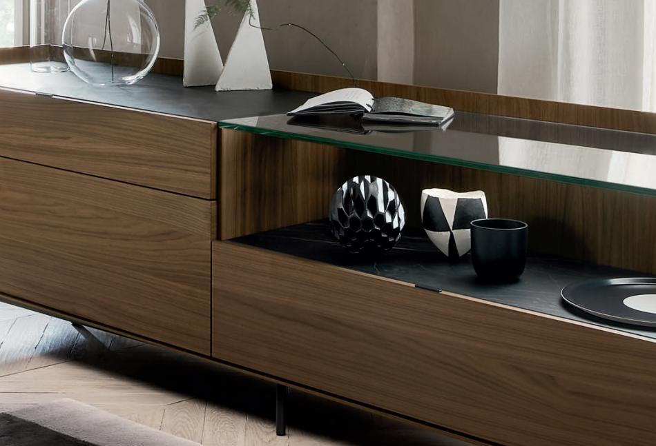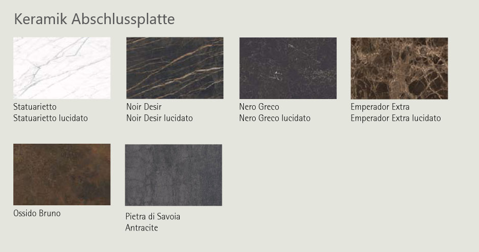 Hochwertige Details wie Keramikplatten als Abschluss und Glaselemente geben der Kollektion ein distinguiertes, elegantes Erscheinungsbild.