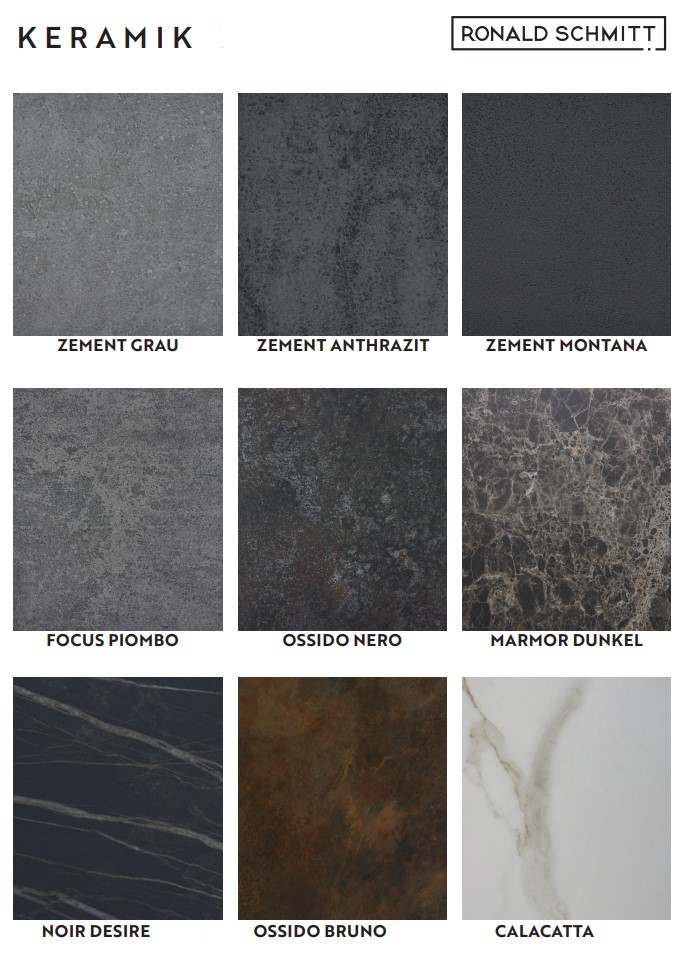 Keramik - Zemnt grau, Zement Anthrazot, Zement Montana, Focus Piombo, Osside Nero, Mamor Dunkel, Noir Desire, Ossido Bruno, Ossido Nero, Calacatta