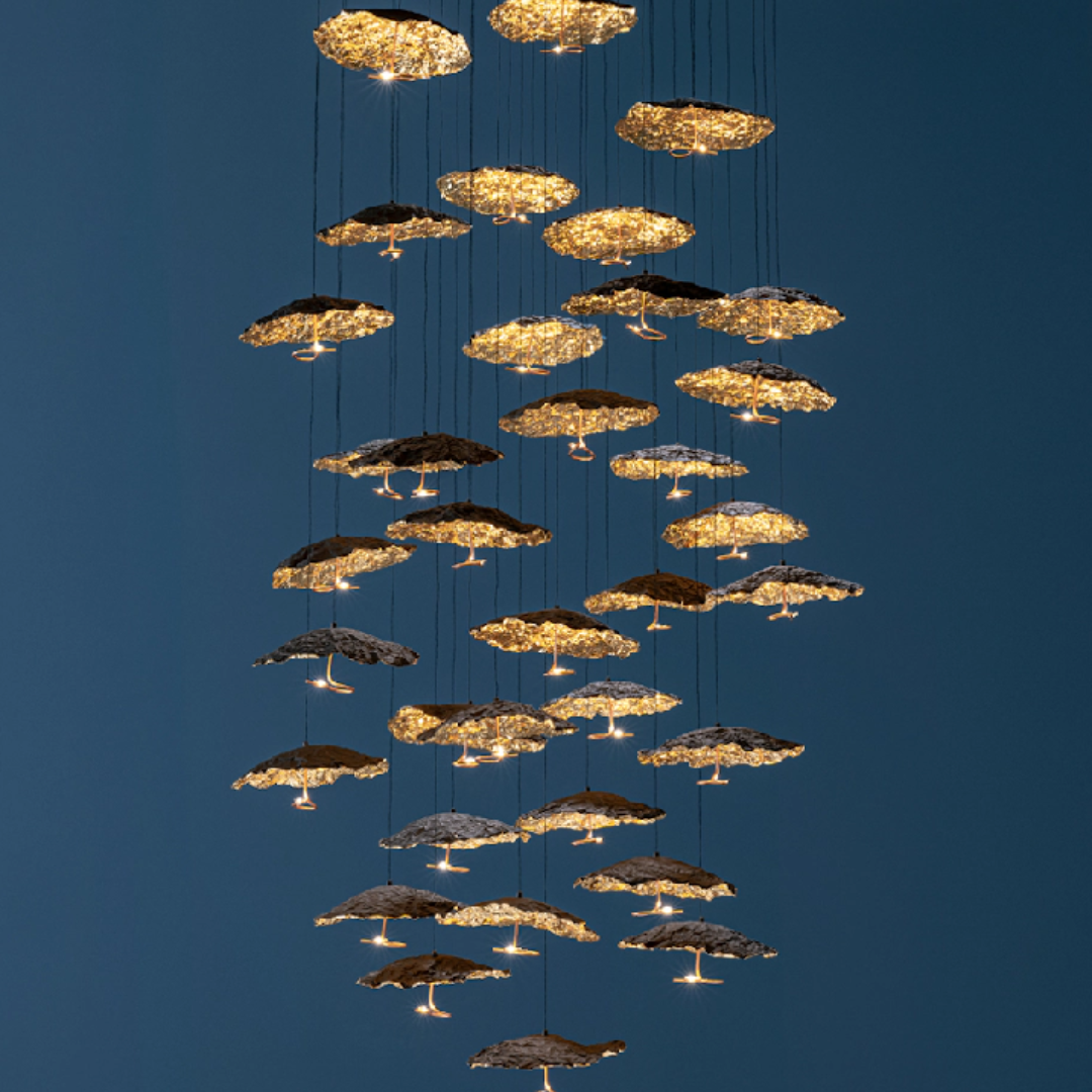Der Gold Moon Kronleuchter gibt dem traditionellen Konzept des Kronleuchters eine neue, unverwechselbare Wendung und verwandelt ihn in eine beeindruckende Kaskade aus schwebendem Licht. Er kann in verschiedenen Modellen mit unterschiedlichen Sockeln, Oberflächen und einer unterschiedlichen Anzahl von Elementen hergestellt werden. Er besteht aus einer Reihe von Scheiben mit unregelmäßigen Formen, an denen schlanke Kabel in verschiedenen Höhen hängen, die in schönen Kupferkringeln enden, in denen kleine LED-Leuchten sitzen. Die Innenfläche der Scheiben, die von Hand mit Blattgold überzogen wurde, nimmt das von den LEDs ausgestrahlte Licht auf, verstärkt es und schafft ein verführerisches Ambiente.