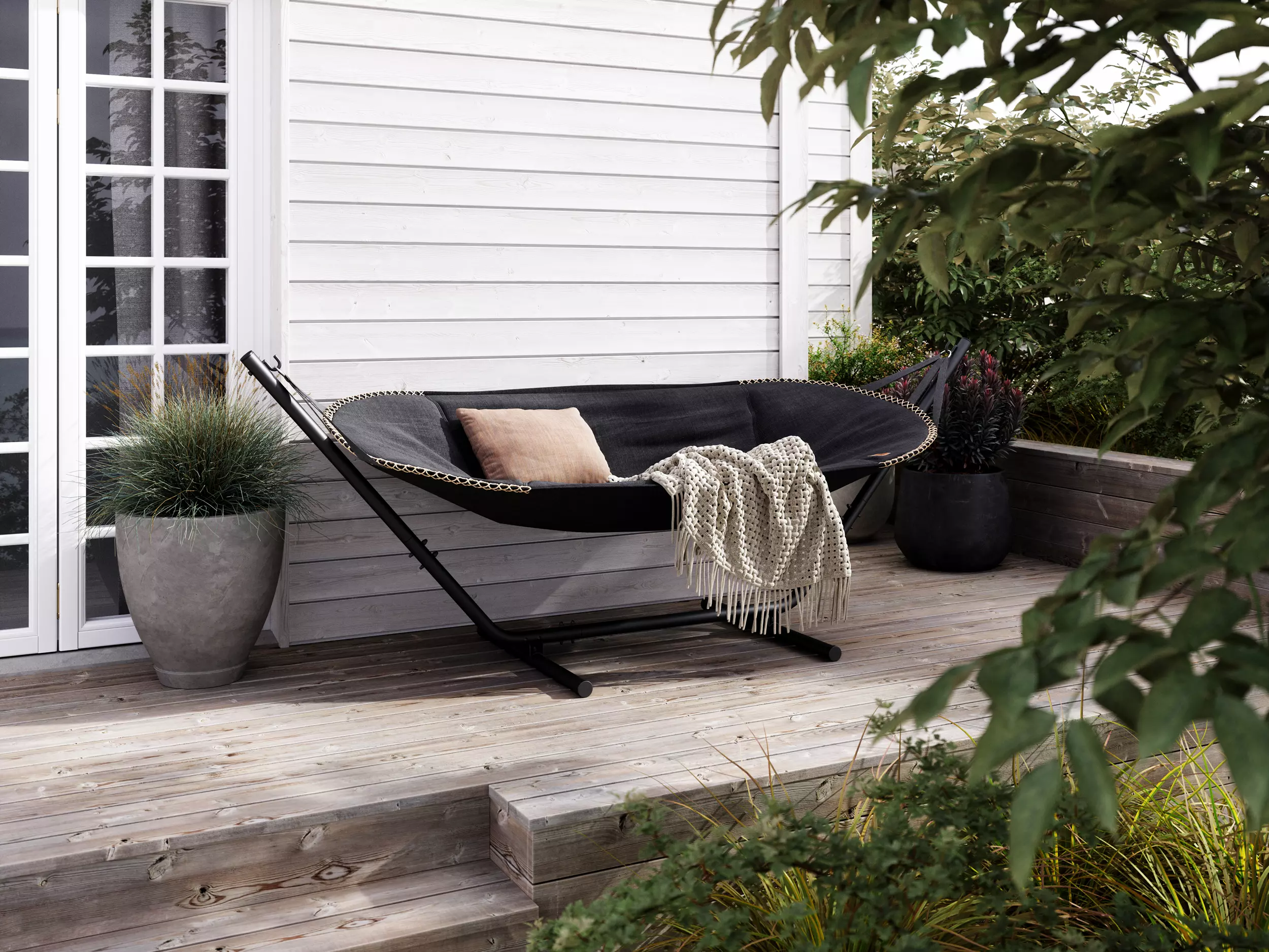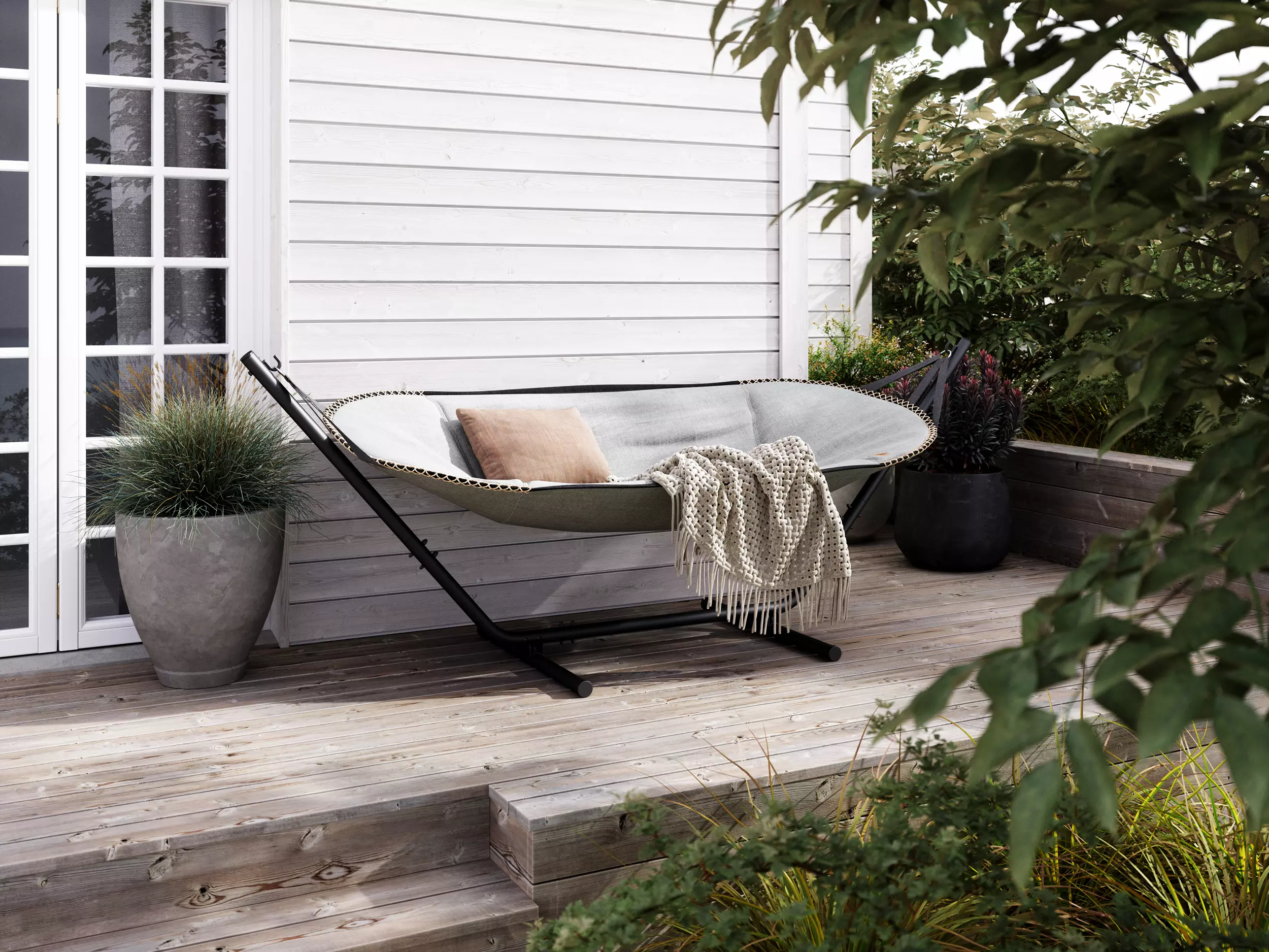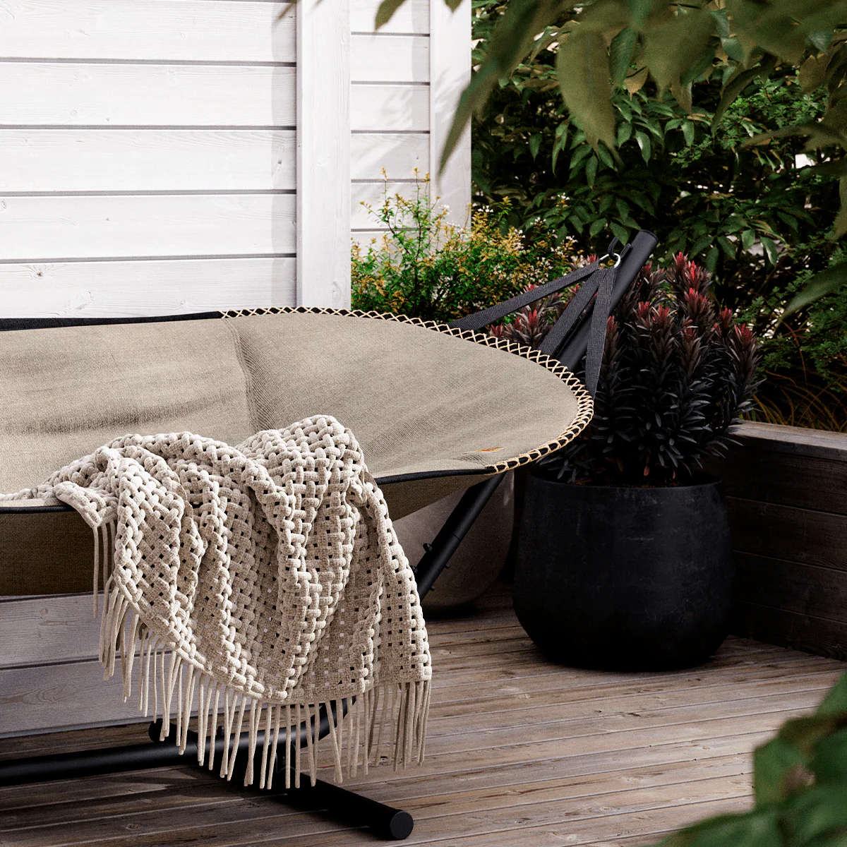 Die Cobana Hängematte ist ein durchdachtes Stück dänischen Designs. Um dir den bestmöglichen Komfort zu bieten und gleichzeitig die schöne Form zu erhalten, sind zwei ergonomisch geformte Metalldrähte in den Stoff eingenäht.