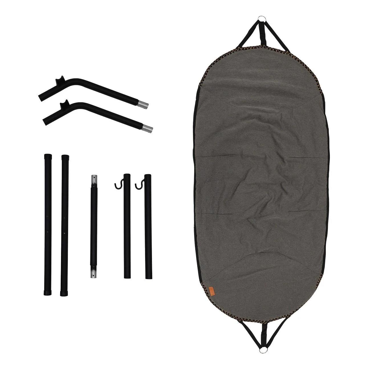 Der Rahmen besteht aus stabilem, hochwertigem Aluminium. Du kannst ihn problemlos draußen stehen lassen – auch wenn das Wetter mal nicht mitspielt. Bei starkem Wind oder Sturm empfehlen wir dir jedoch, die Hängematte reinzuholen.
