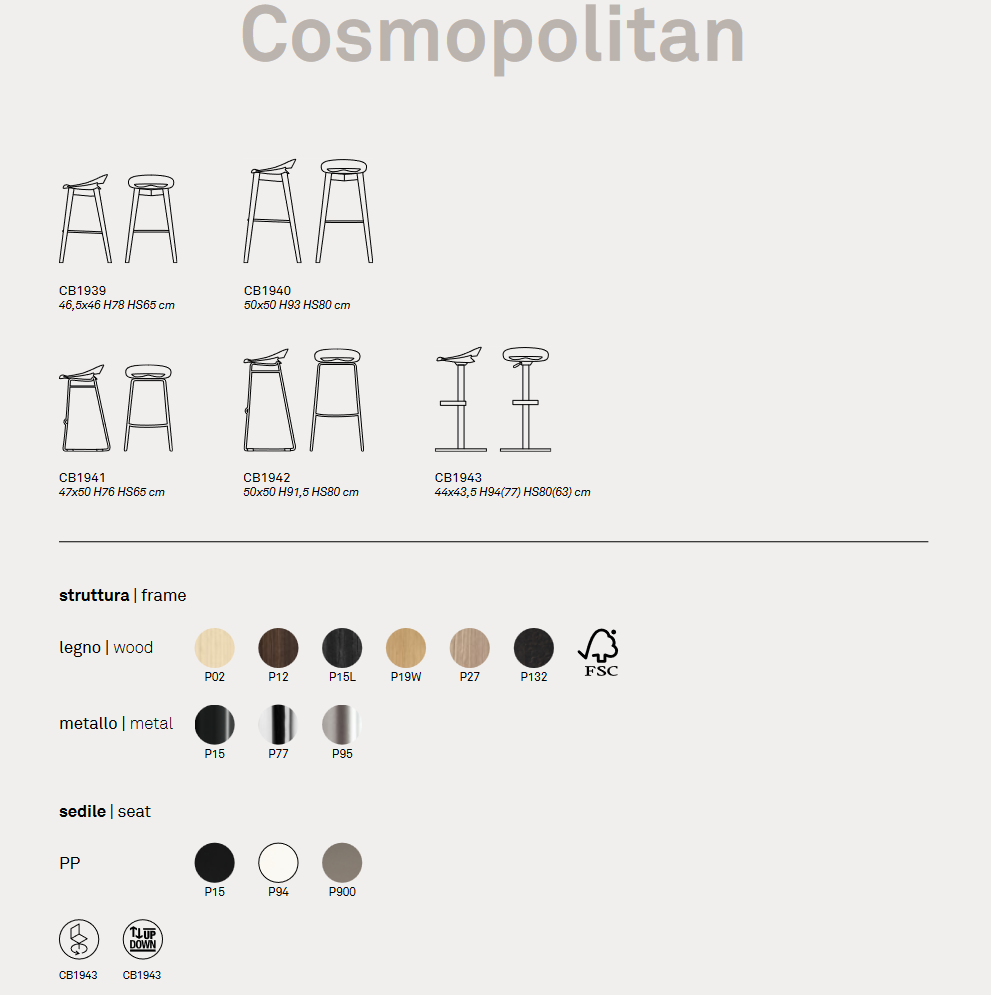 Der Hocker Cosmopolitan besitzt eine Sitzschale aus Polypropylen und ein 4-beiniges Gestell aus Massivholz. Die Fußstütze ist aus verchromten Metall.