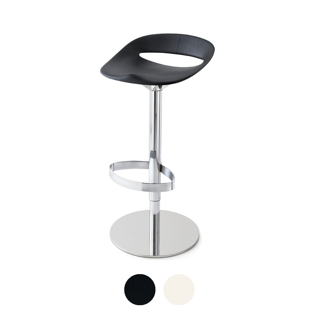 Der höhenverstellbare Hocker Cosmopolitan besitzt eine Sitzschale aus Polypropylen und ein Metallgestell aus Vollmaterial. Die Fußstütze besteht aus einer rechteckigen Metallstange. Der beschwerte runde Fuß gewährleistet maximale Stabilität.