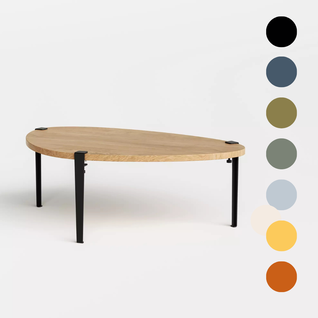 Eine schöne Darstellung von Einfachheit und Design Wenn du von einem Couchtisch mit einer originellen Form in der Mitte deines Wohnzimmers träumst, ist der Couchtisch SURF genau das Richtige für dich! Inspiriert von urfbrettern, bringt der Couchtisch SURF “Ferienhaus”-Spirit in dein Zuhause. Seine elliptische, längliche Form macht ihn zu einem funktionalen Tisch auch für kleine Räume. Die Tischplatte wird in Europa hergestellt und das Holz stammt aus nachhaltig bewirtschafteten Wäldern. MaterialMassivholzkern Fichte mit Eichenfurnier aus nachhaltig bewirtschafteten Wäldern mit PEFC-Zertifikat (Zertifikat PEFC/07-31-60)Tischbeine aus pulverbeschichtetem Stahl Dieses Produkt wird zu 100 % in Europa hergestellt.MaßeBreite 50 cmLänge 120 cmDicke 3 cmHöhe 43 cmFarbenTischbeineGraphitschwarzCremeweißMitternachtblauAzurblauBriochegelbEukalyptusgrauMandarinenrotKhakigrünBlassblau