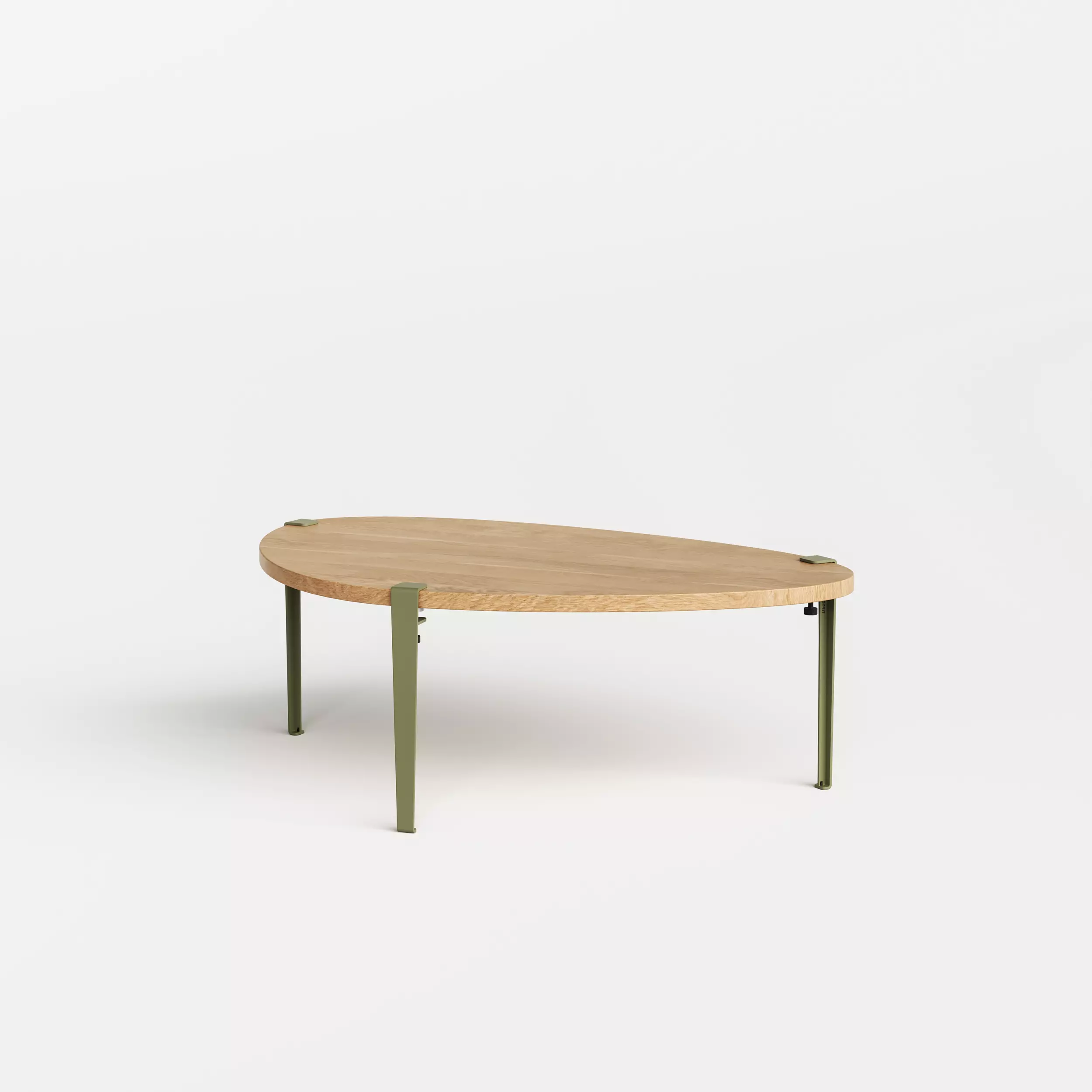 Ein Design-Couchtisch für das Wohnzimmer Gestalte dein Wohnzimmer mit dem Design-Couchtisch PEBBLE. Sein einzigartiger, von der Natur inspirierter Look passt zu allen Einrichtungsstilen: modern, industriell, Bohème, skandinavisch oder zeitgenössisch. Bestehend aus einer Tischplatte aus massiver Eiche und 3 Couchtischbeinen aus Stahl in der Farbe deiner Wahl, lässt sich dieser Couchtisch in nur wenigen Minuten zusammenbauen! Der Couchtisch Pebble aus massiver Eiche wird zu 100% in Europa aus nachhaltigen und umweltfreundlichen Materialien hergestellt. Das Holz stammt aus nachhaltig bewirtschafteten Wäldern mit Gütesiegel. MaterialTischplatte aus massiver Eiche aus nachhaltig bewirtschafteten Wäldern mit PEFC-Zertifikat (Zertifikat PEFC/07-31-60)Tischbeine aus pulverbeschichtetem Stahl Dieses Produkt wird zu 100 % in Europa hergestellt.MaßeBreite 75 cmLänge 120 cmDicke 3 cmHöhe 43 cmFarbenTischbeineGraphitschwarzCremeweißMitternachtblauAzurblauBriochegelbEukalyptusgrauMandarinenrotKhakigrünBlassblau