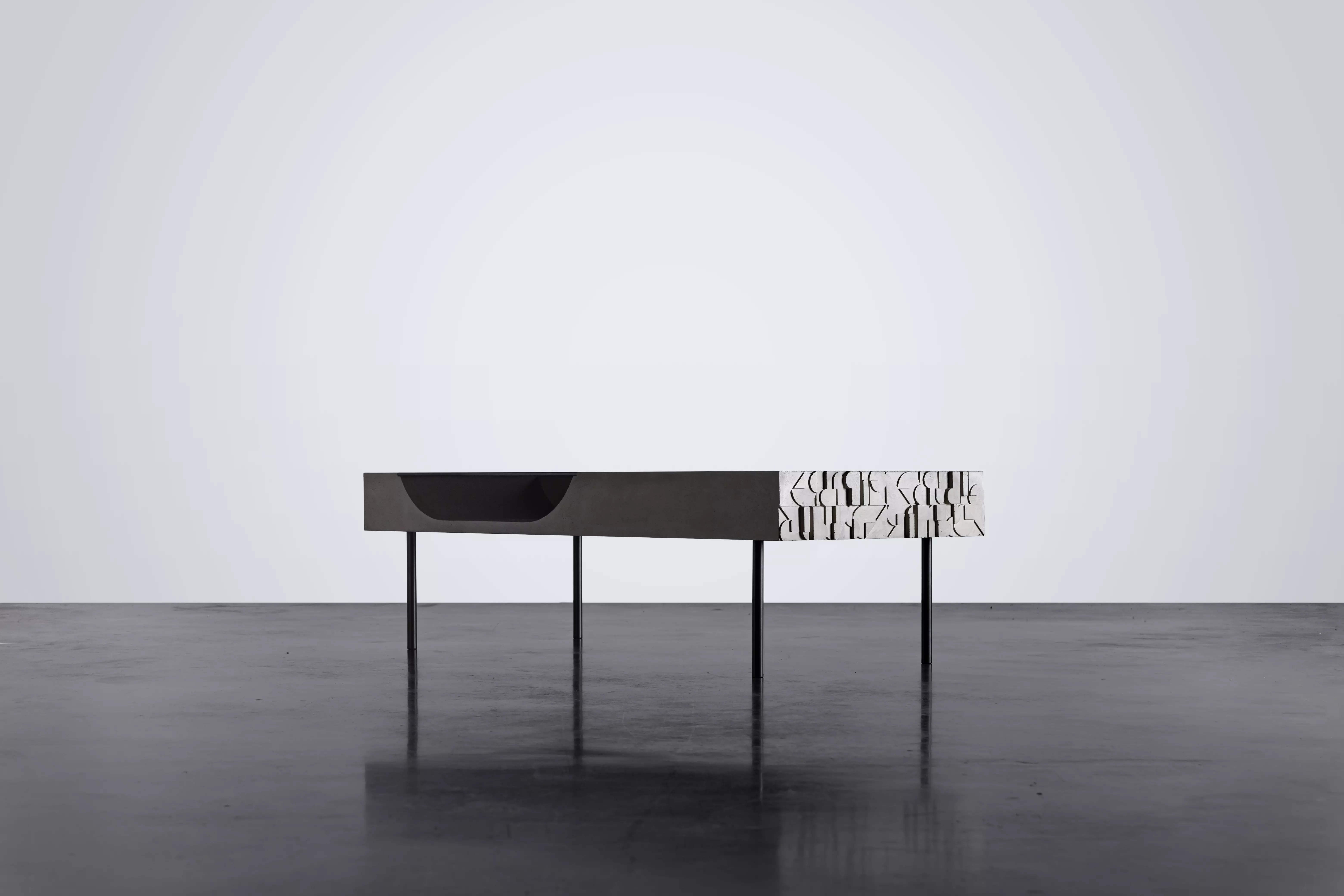 Couchtisch mit drehbarem, schwebendem Metall Tablett und minimalistischem Design.Die Twist-Kollektion, bestehend aus einem Couchtisch und einem Beistelltisch aus Beton, erzählt die Geschichte einer harmonischen Gegenüberstellung von Form und Material, von Ruhe und Bewegung. Auf der einen Seite: Beton. Fest, geradlinig, mineralisch. Beton verankert jedes Stück, während er deinen Wohnraum strukturiert. Auf der anderen Seite: Metall. Ein schlankes Stück rundes, durchbrochenes Metall, das drehbare Tablett bringt Feinheit und Bewegung in das Endprodukt. Das Beste, was deinem Wohnzimmer seit der Erfindung der Fernbedienung passieren konnte. Das Metalltablett dreht sich um eine exzentrische Achse und streckt sich dir entgegen, wenn du es brauchst. Ein sanfter Stoß und es bewegt sich wieder aus dem Weg. Jedes Stück in unserer TWIST-Kollektion hat ein drehbares Element. Aber das hast du wahrscheinlich schon herausgefunden. Bewegliche Teile wie diese sind normalerweise fragil. Aber keine Sorge: Wie bei all unseren Möbeln ist auch unsere TWIST-Kollektion darauf ausgelegt, sehr lange zu halten – sehr lange. Bewegliche Teile eingeschlossen. Trotz des robusten Designs haben wir jedes Detail sorgfältig behandelt, um sicherzustellen, dass das Endergebnis wirklich ganz elegant ist.Design Alexandre Dubreuil MaßeLänge 136 cmTiefe 70 cmHöhe 33,5 cm Höhe Metallplatte 44,5 cmGewicht 48,1 kgMaterialFaserbeton / Stahl Farbloser wasser- und ölabweisender matter Lack / pulverbeschichtet, soft touchPflegehinweiseVerwende keine abrasiven Materialien oder Lösungsmittel auf der Oberfläche. Trage regelmäßig schützendes Wachs oder Öl auf. Eine Flasche Imprägniermittel gegen Flecken ist im Lieferumfang dieses Möbels enthalten. Es verhindert signifikant, dass Öl, Fett und Wasser in den Beton eindringen.