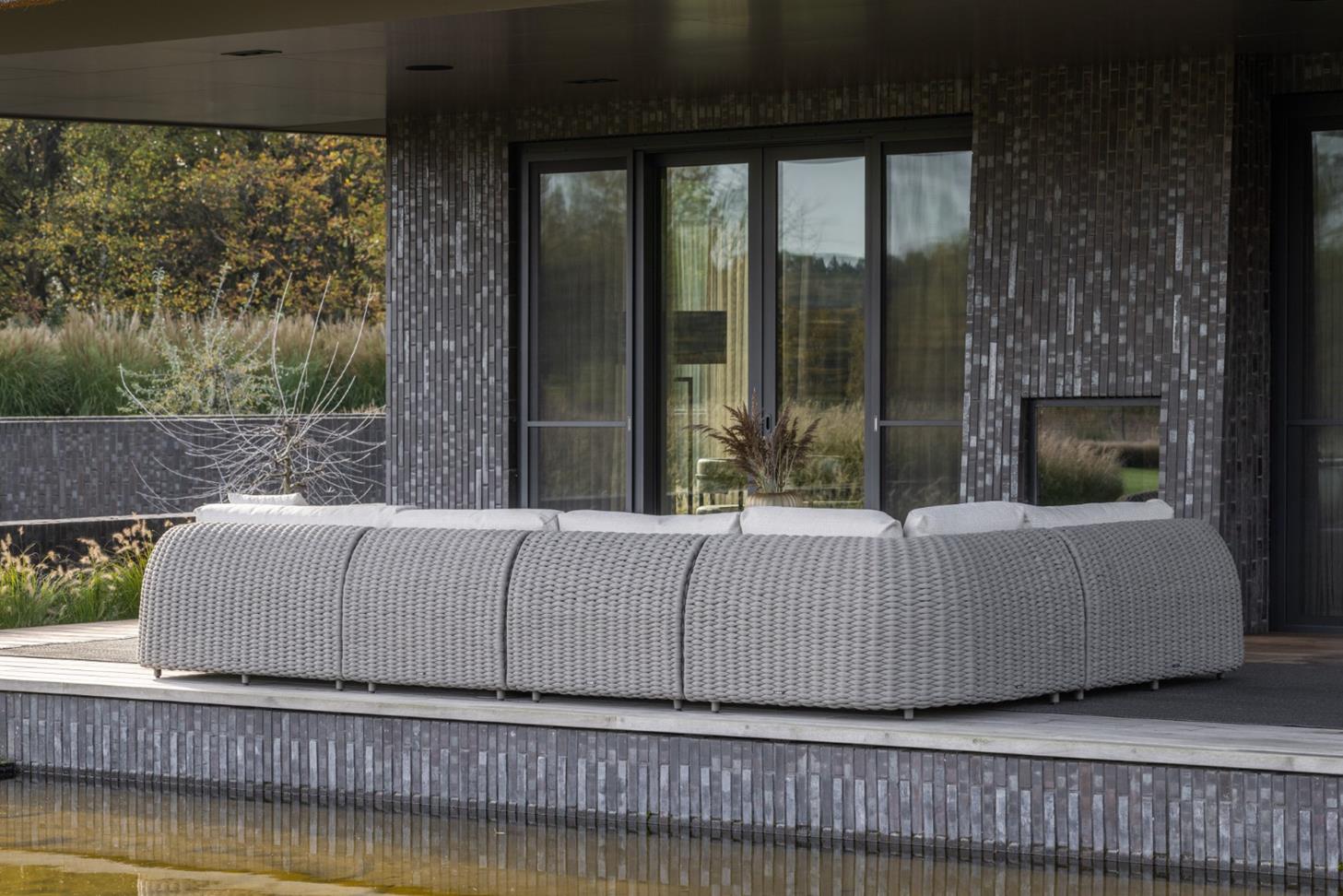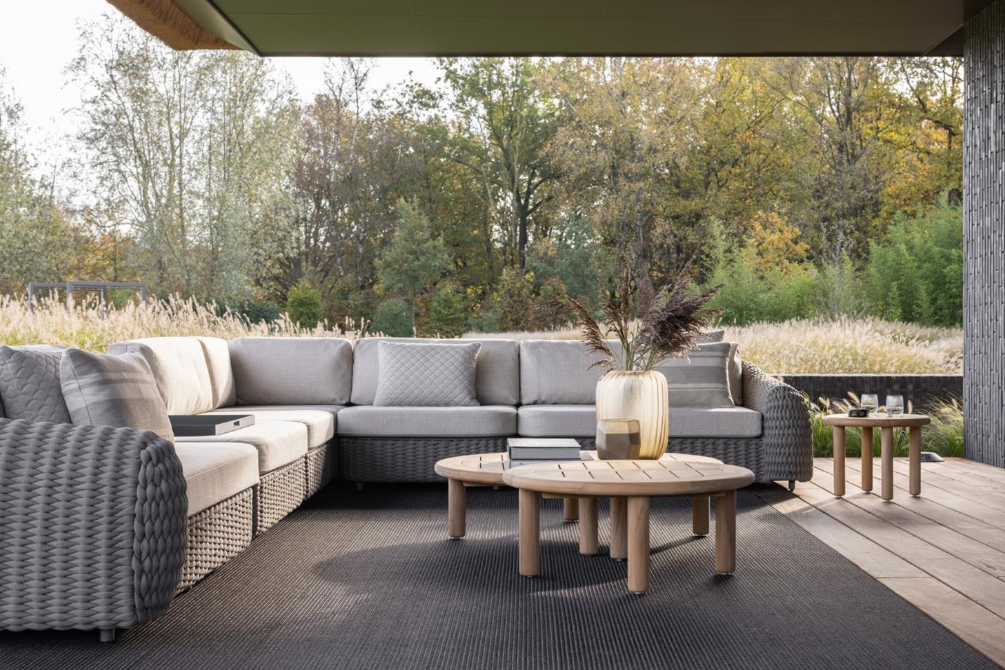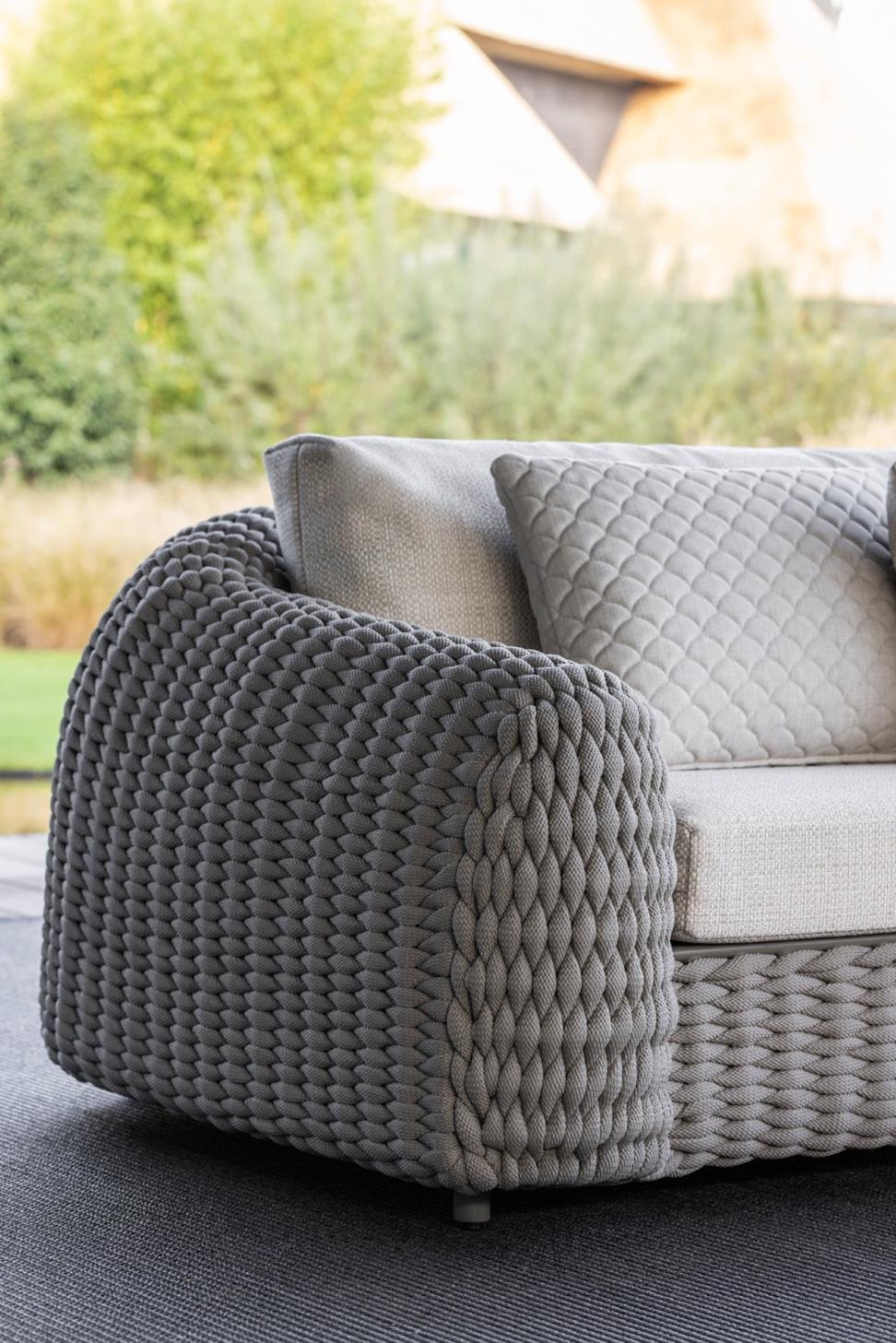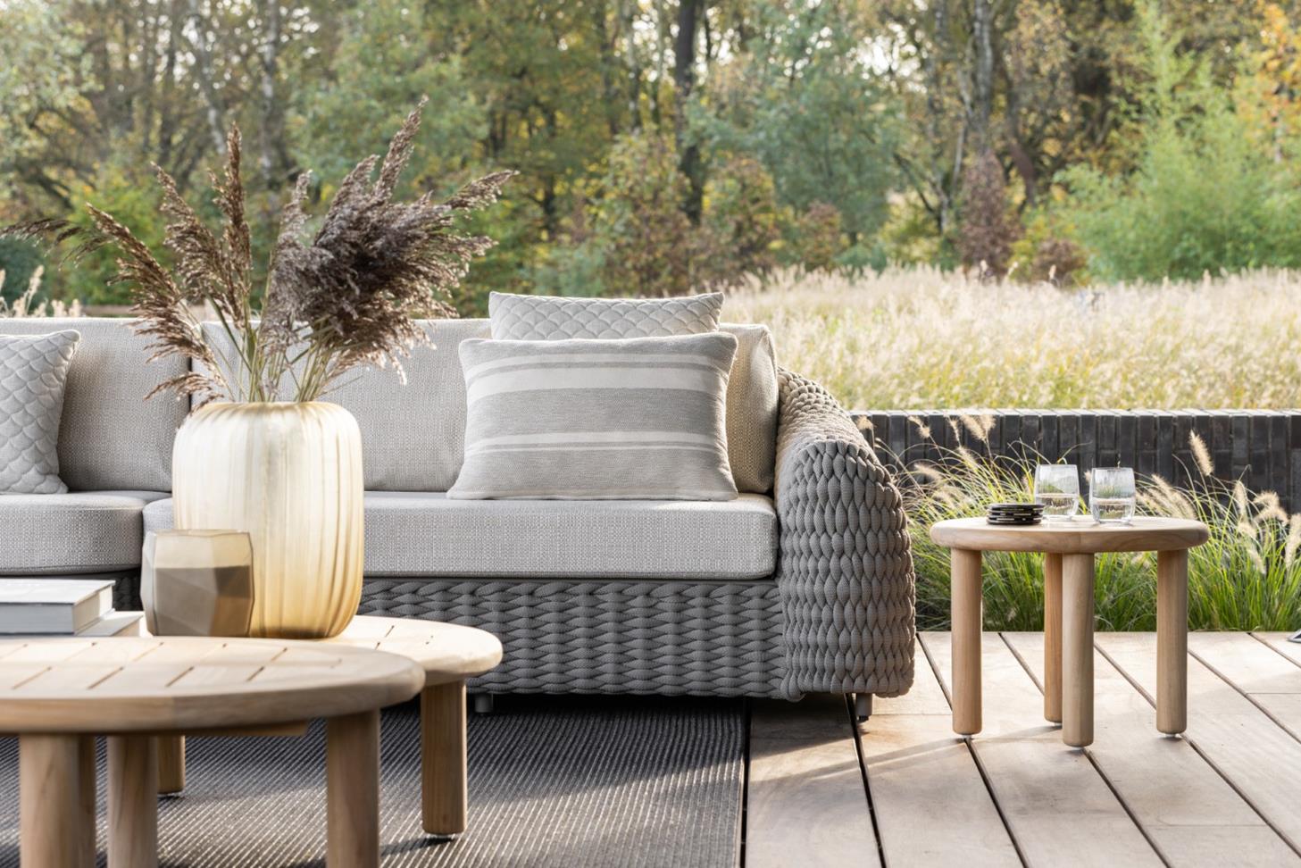 Deauville ist in der Farbe 'Slate' ausgeführt. Die hochwertigen Kissen kommen in der neuen Farbe Buca: ein wetterfester Stoff mit einer subtilen Webstruktur und einem hellen Farbton.