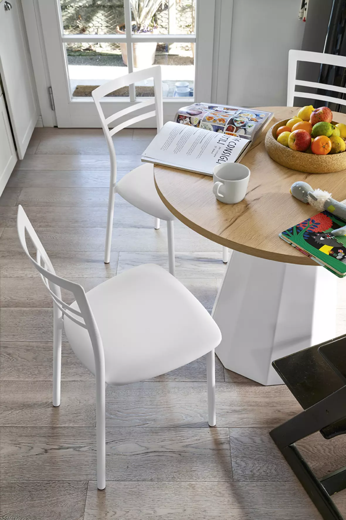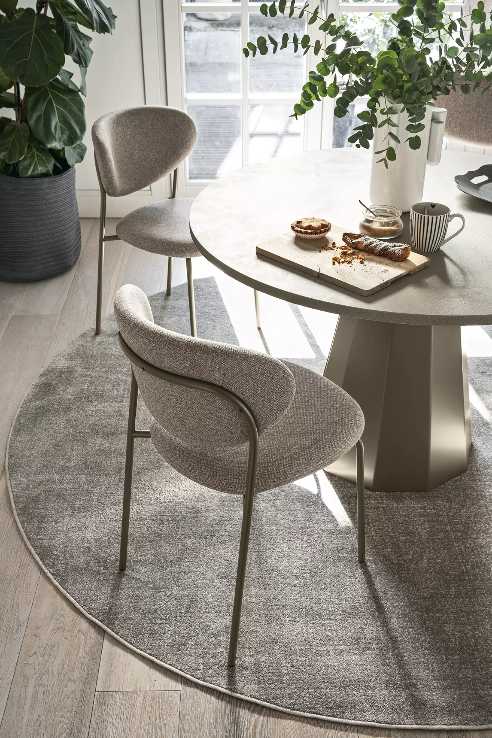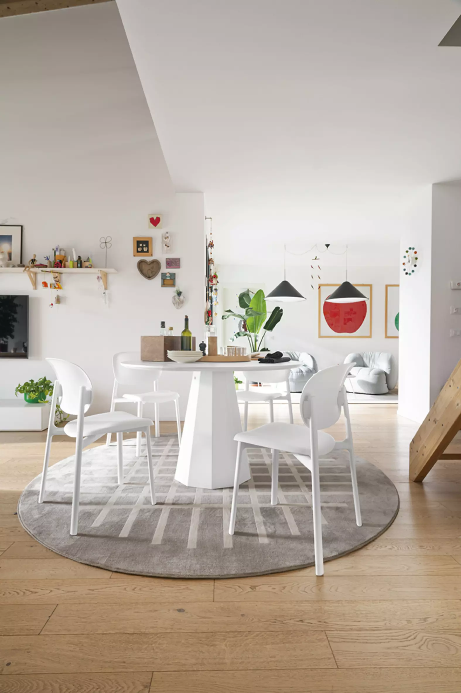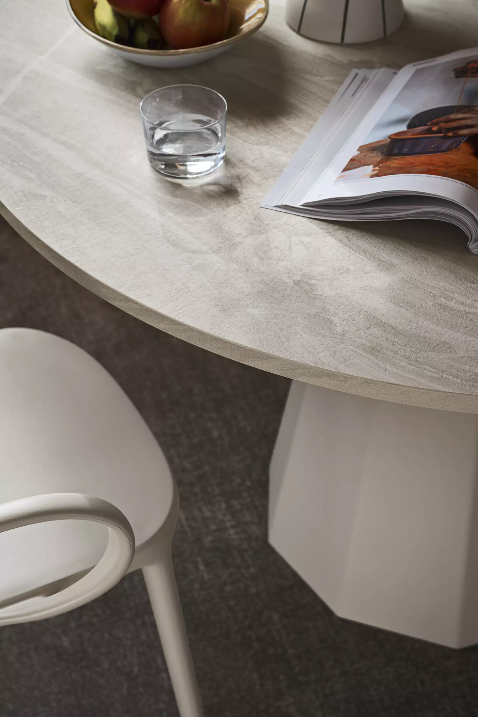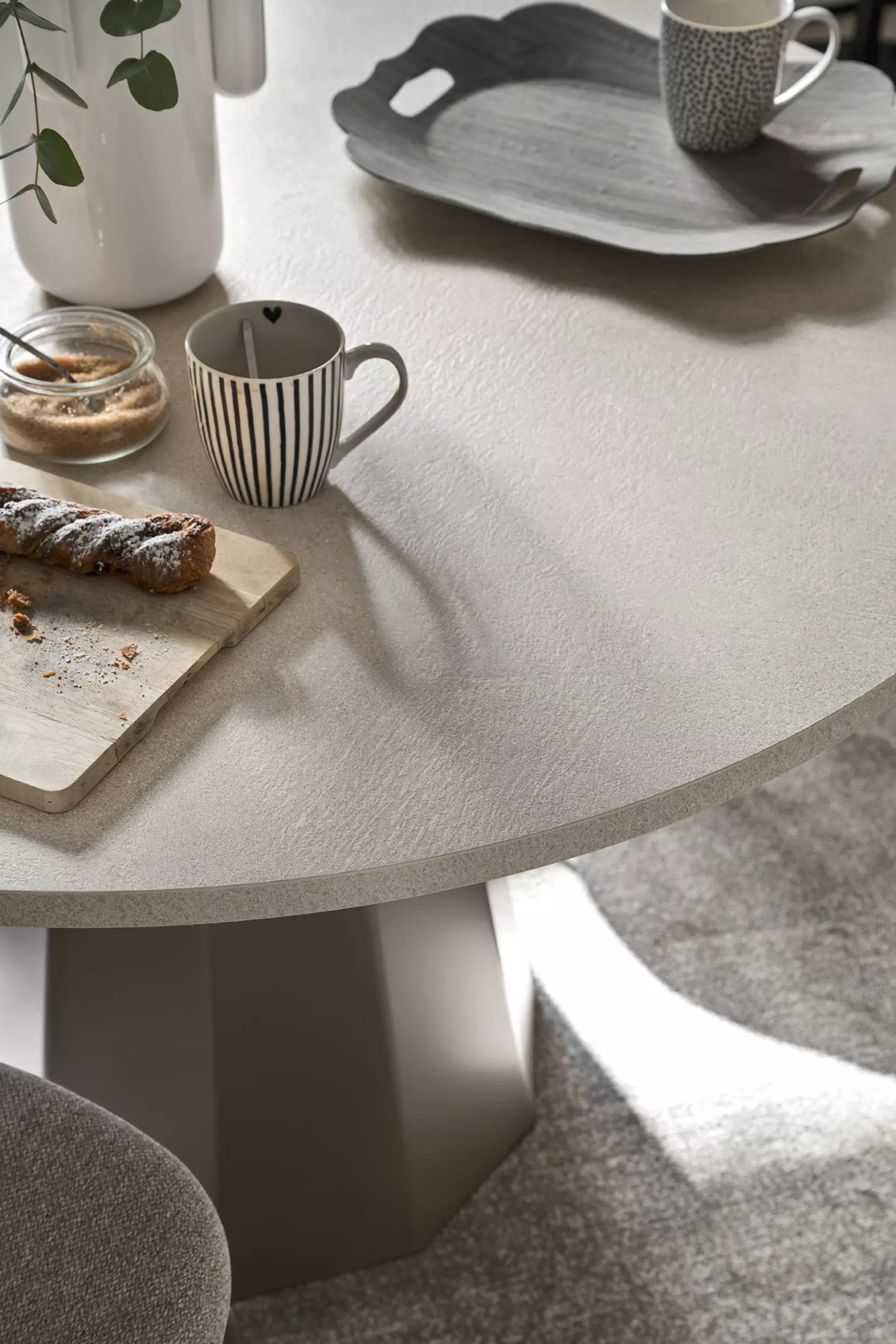 Eine runde Tischplatte vervollständigt das Design-Erlebnis und ist verfügbar in interessanten Folierungen, HPL Laminaten oder ganz klassisch weiß matt lackiert.