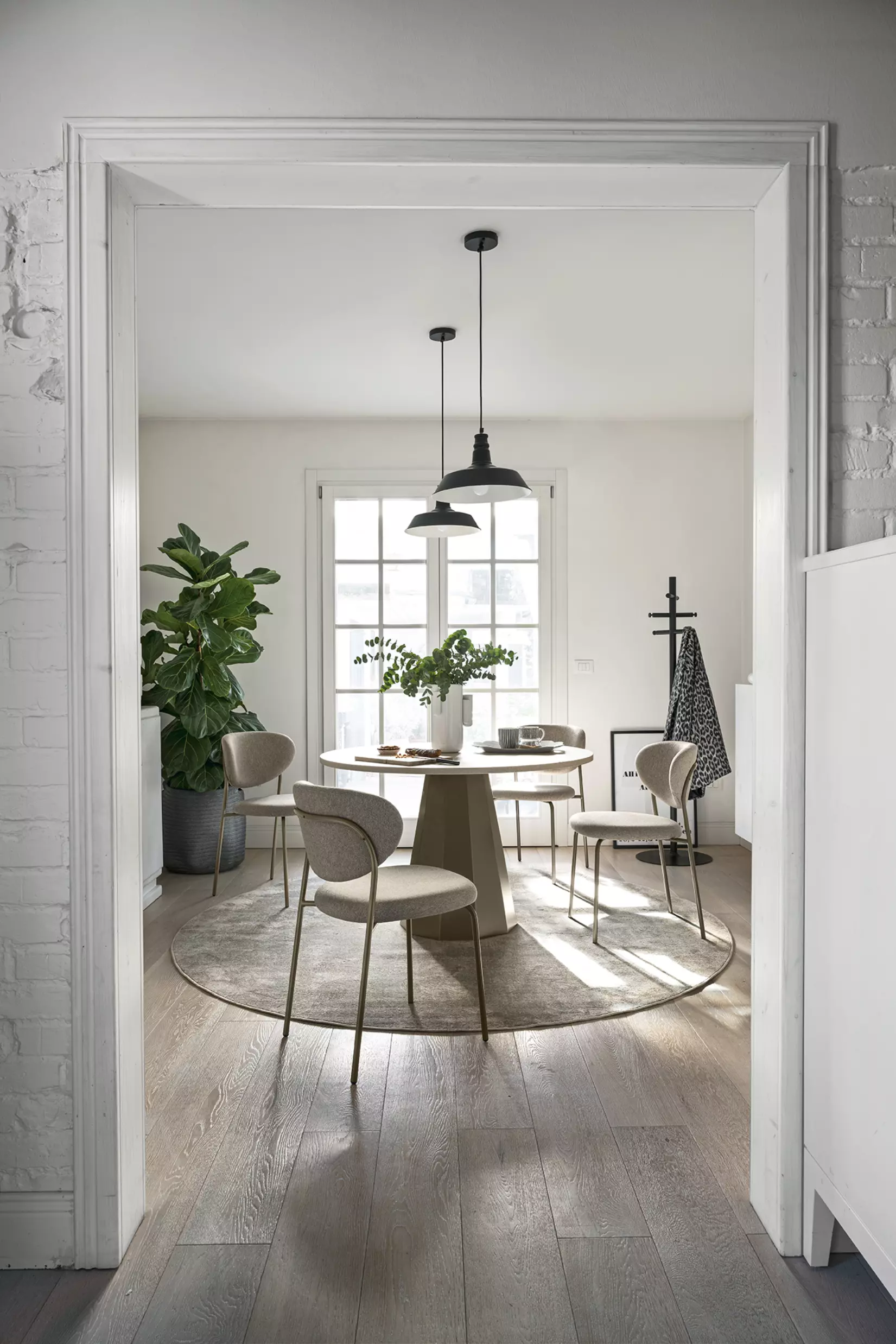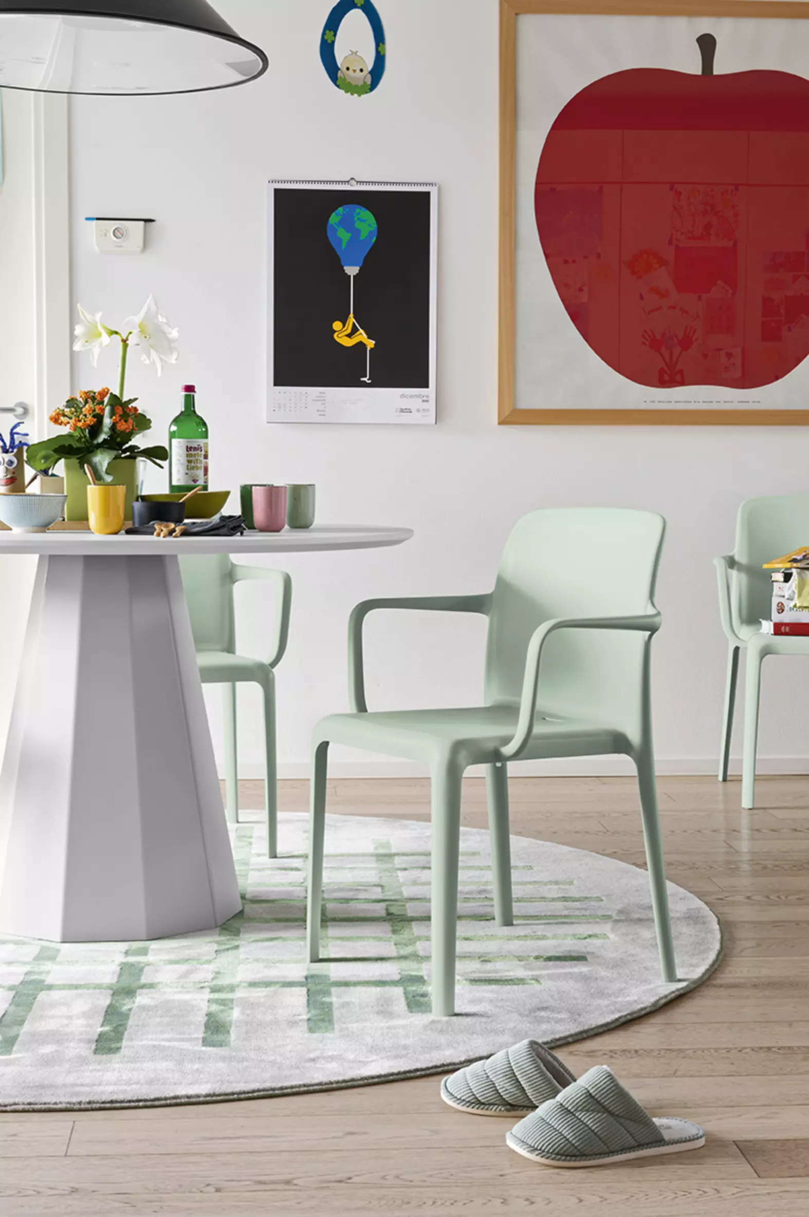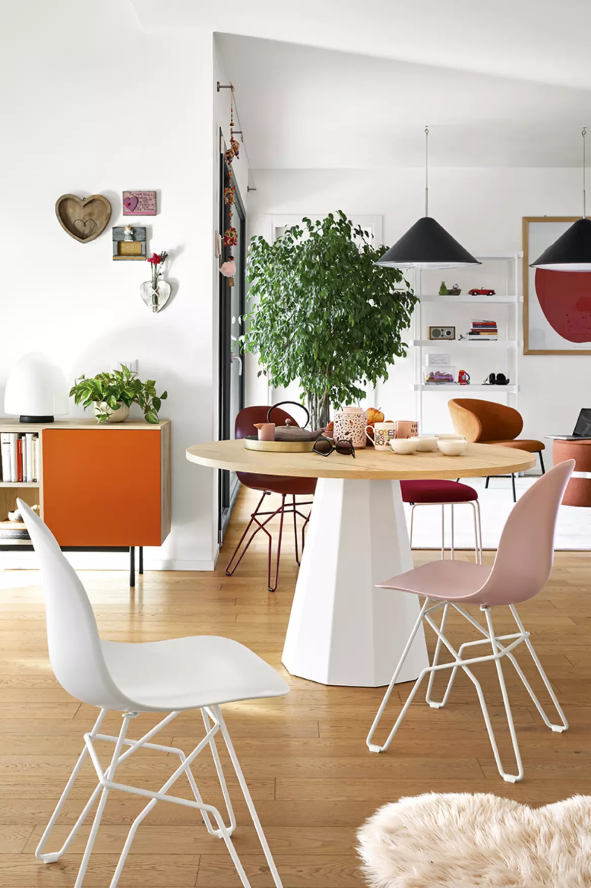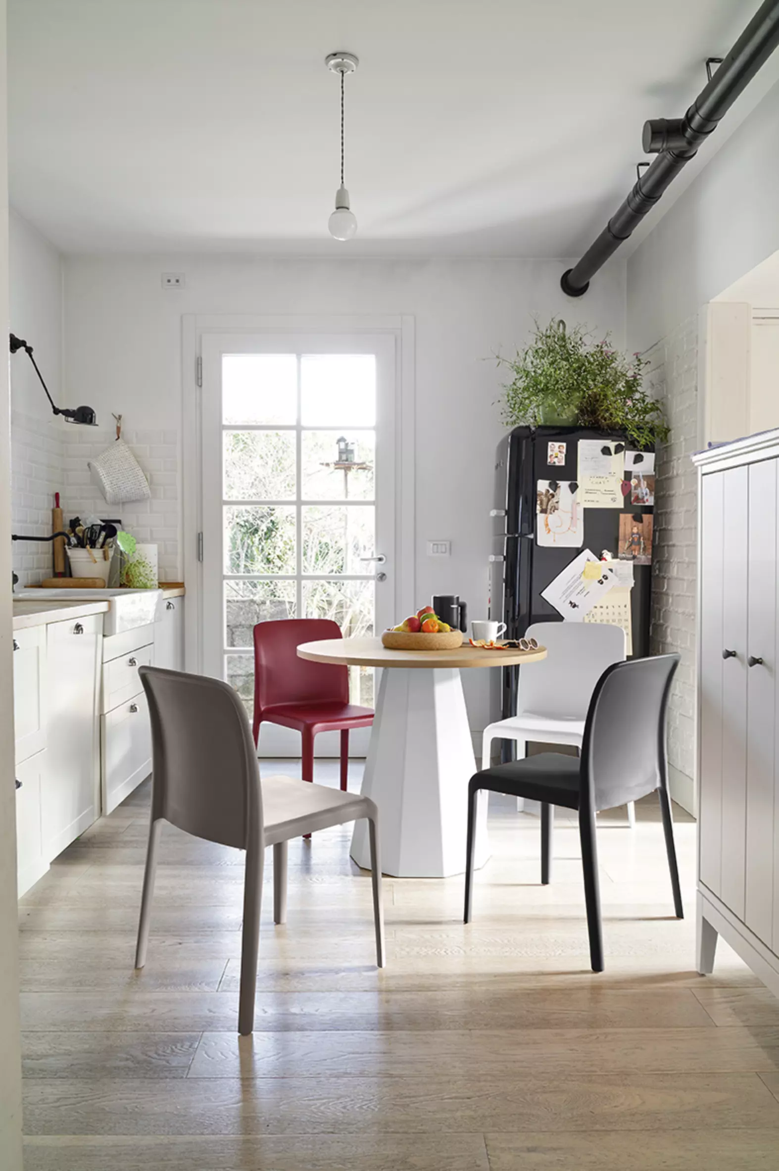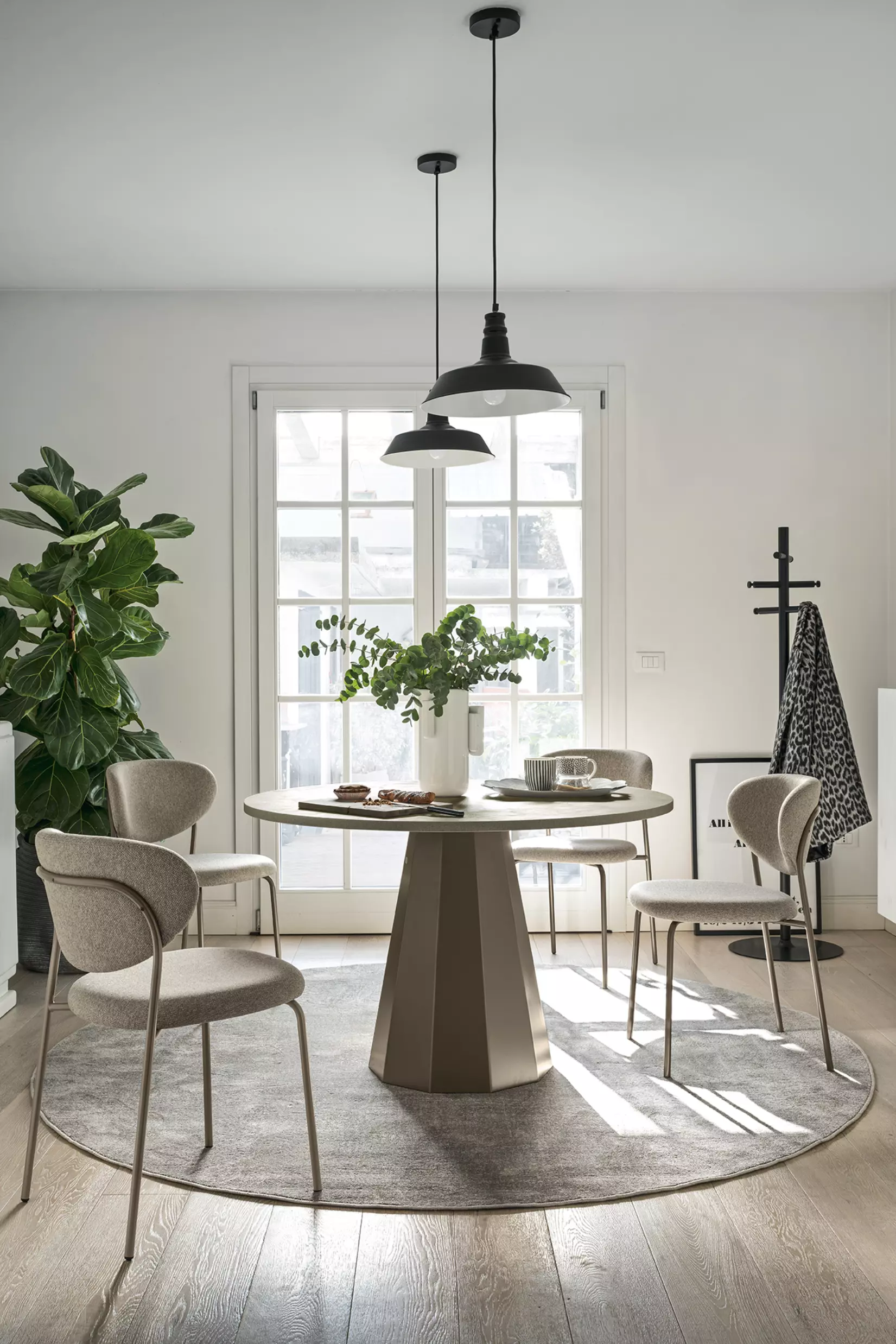 Eine runde Tischplatte vervollständigt das Design-Erlebnis und ist verfügbar in interessanten Folierungen, HPL Laminaten oder ganz klassisch weiß matt lackiert.