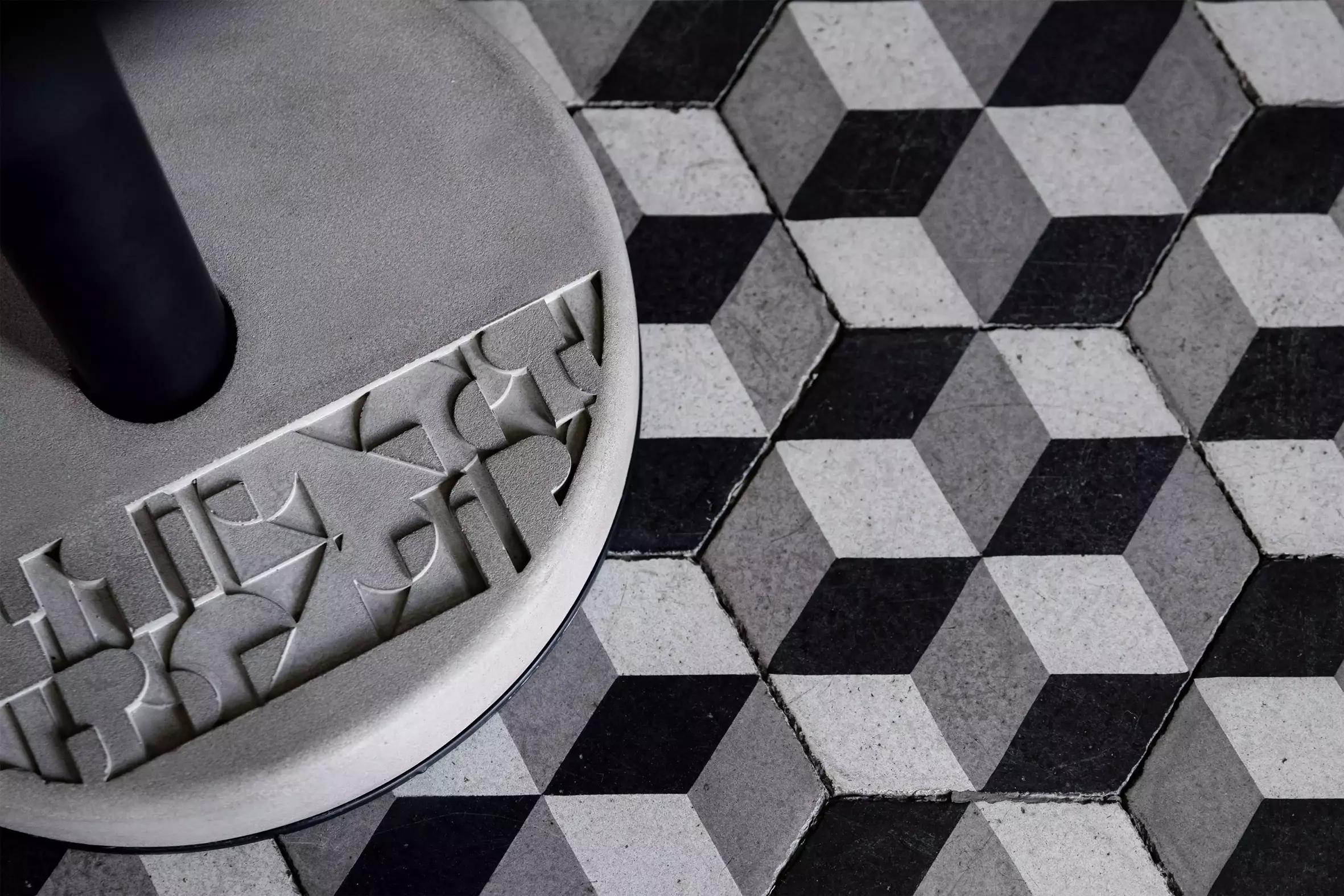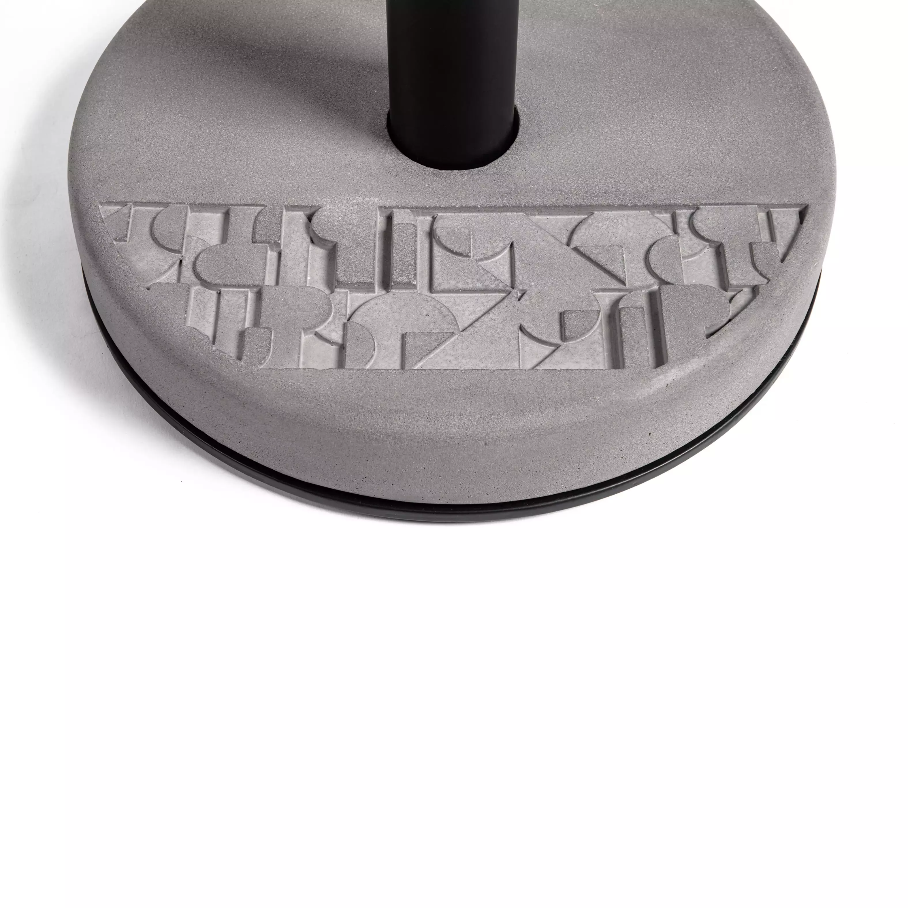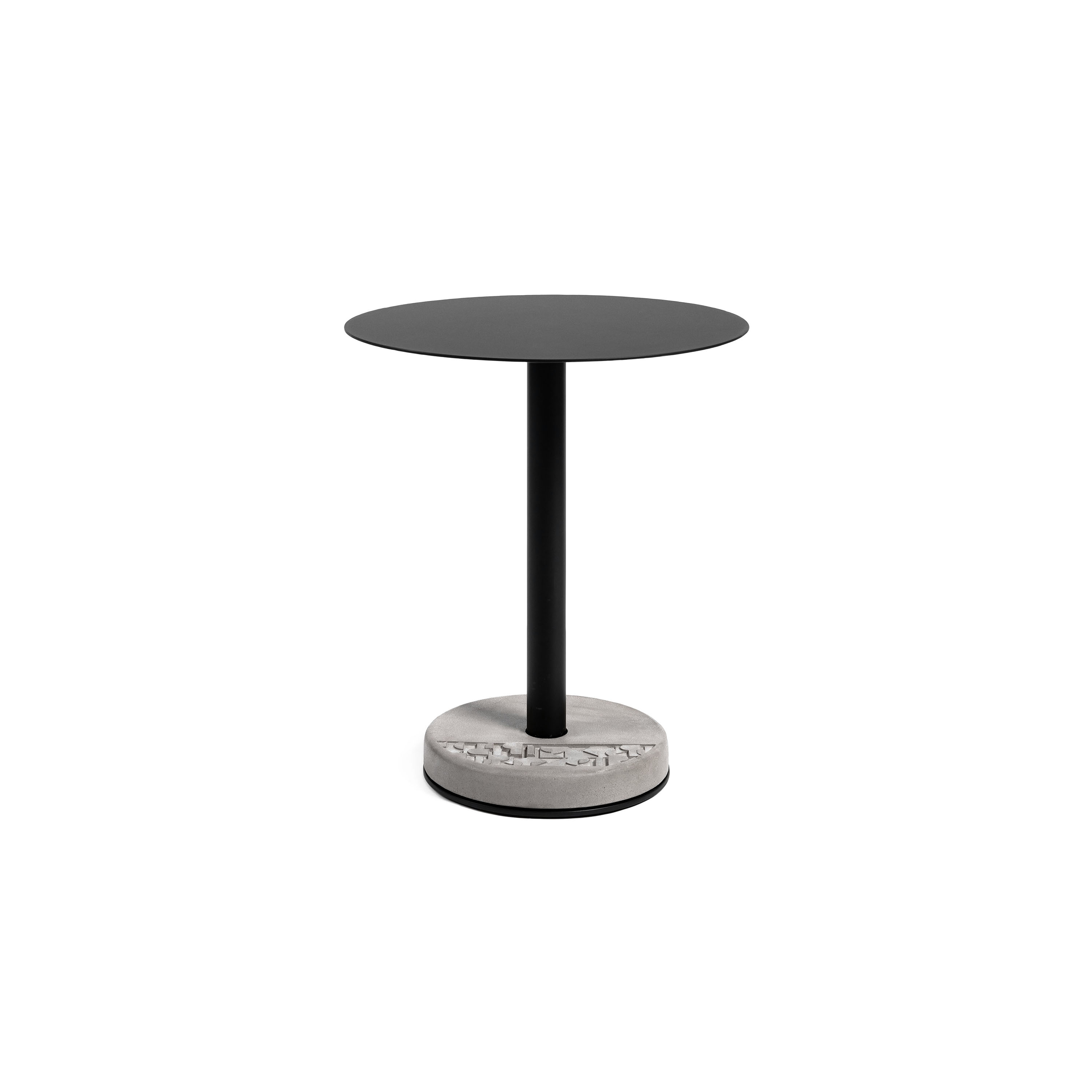 Beton dient als Ballast – und ein gut aussehender Ballast dazu. Seine neutrale Farbe setzt die lackierten Metallkomponenten des Tisches gekonnt in Szene. Der Relief-Fries – teilweise brutalistisch, teilweise Art Deco – verstärkt die Persönlichkeit. Der Fries lädt dazu ein, mit Details zu spielen. Ändere die Ausrichtung des Ballasts zur Tischplatte und bring einen völlig neuen visuellen Rhythmus in deinen Raum.