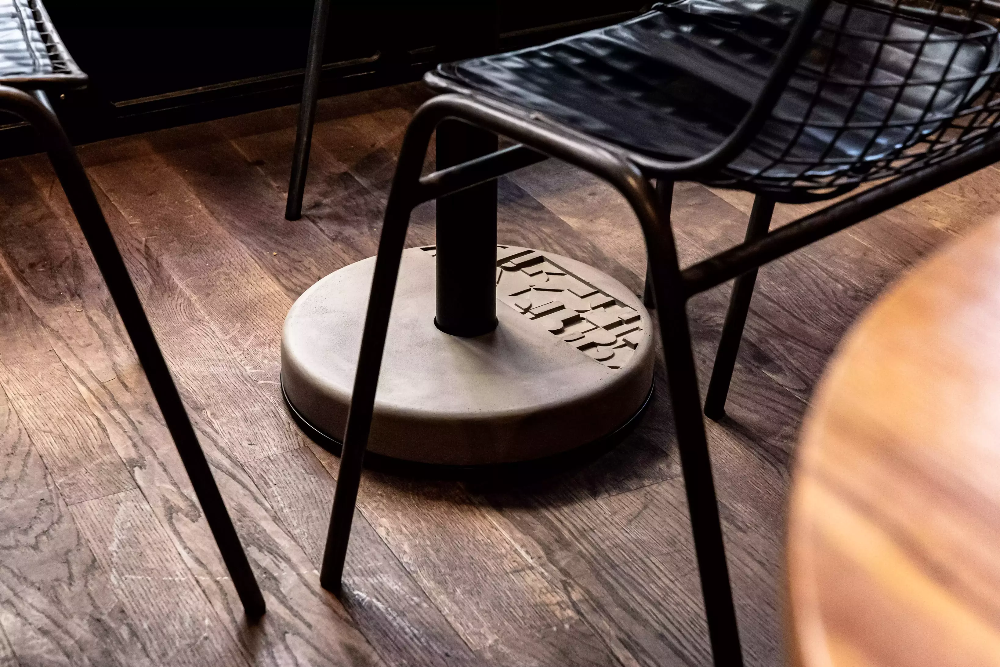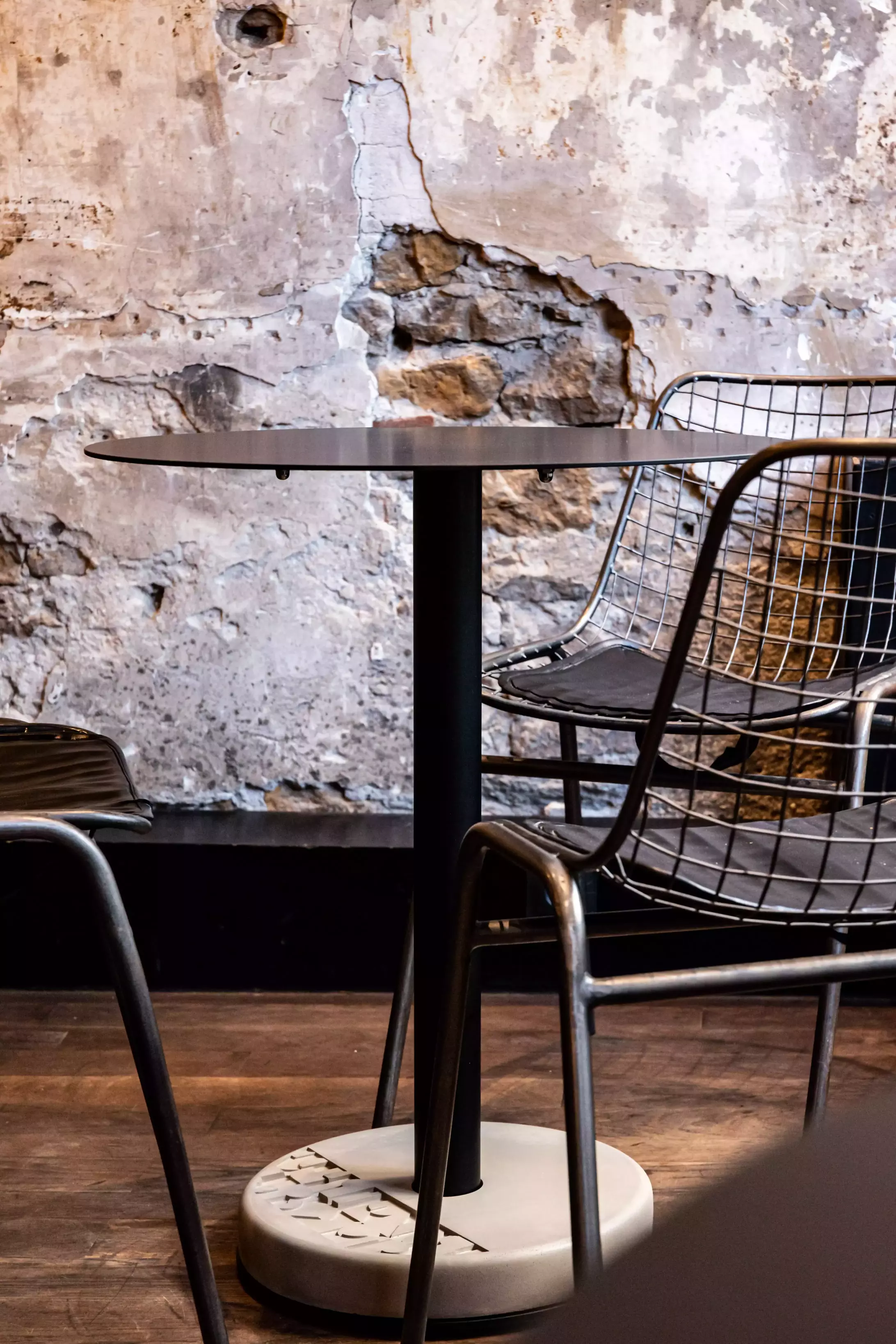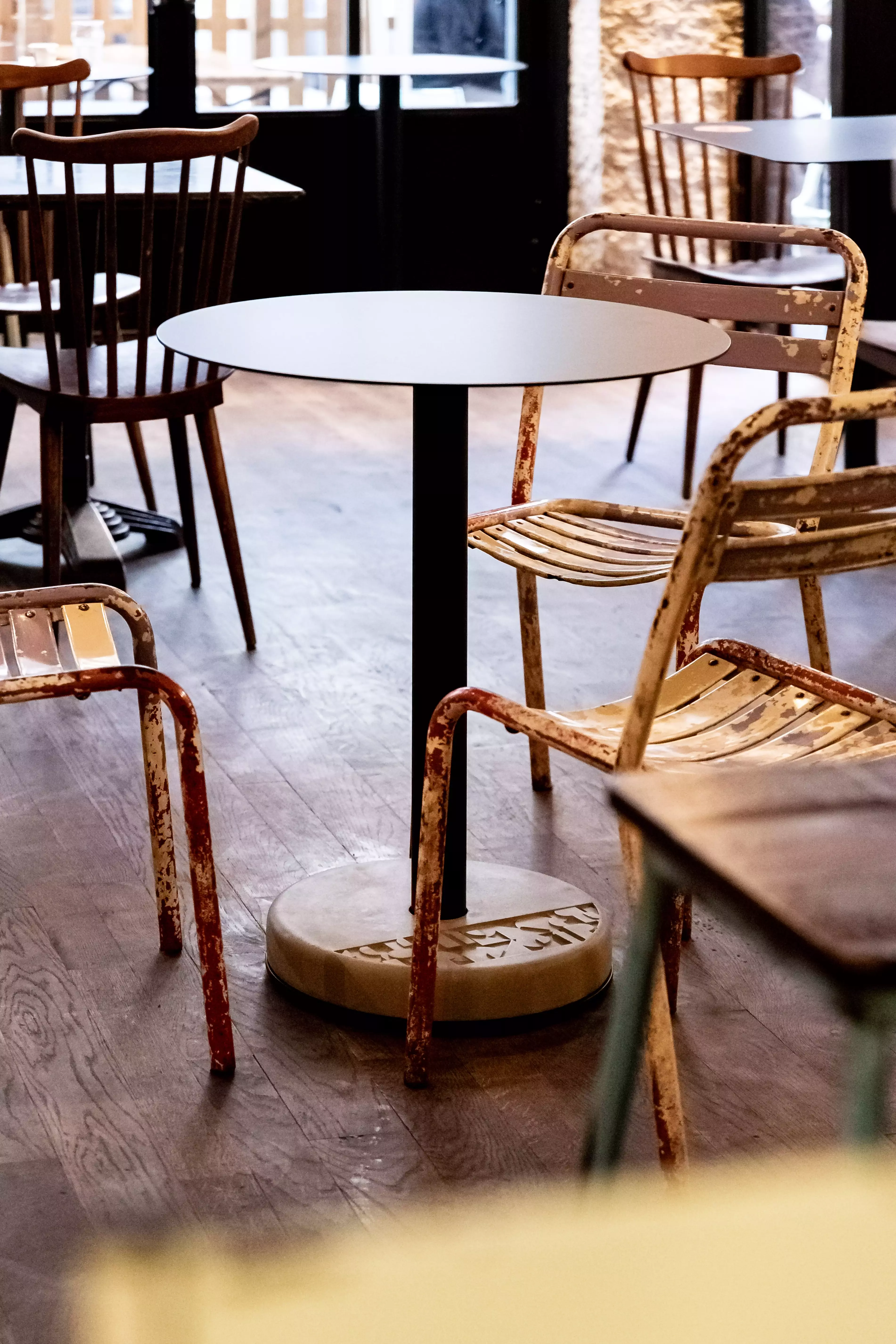 Form und Funktion sind vertraut: Diese kleinen Tische eignen sich perfekt für ein intimes Mahl, können aber auch kombiniert werden, um eine Menschenmenge zu beherbergen. Die Materialien hingegen sind entschieden modern. Schluss mit Gusseisen, Holz und Zink. An ihrer Stelle: Aluminium und unser berühmter Beton als Ballast.