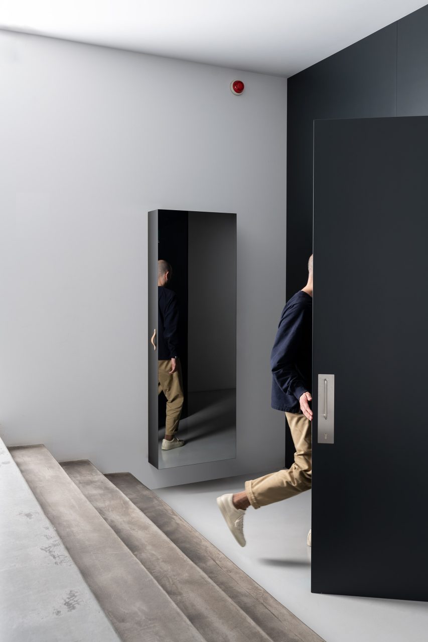 Die Kristalia BoxOne kann in beiden Richtungen aufgehängt werden, wodurch das Öffnen der Tür nach rechts oder links möglich ist.