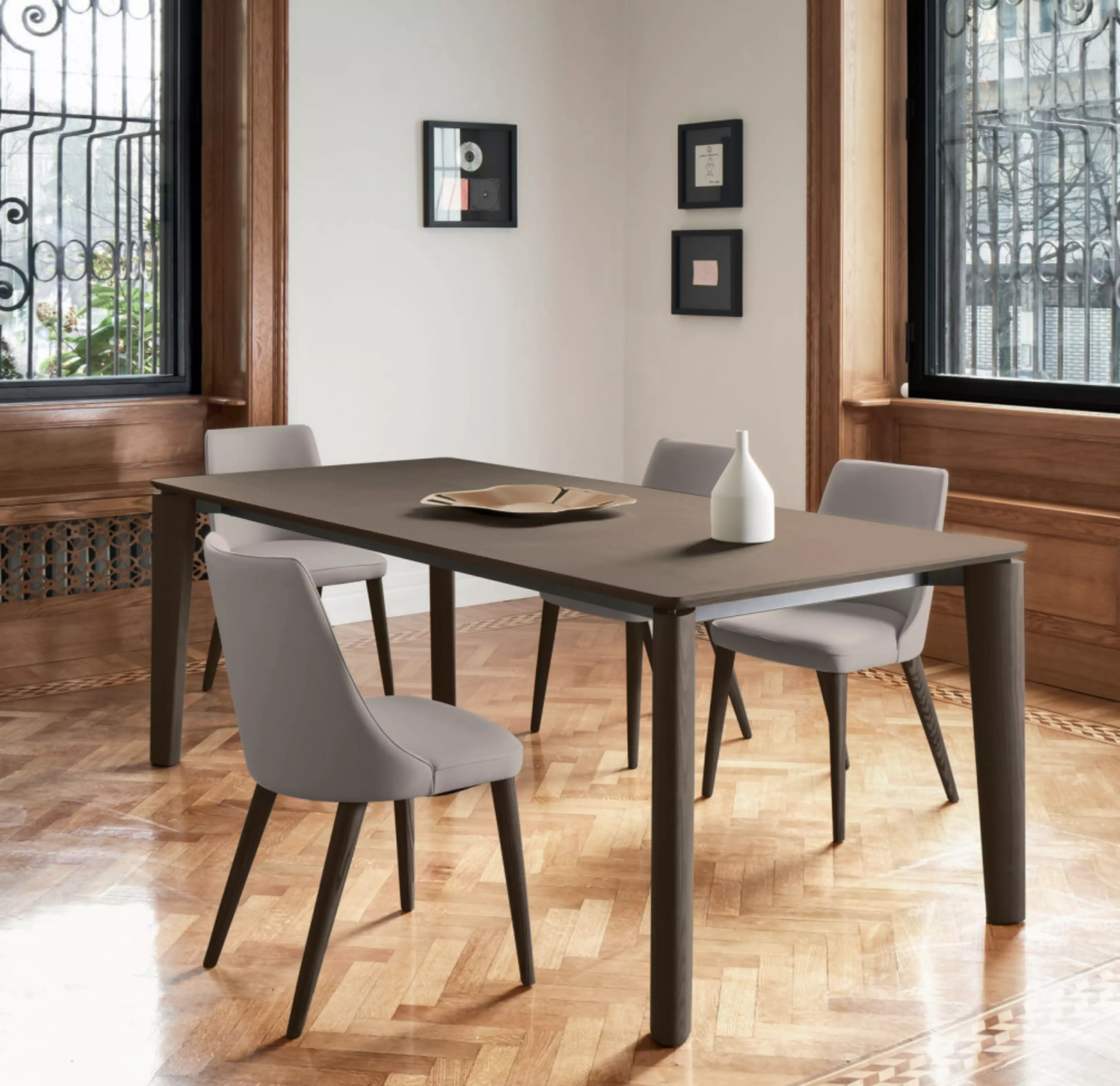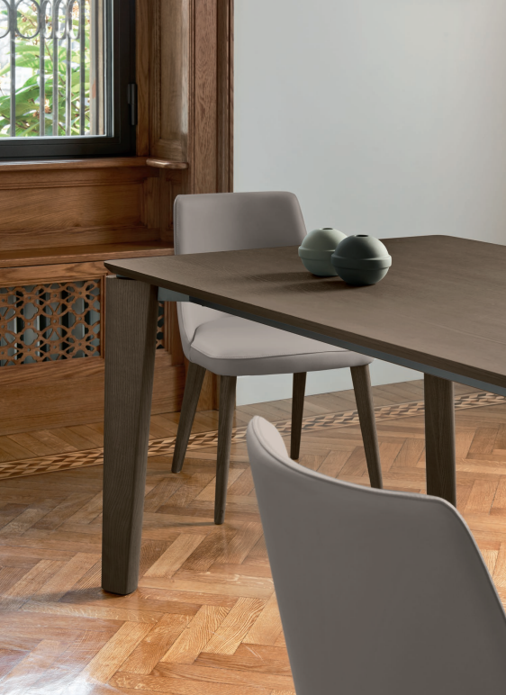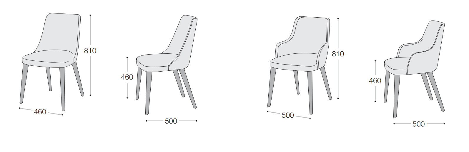 Der Polsterstuhl Elena Elena ist auch in einer Version mit Armlehnen erhältlich, immer mit einem umschließenden Design.