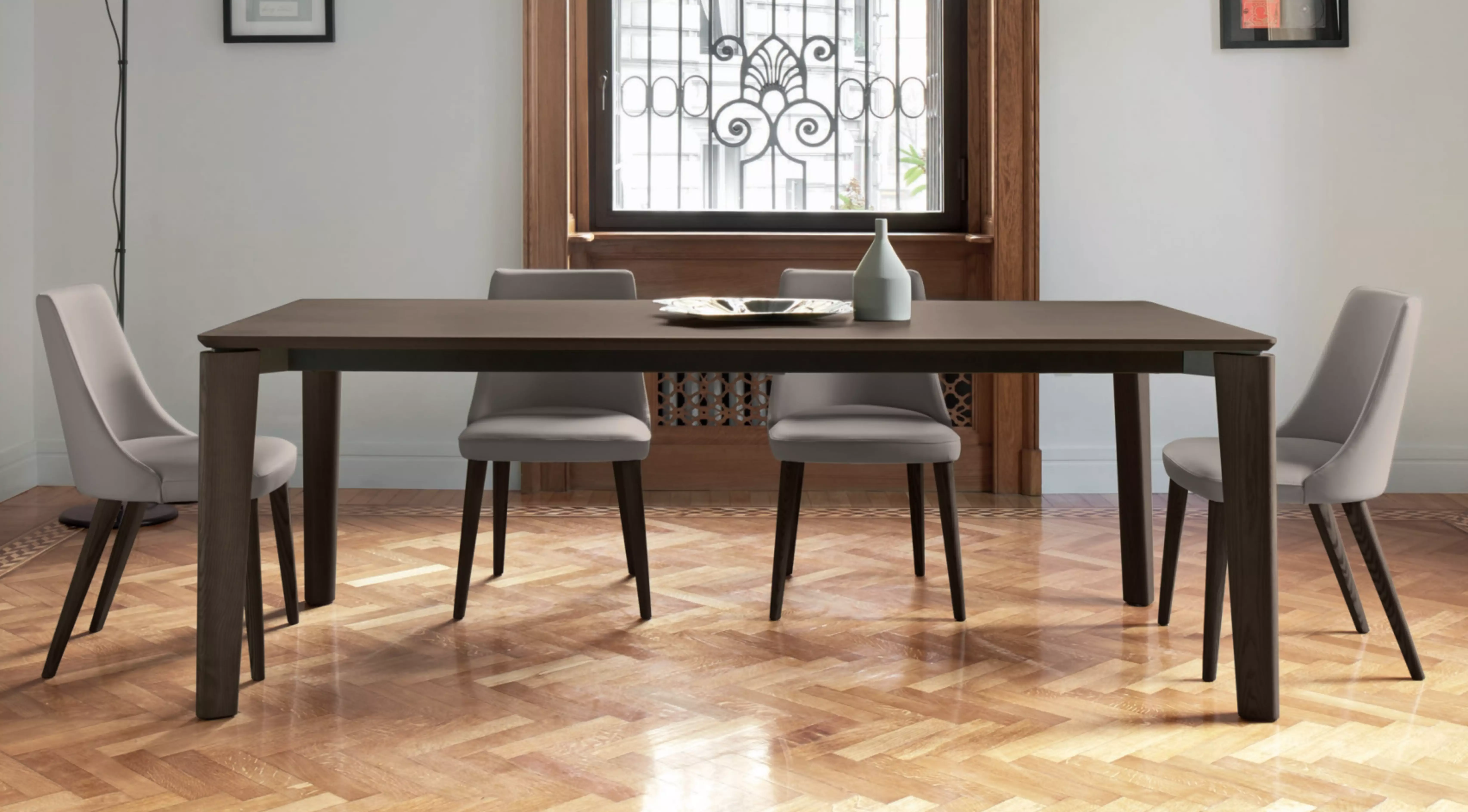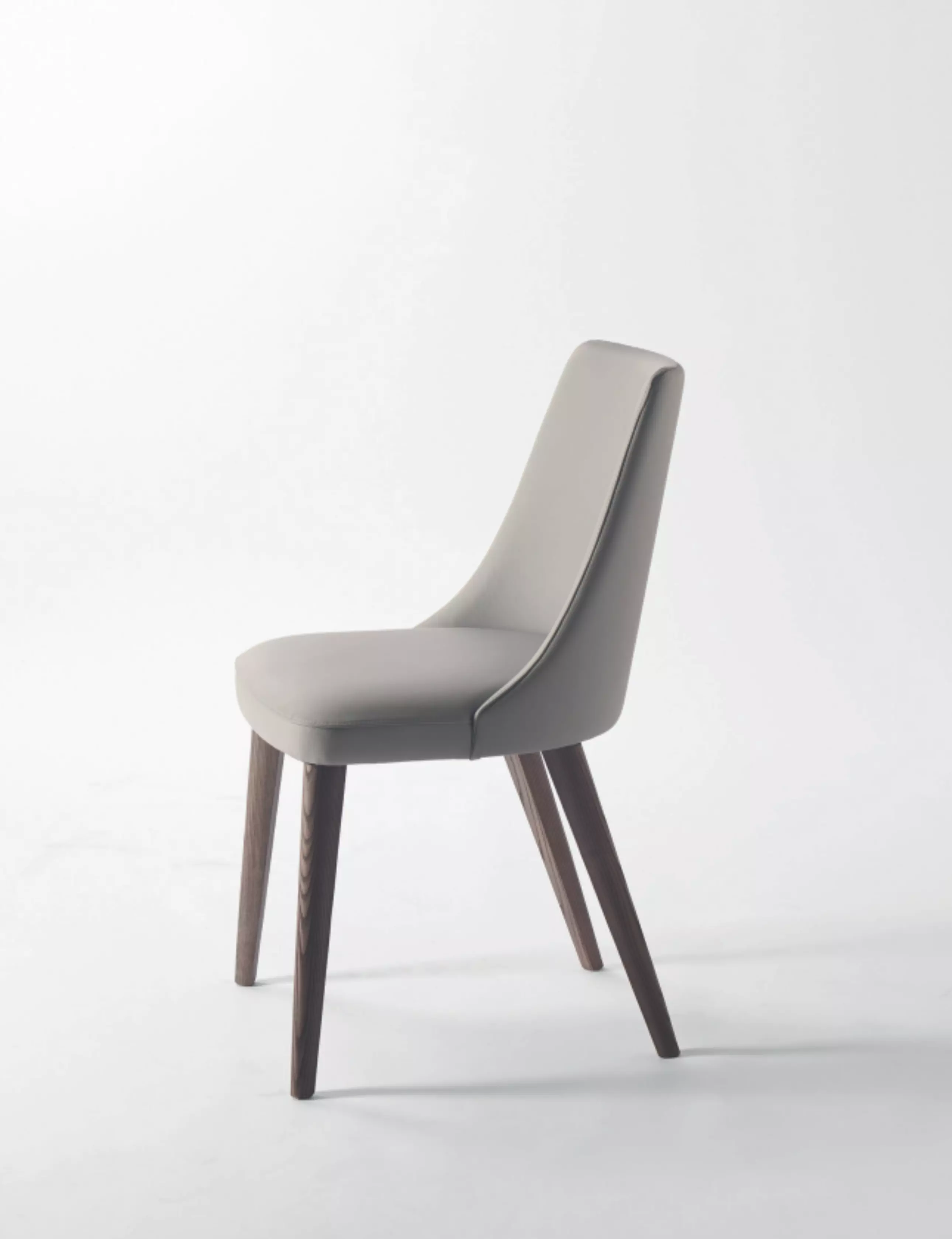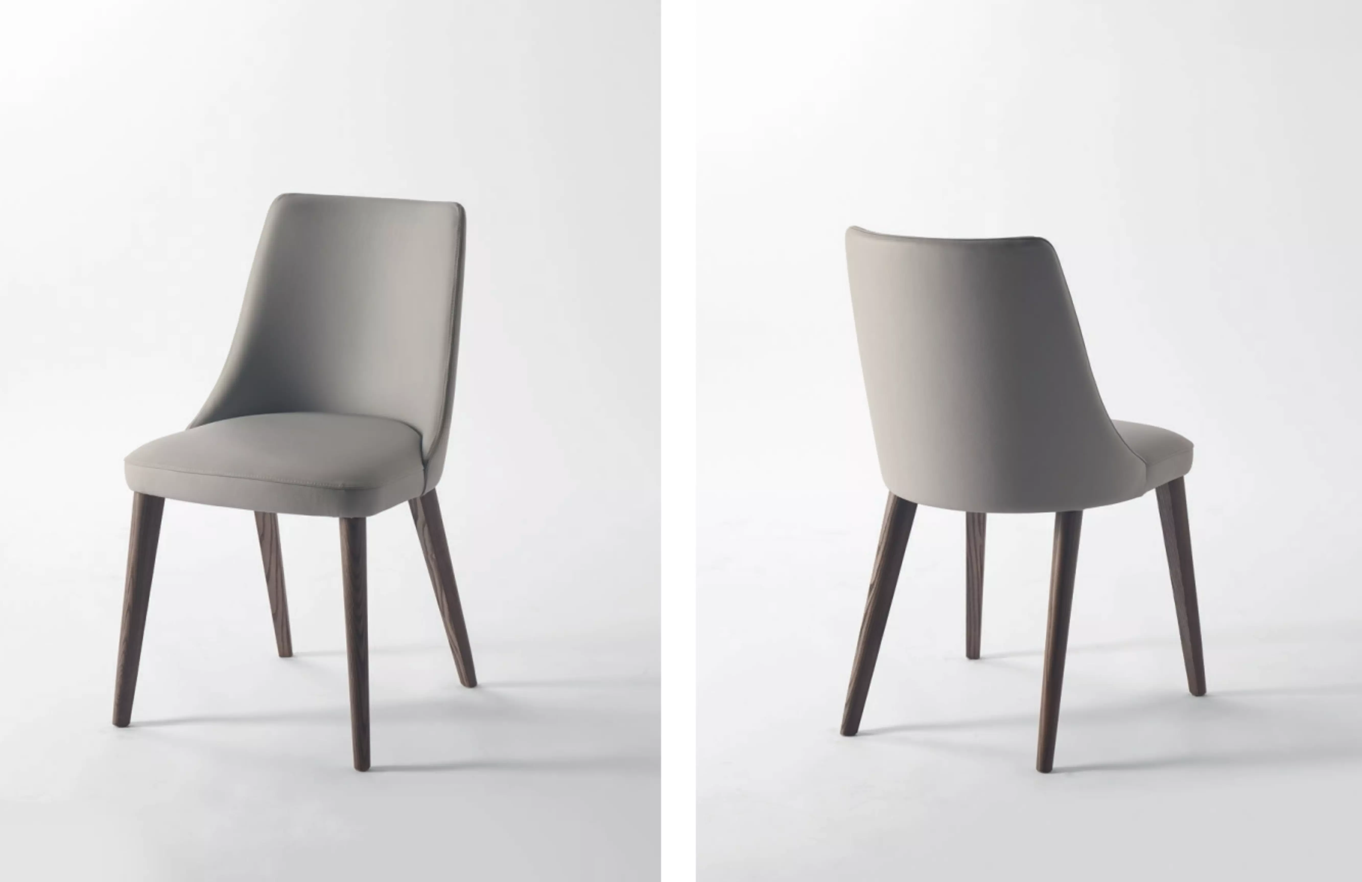 Der Polsterstuhl Elena verbindet umschließende Linien mit dynamischer Vielseitigkeit in der Nutzung.
