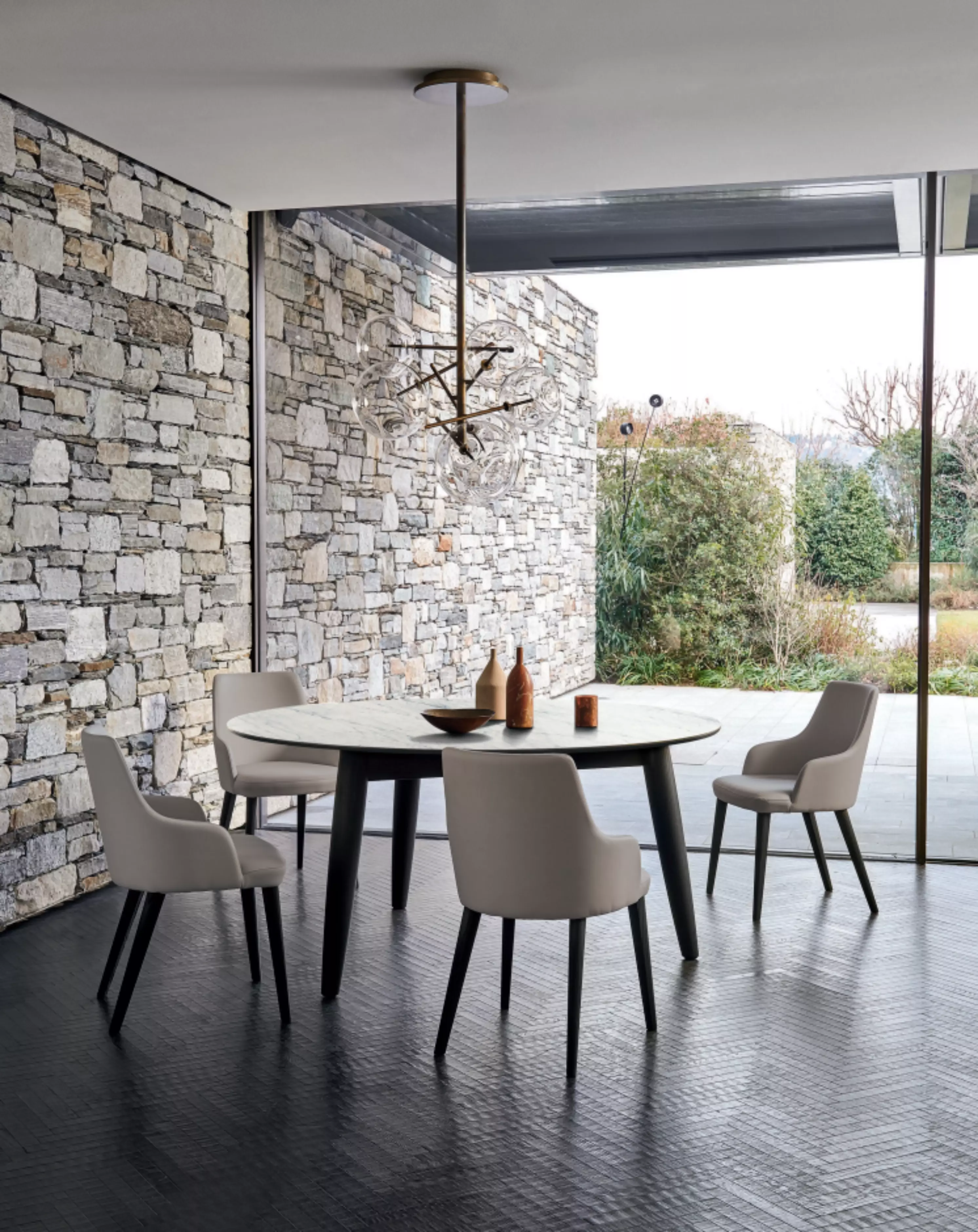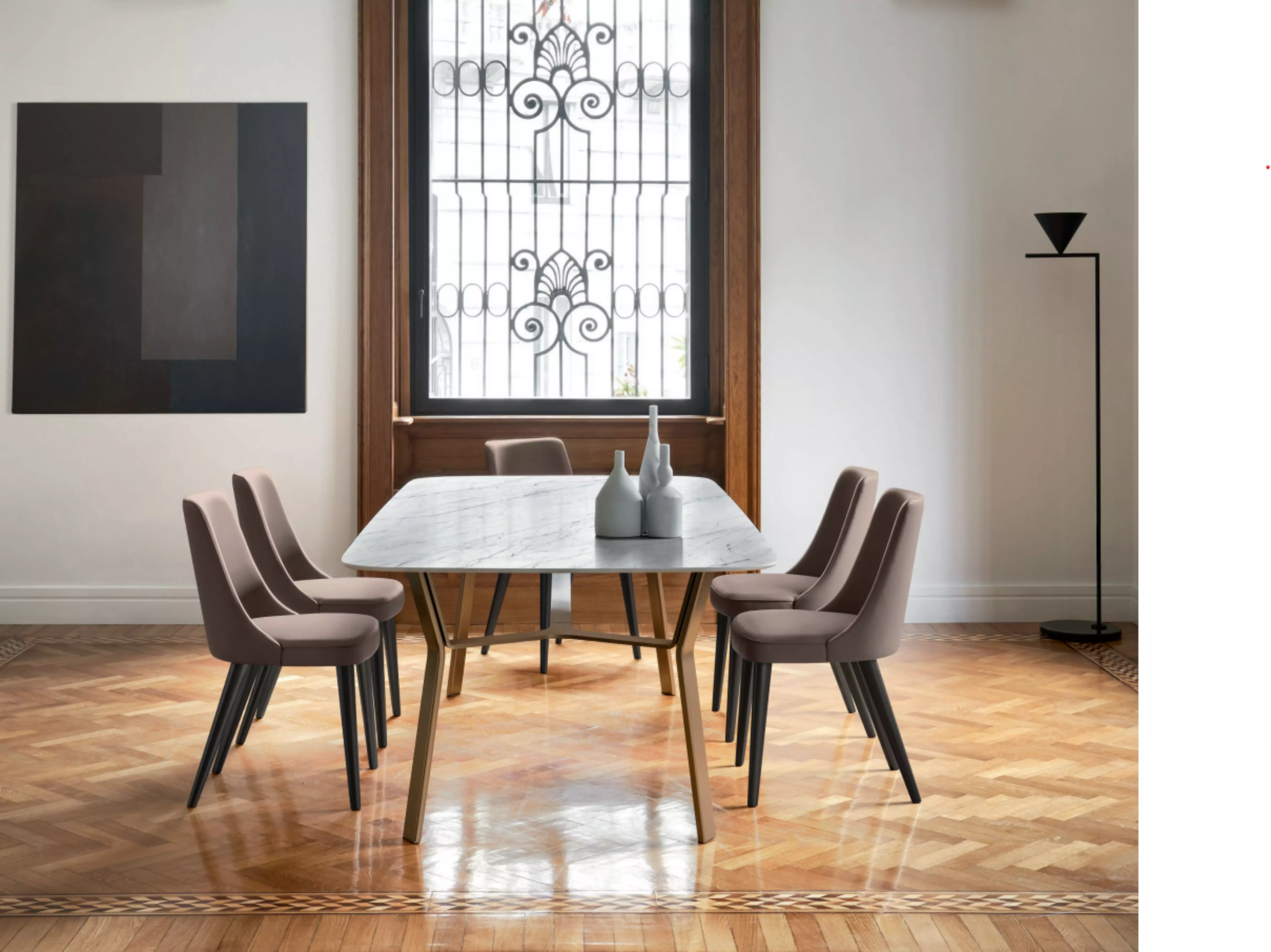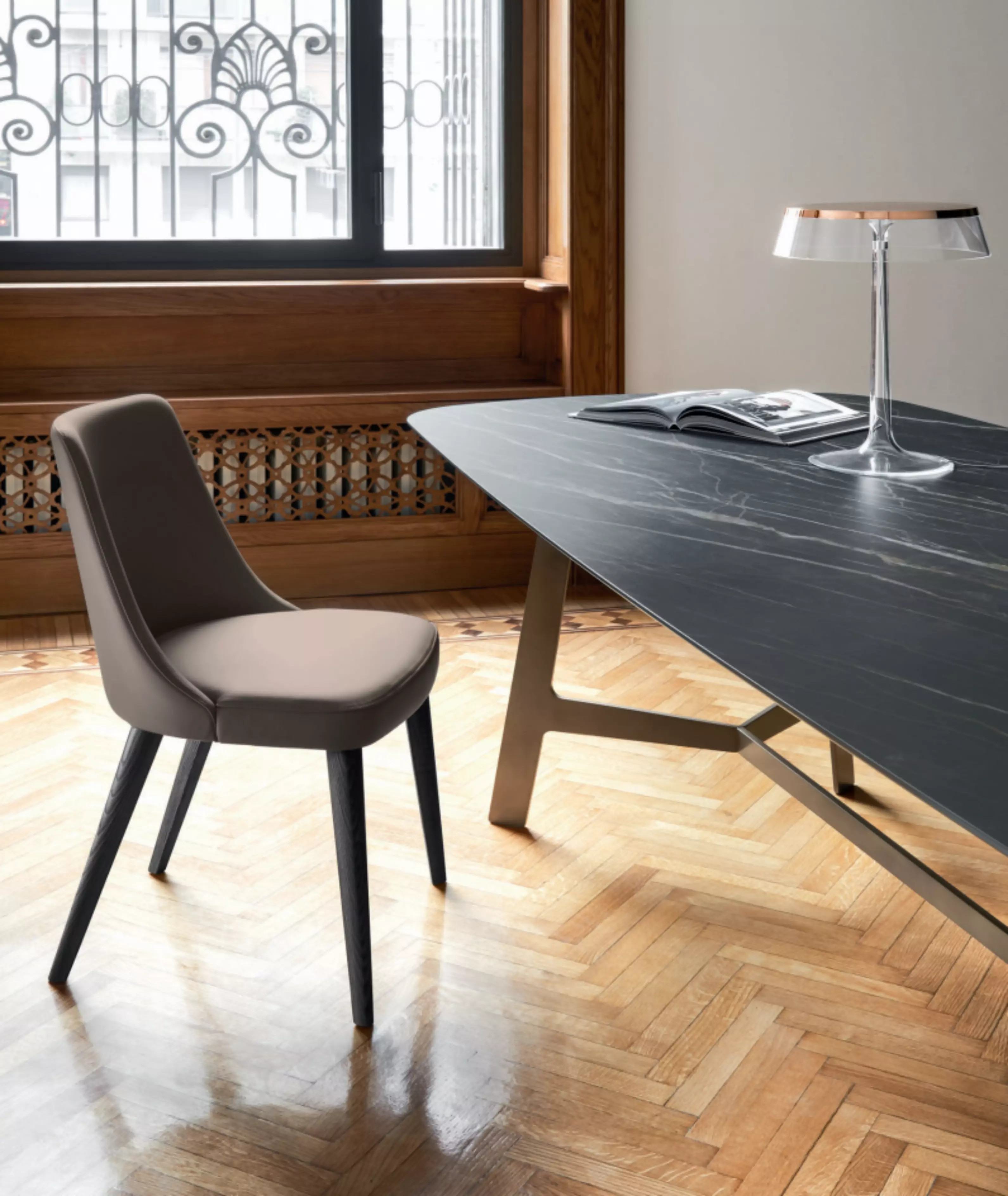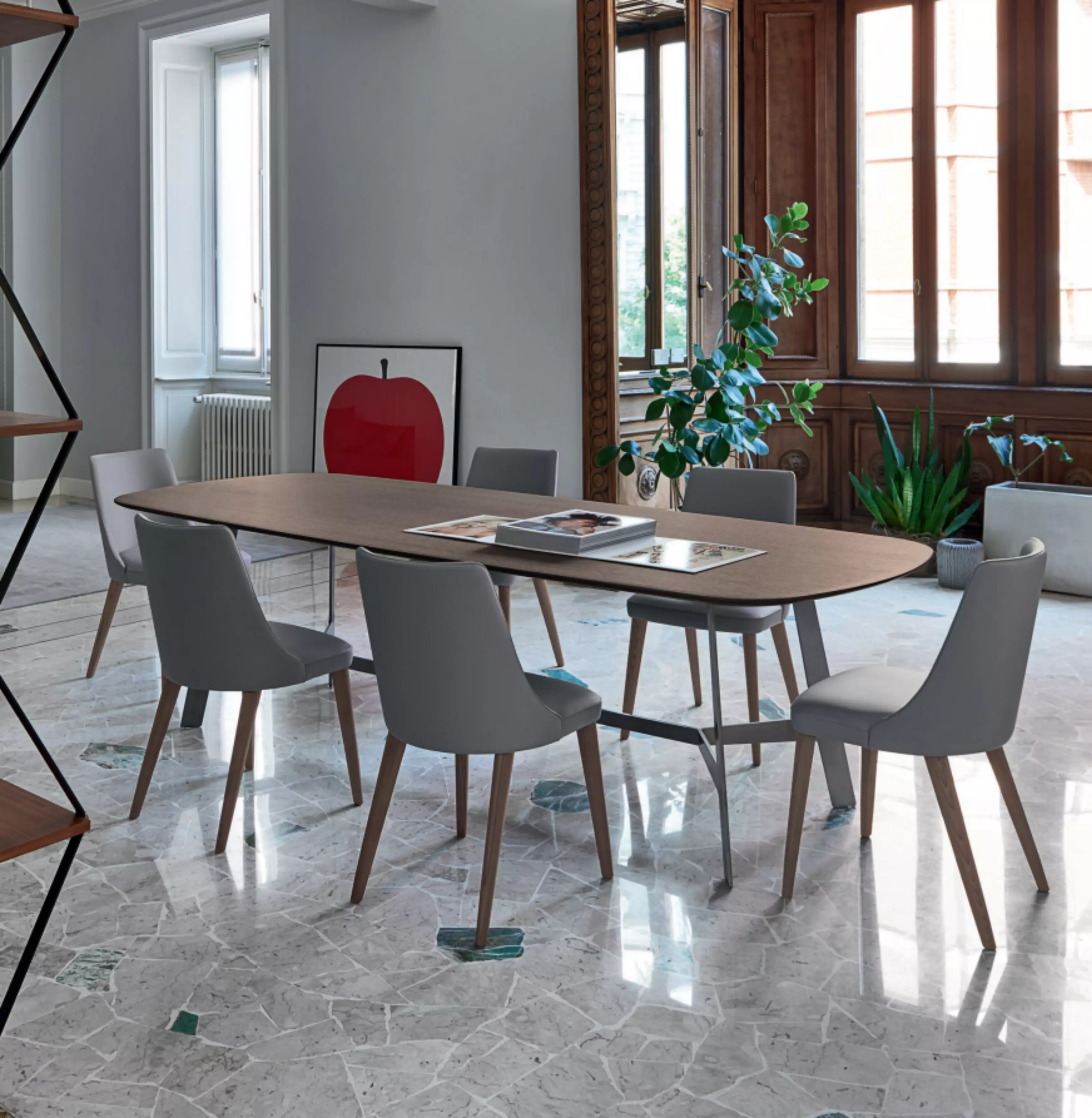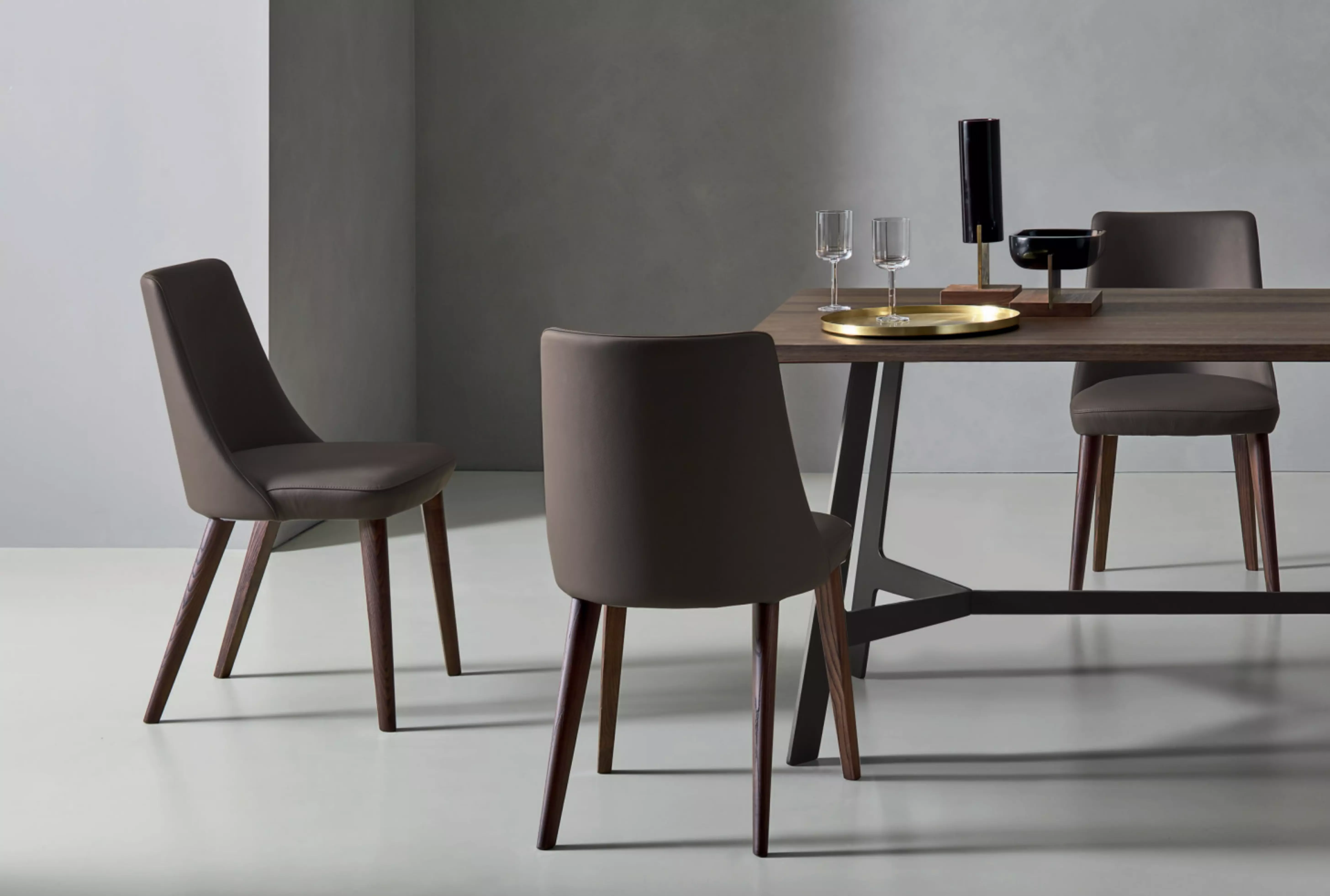 Der Polsterstuhl Elena Elena ist auch in einer Version mit Armlehnen erhältlich, immer mit einem umschließenden Design.