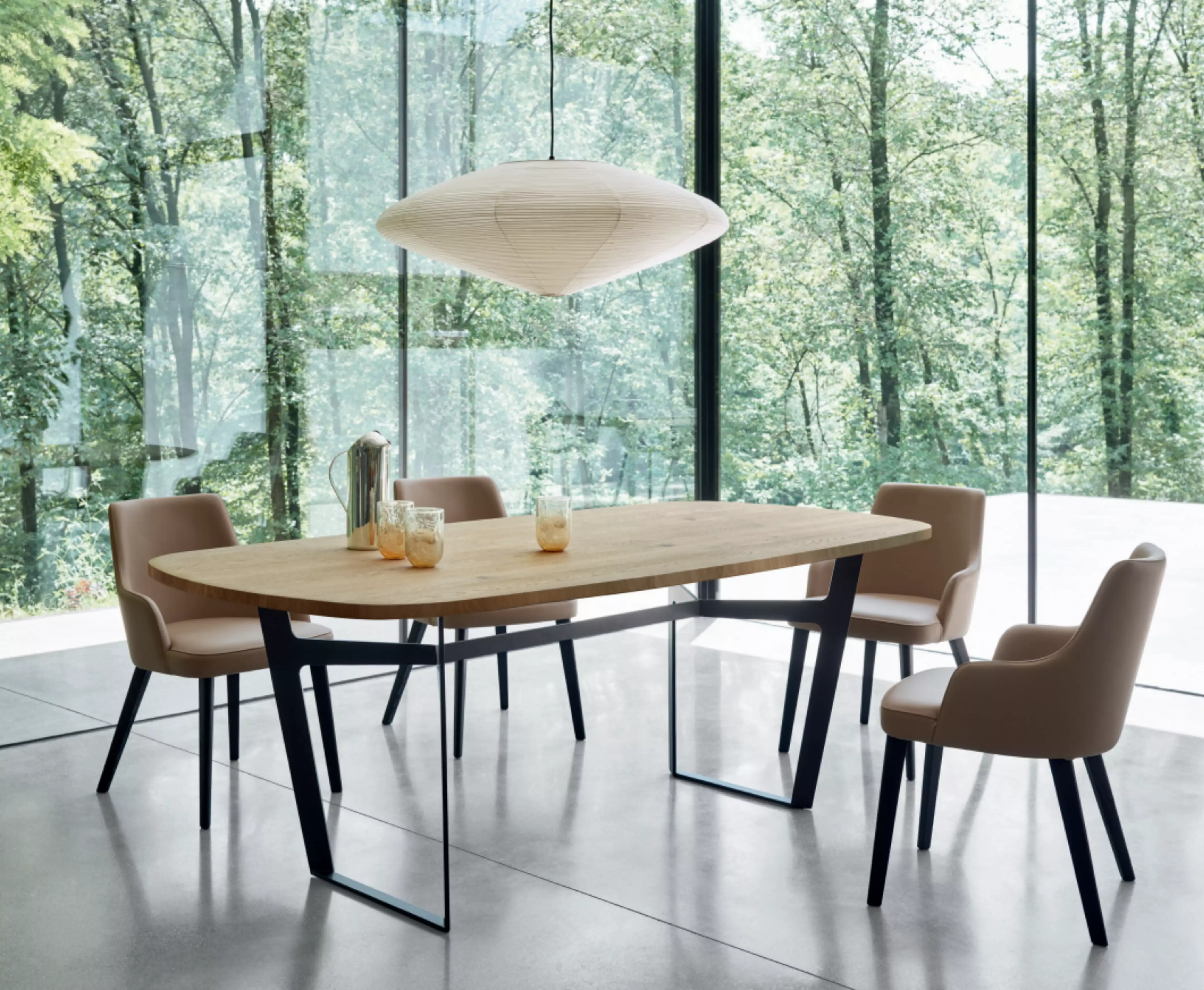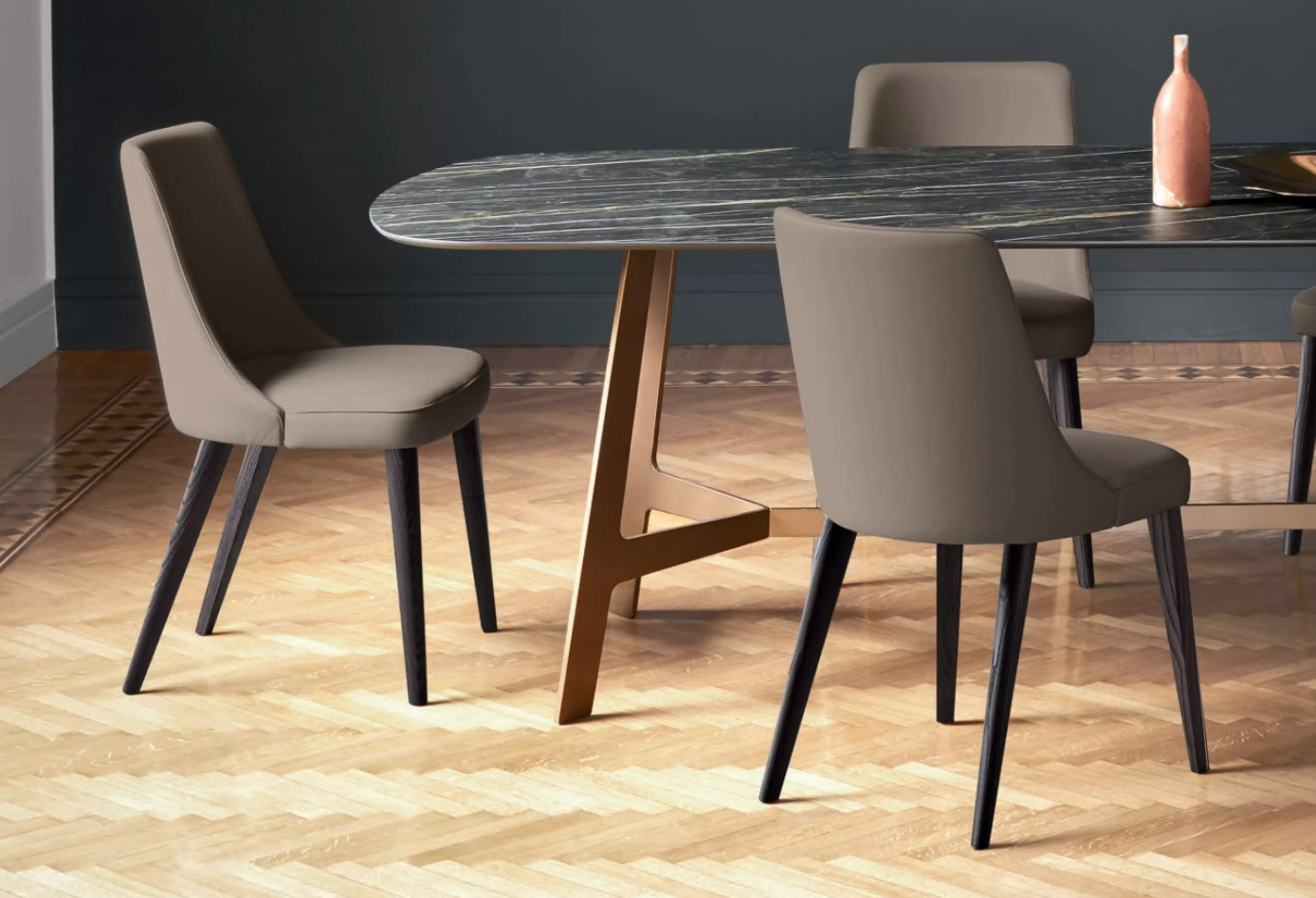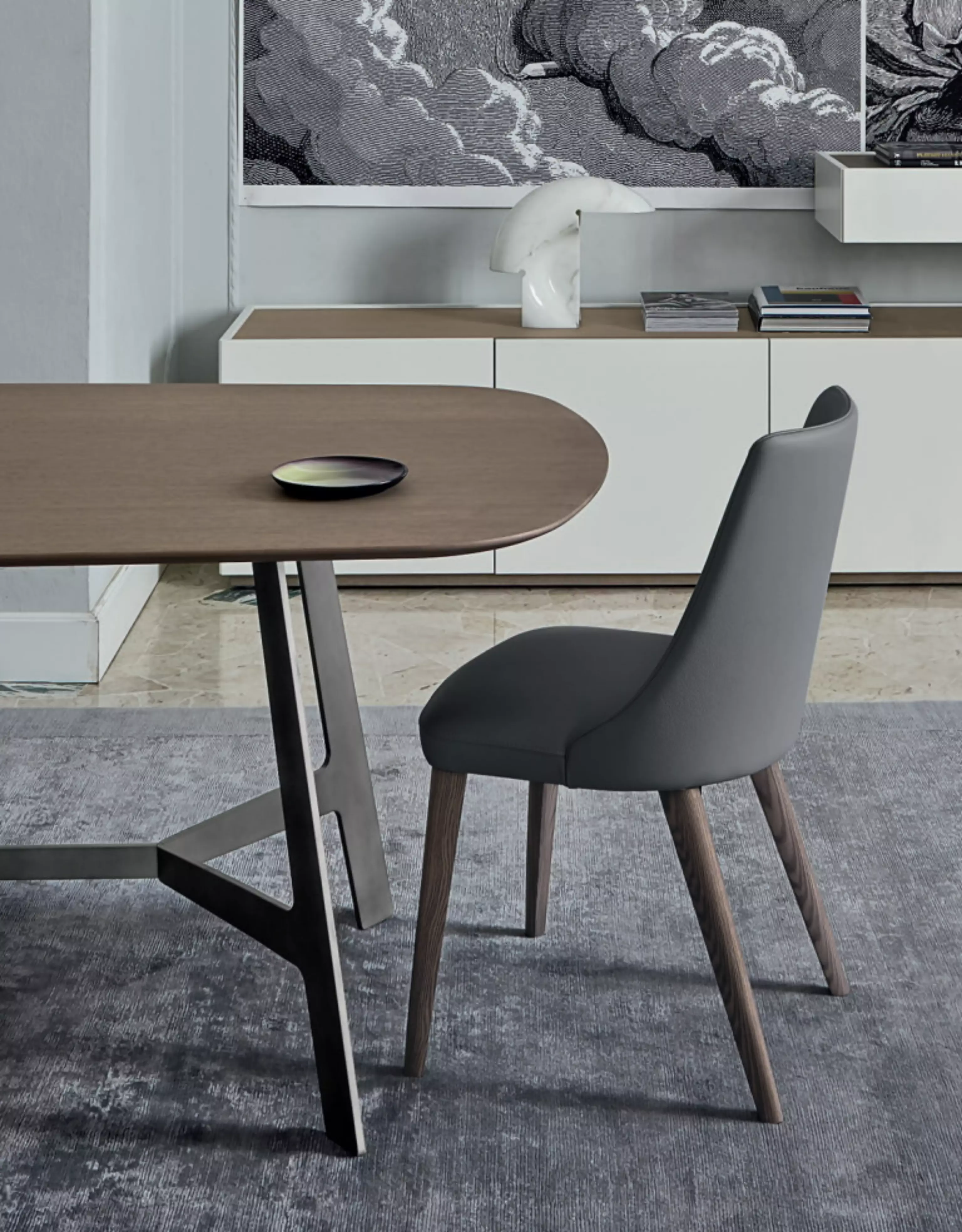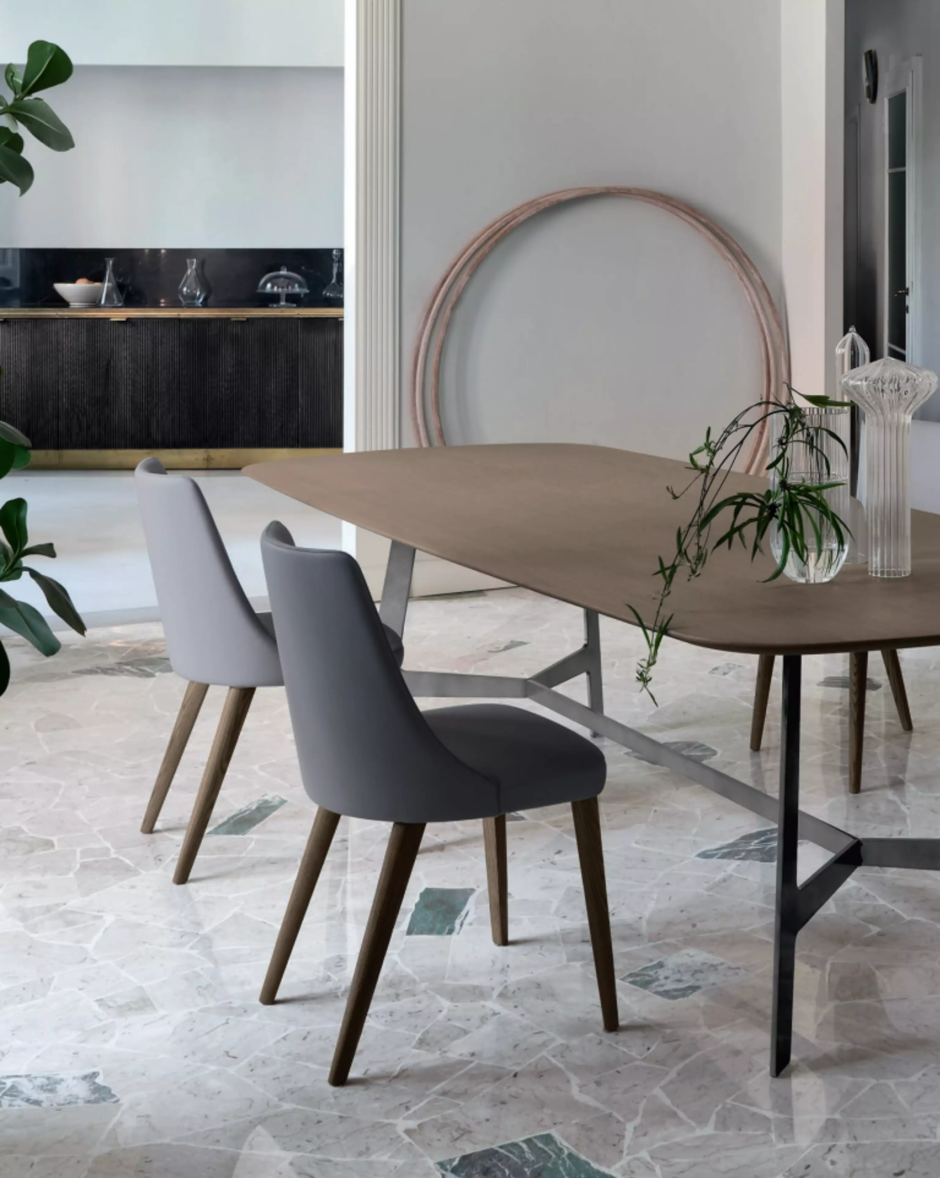 Der Polsterstuhl Elena Elena ist auch in einer Version mit Armlehnen erhältlich, immer mit einem umschließenden Design.