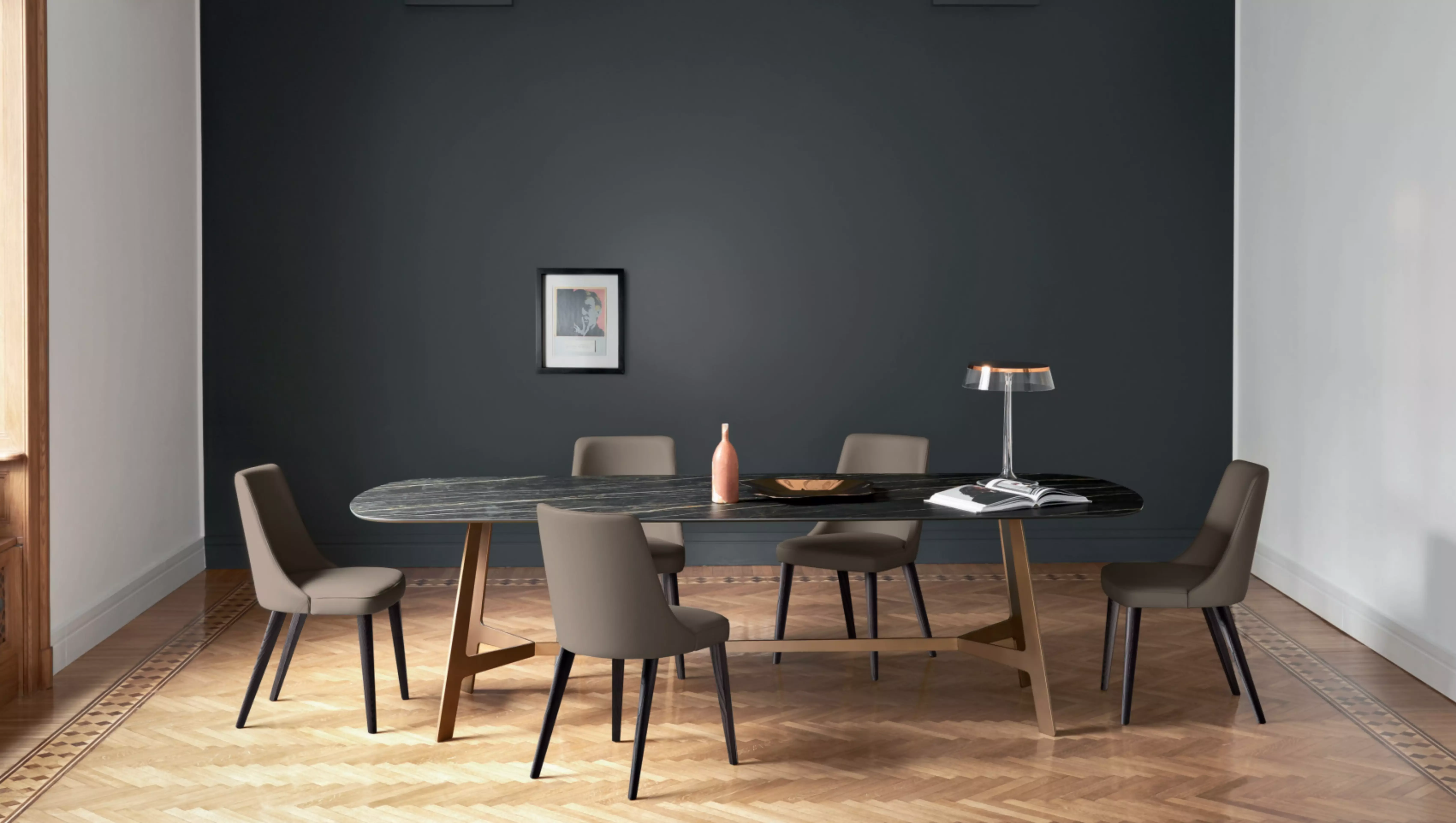 Das Gestell besteht aus massiver Esche, gebeizt in verschiedenen distinguierten Tönen.