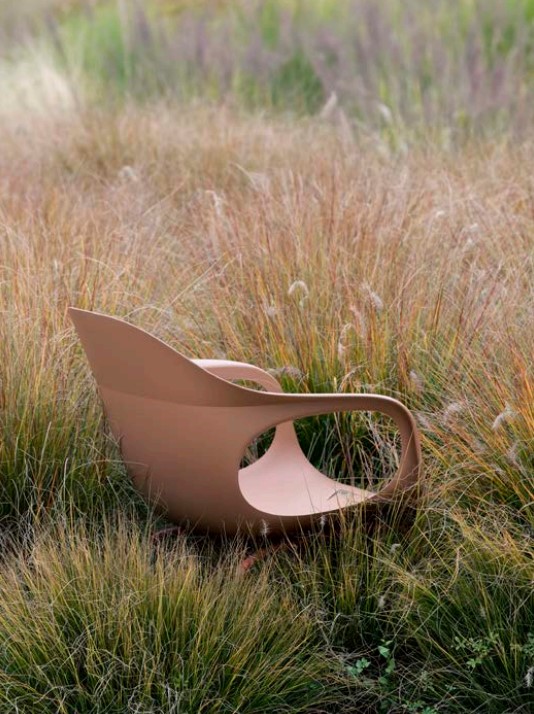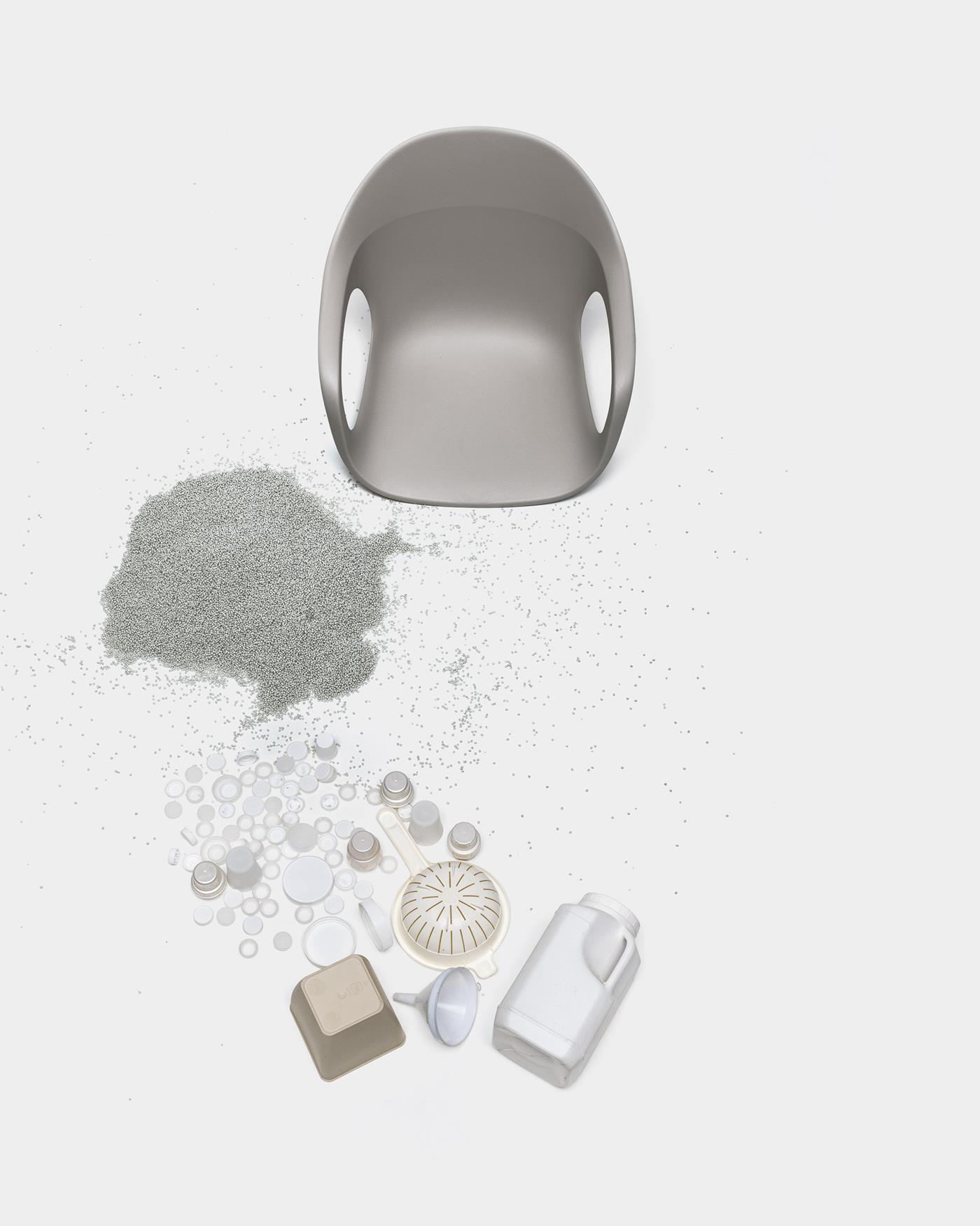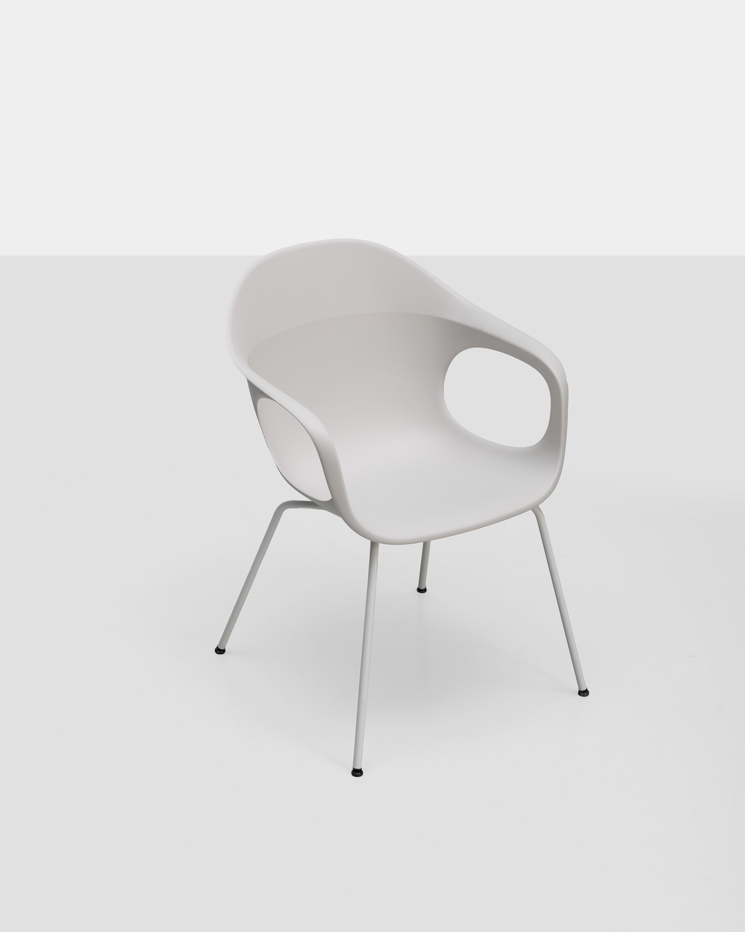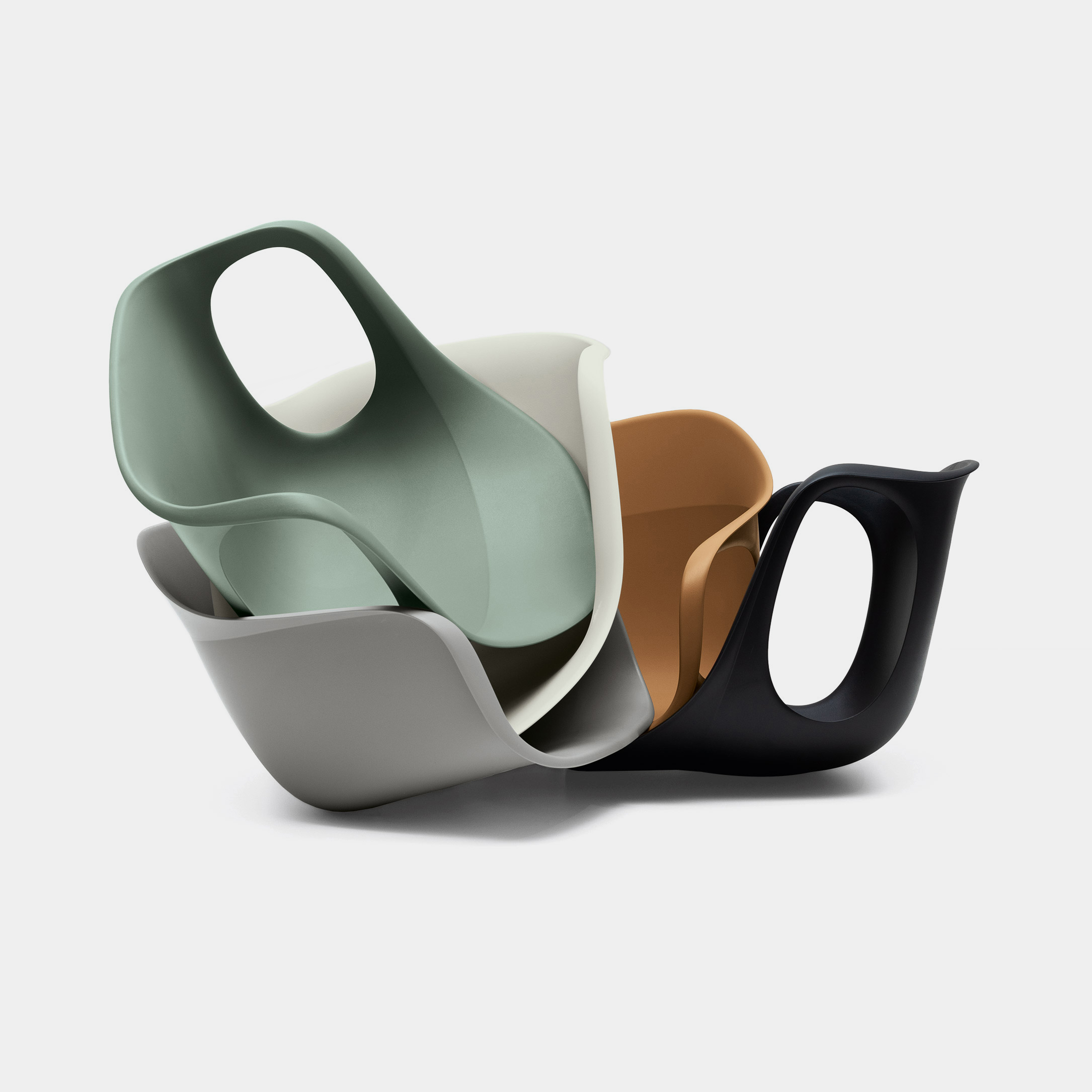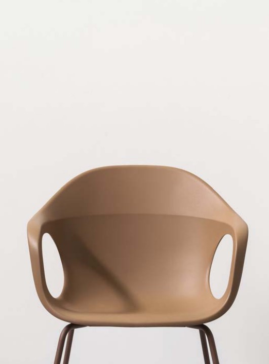 Die Sitzschale aus Polypropylen mit Armlehnen ähnelt der des Sessels und greift die charakteristische Rippenverstärkung der Version mit Lederbezug auf, die vom Rückgrat eines Elefanten inspiriert ist.