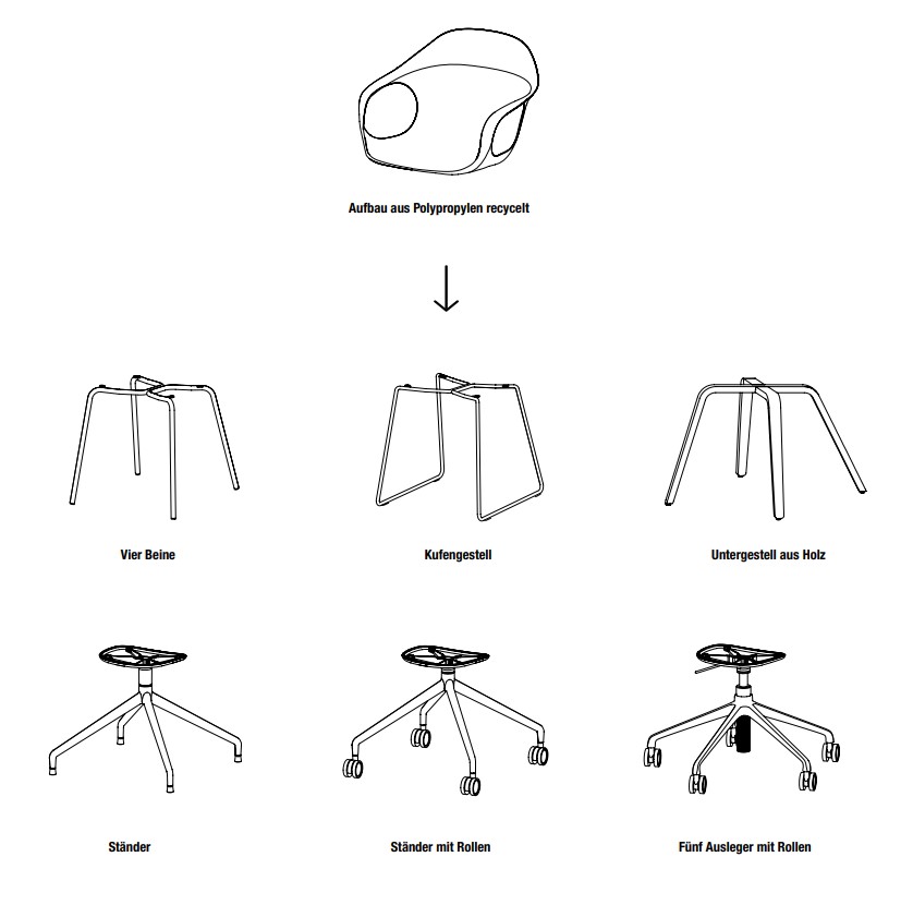 Beide Varianten stehen mit vier Beinen, Untergestell aus Holz, Kufengestell, drehbarem Ständer oder auf Rollen sowie Fußkreuz auf Rollen zur Auswahl.