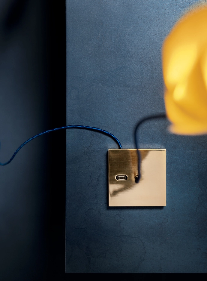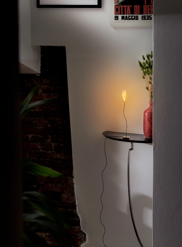 Inspiriert von der Leichtigkeit einer Wildblume, verfügt sie über einen kleinen Messingfuß und einen schlanken Stiel, der mit blauem Stoff bezogen ist und nach Ankunft der Lampe individuell geformt werden kann, um ihr eine persönliche Note zu verleihen.