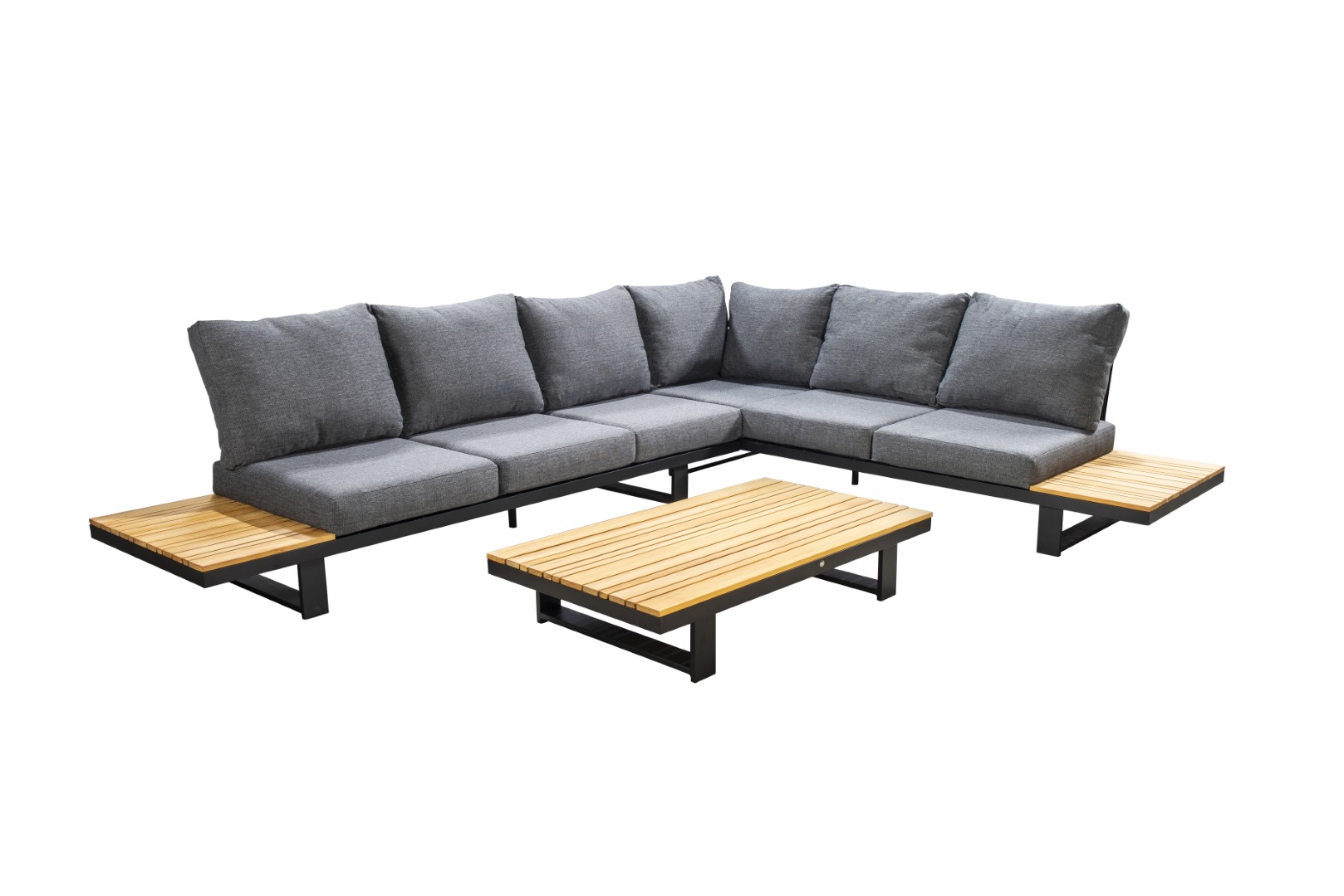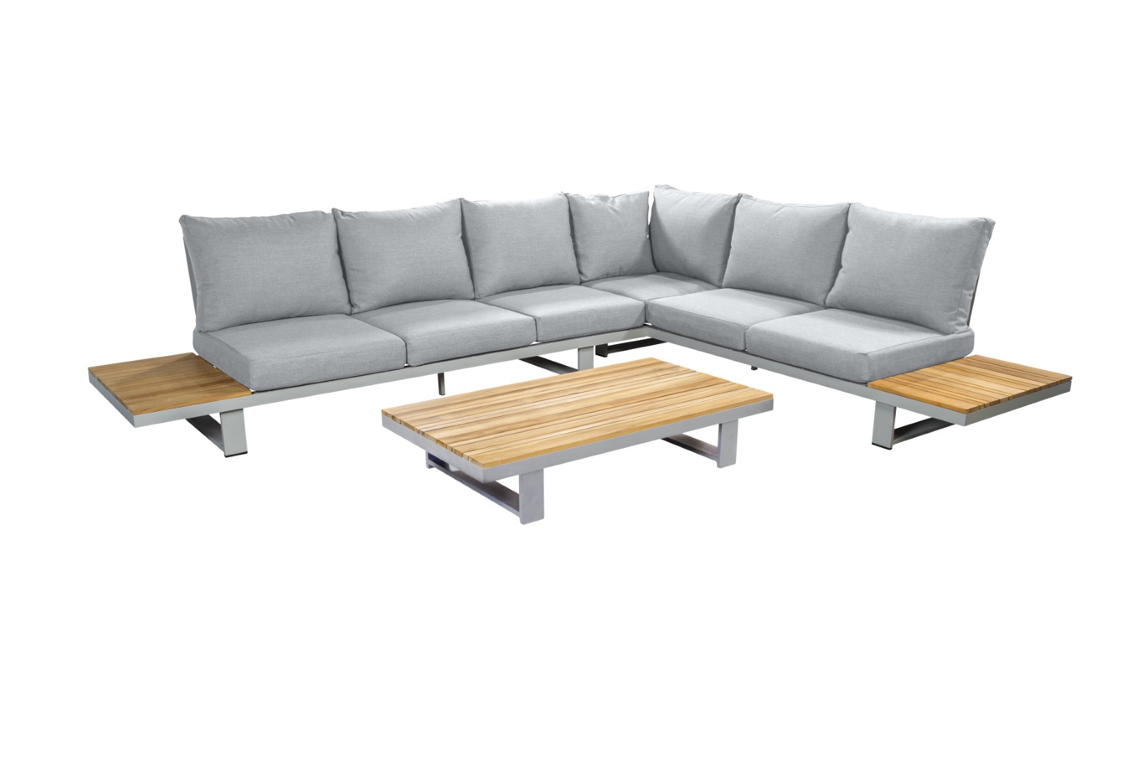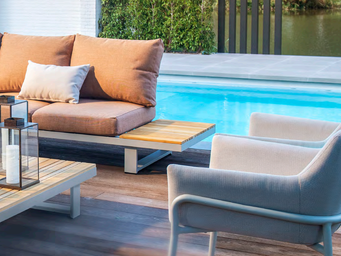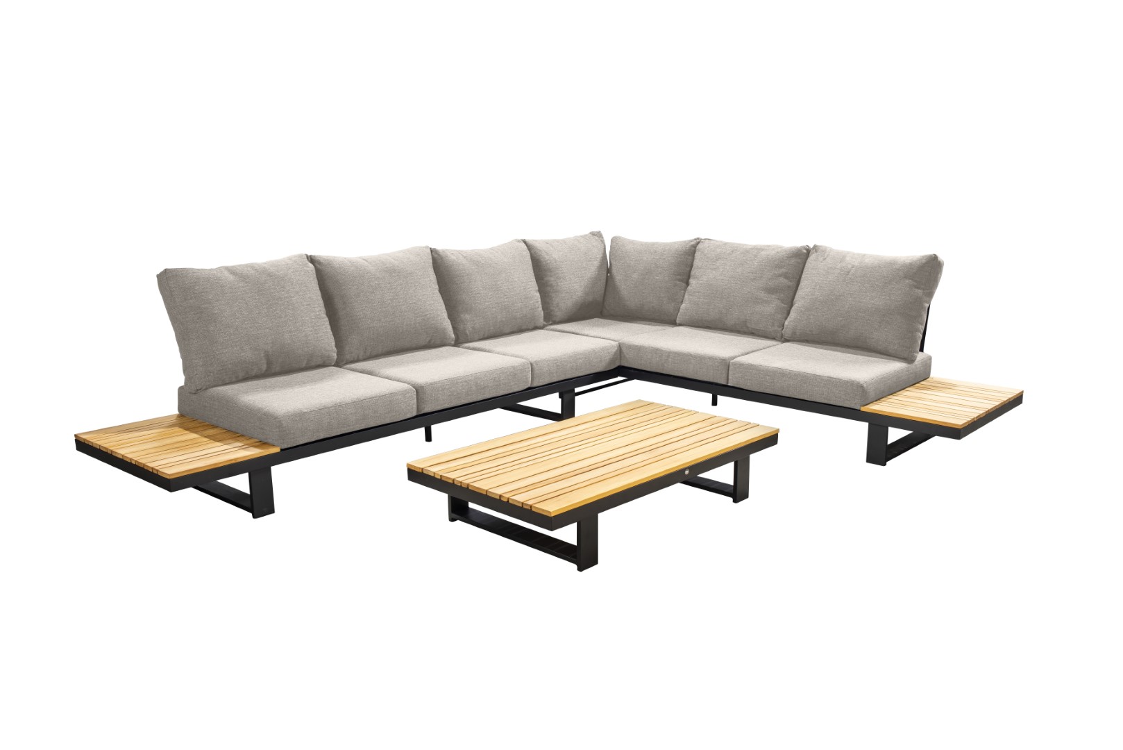 Das Gestell aus pulverbeschichtetem Aluminium sorgt für Stabilität und Langlebigkeit, während die warmen Teakholzdetails dem Ensemble eine natürliche und einladende Note verleihen.