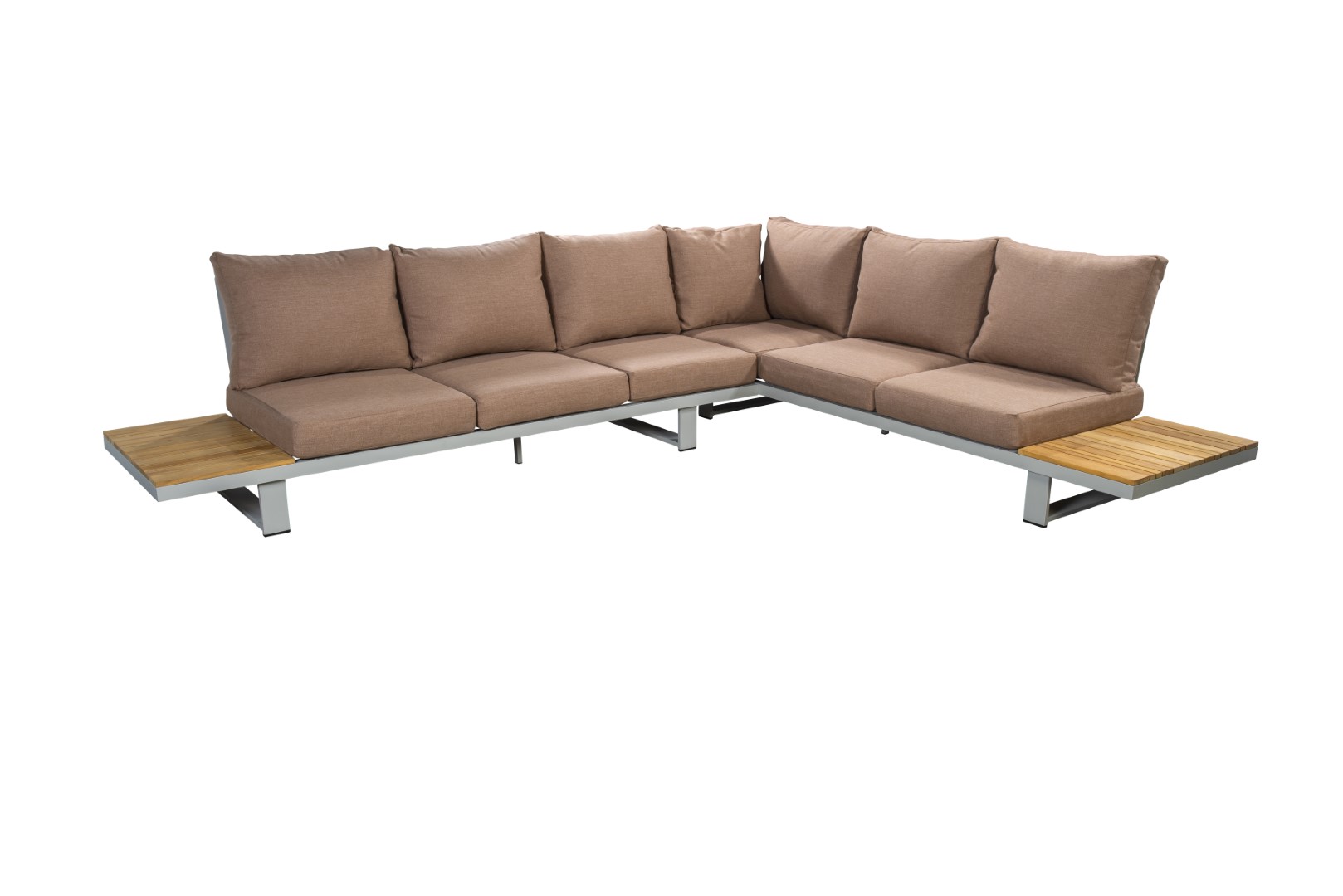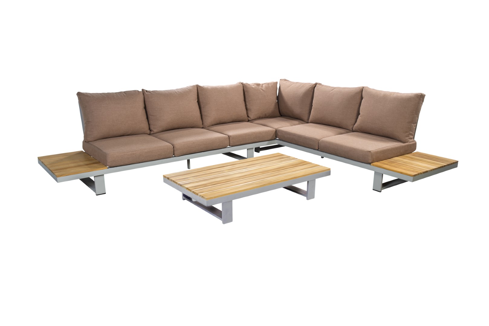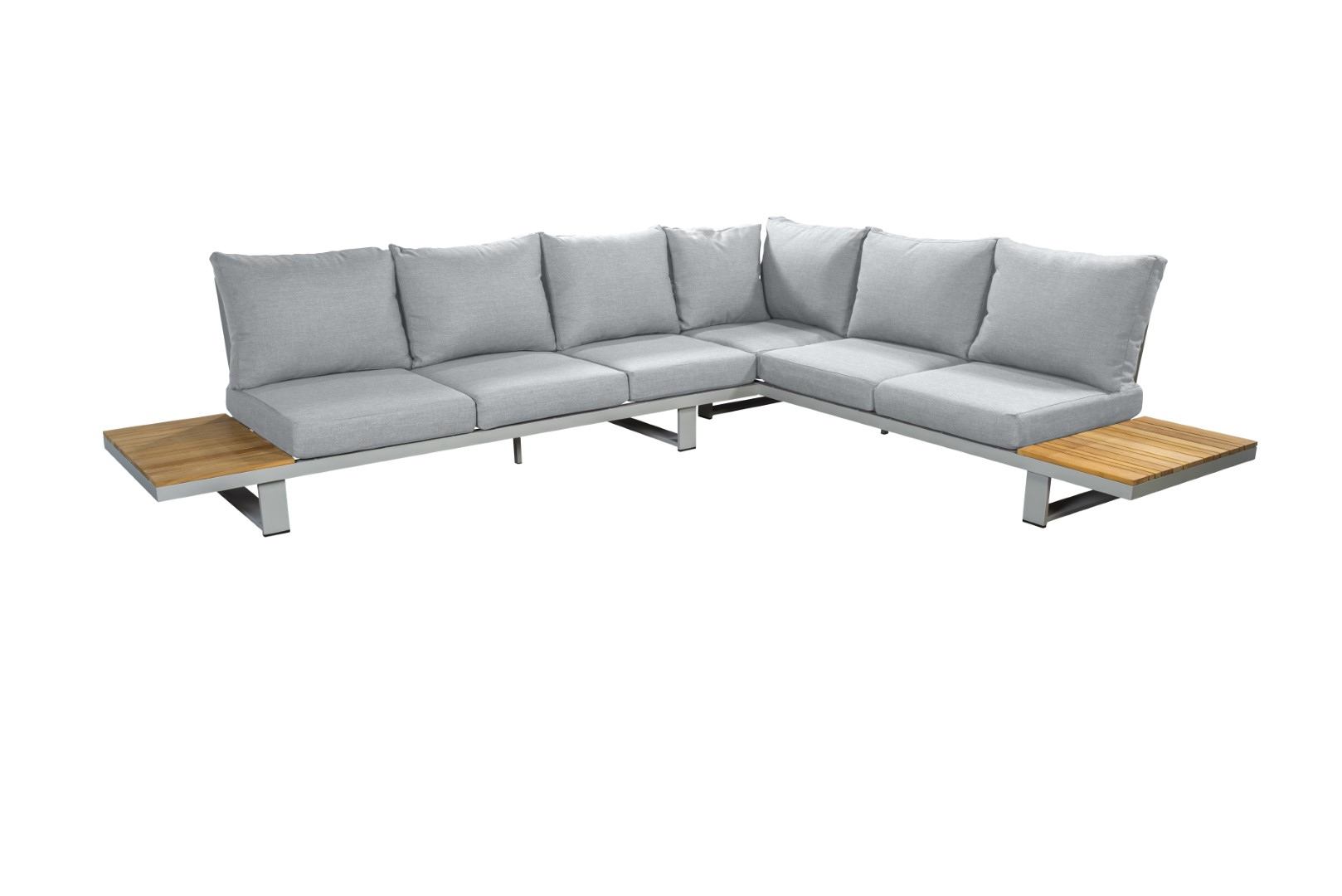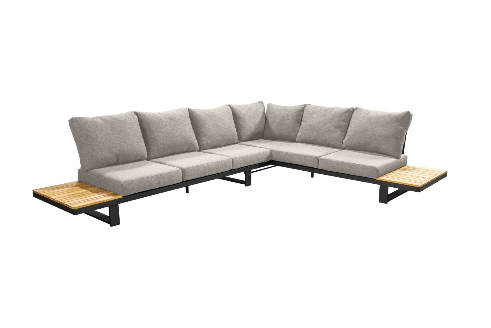 Das Gestell aus pulverbeschichtetem Aluminium sorgt für Stabilität und Langlebigkeit, während die warmen Teakholzdetails dem Ensemble eine natürliche und einladende Note verleihen.